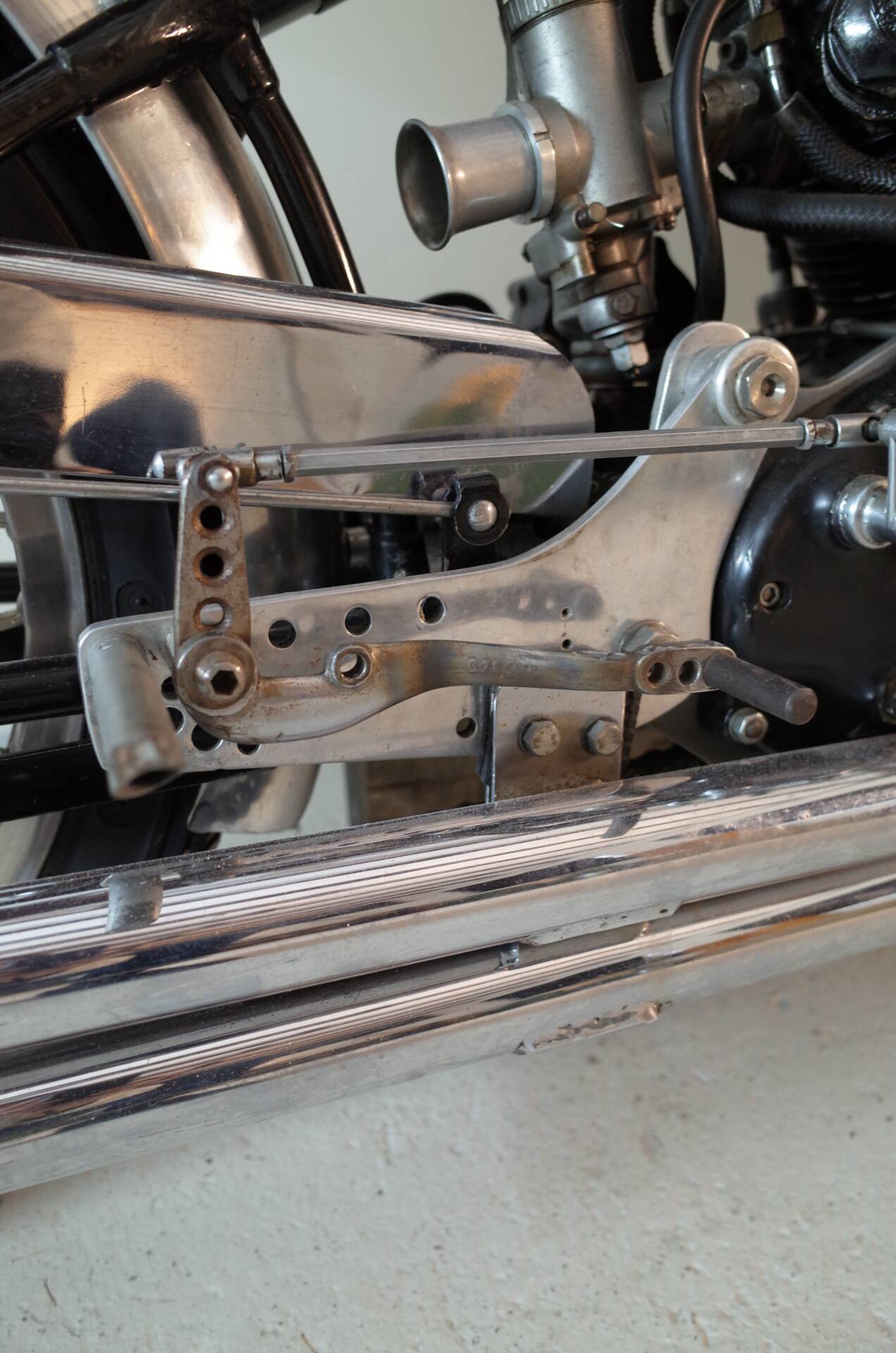In the 2010s the Vincent was restored and rebuild to Black Lightning specification with rare Smiths yellow dial rev counter specific to the Black Lightning, Lucas KVTT Racing Magneto, a racing magneto build exclusively for the Black Lightning model, Amal GP carburettors, massive 2inch exhaust pipes and other goodies. Lightened alloy footrest hanger plates, footrests and gear linkage mechanism and alloy mudguards, are again to Black Lightning specification.