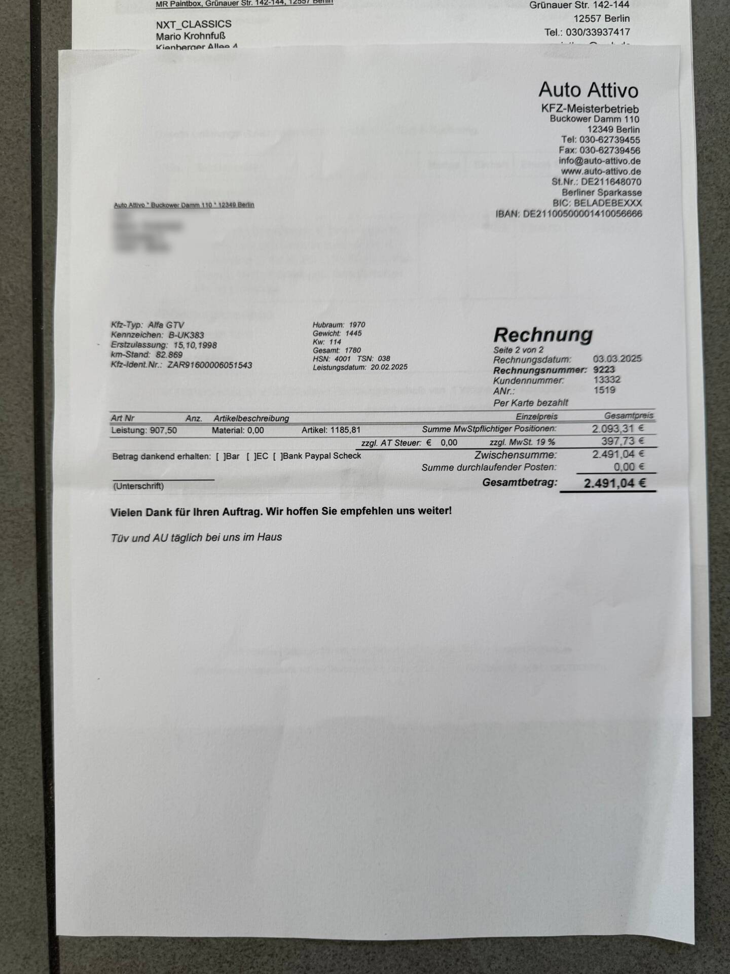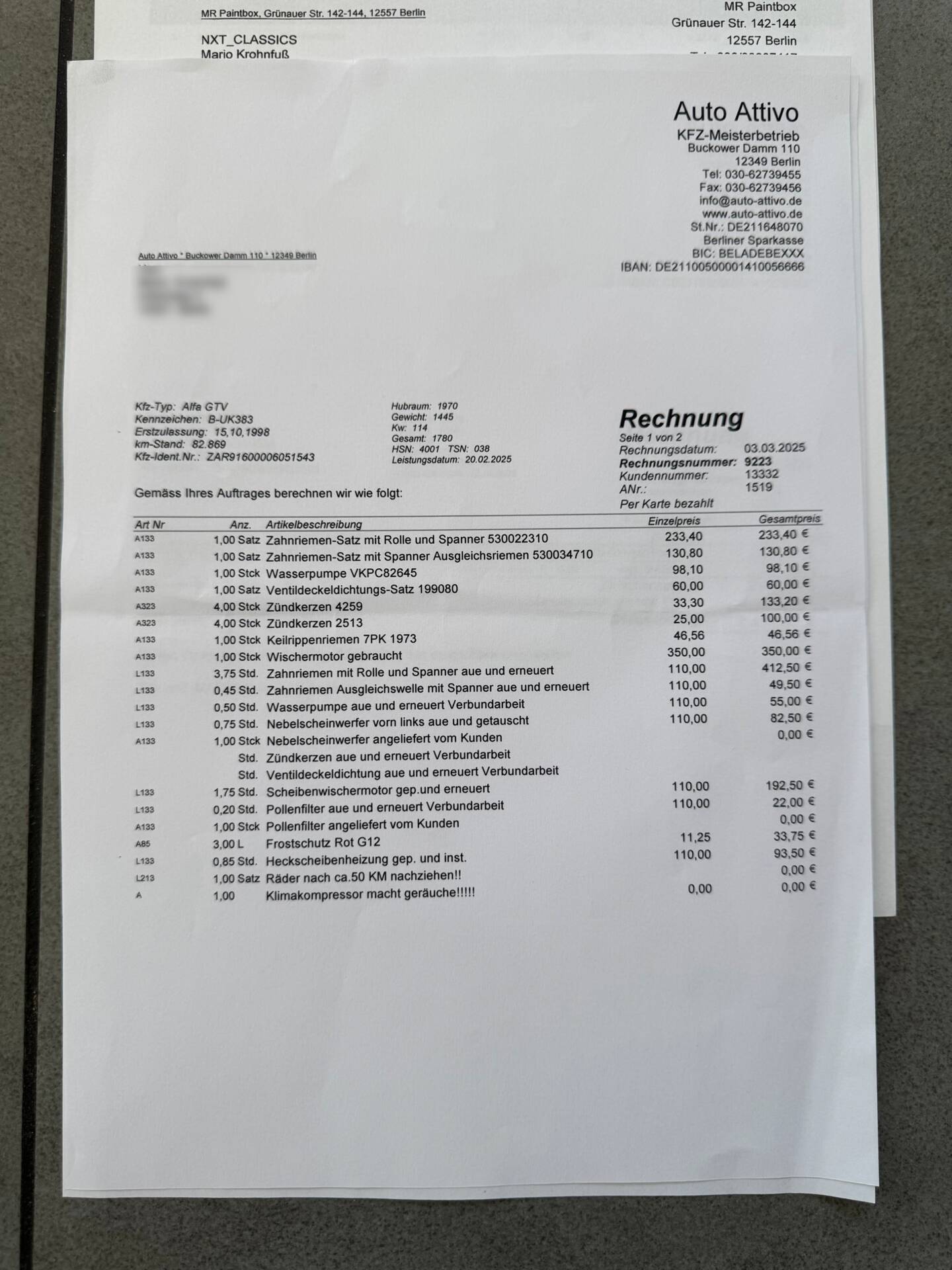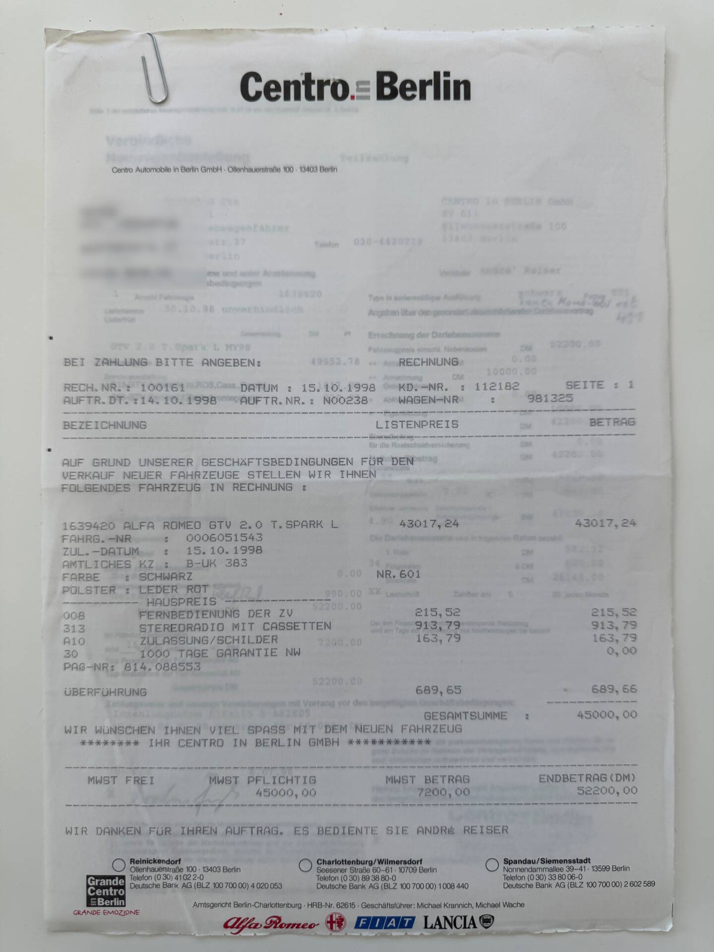 Der Alfa Romeo GTV stammt aus erster Hand und befand sich von Beginn an im Familienbesitz. Übergeben vom Vater an den jetzigen Anbieter, wurde der Wagen offenbar stets sorgfältig gepflegt und nie aus der Hand gegeben. Besonders erwähnenswert: Die originale Kaufrechnung von 1998 ist vorhanden – ein seltenes Dokument, das die Authentizität zusätzlich unterstreicht. Detaillierte Unterlagen oder Nachweise zu Wartungsarbeiten sind dem Anbieter zufolge vorhanden.