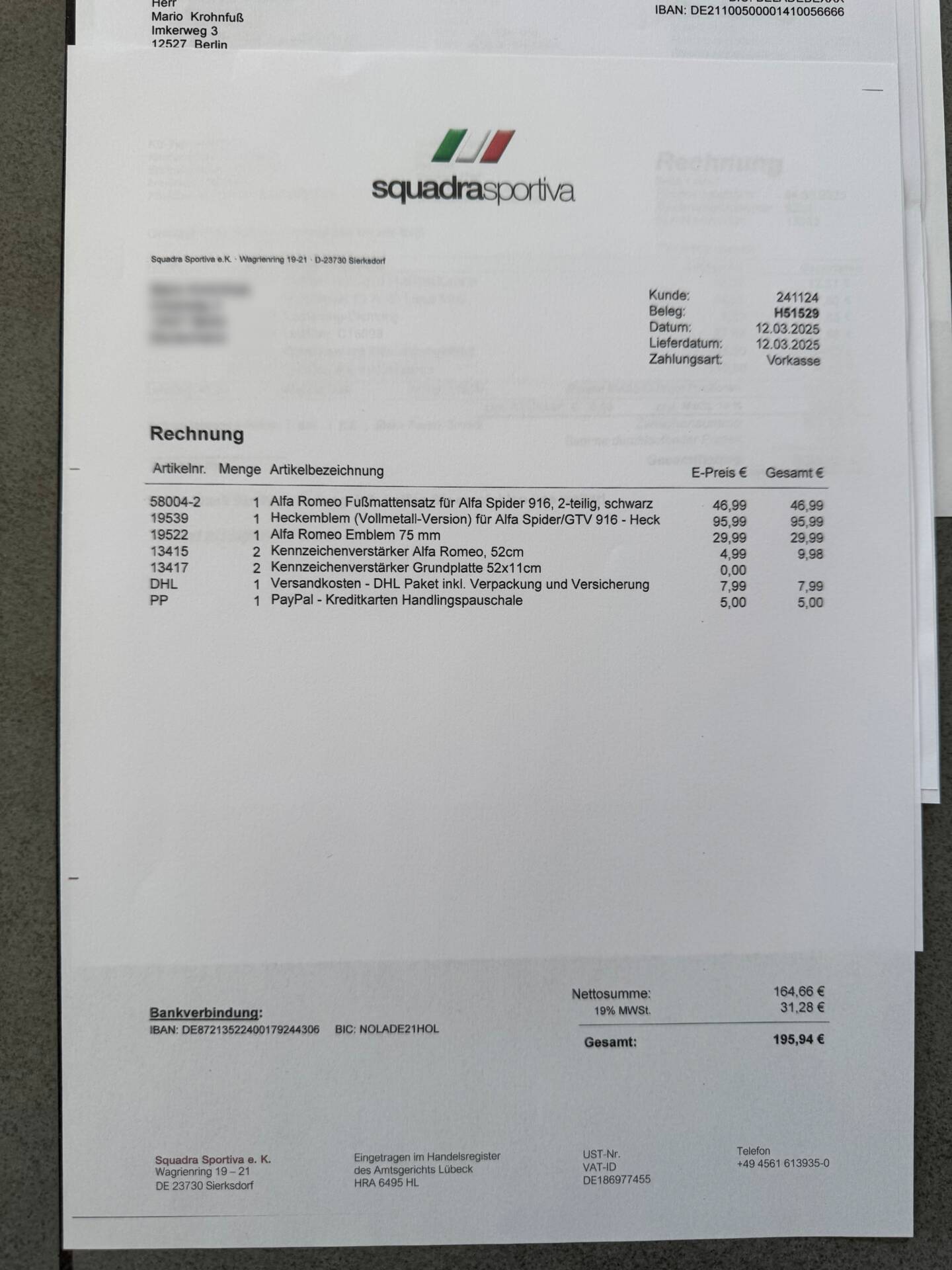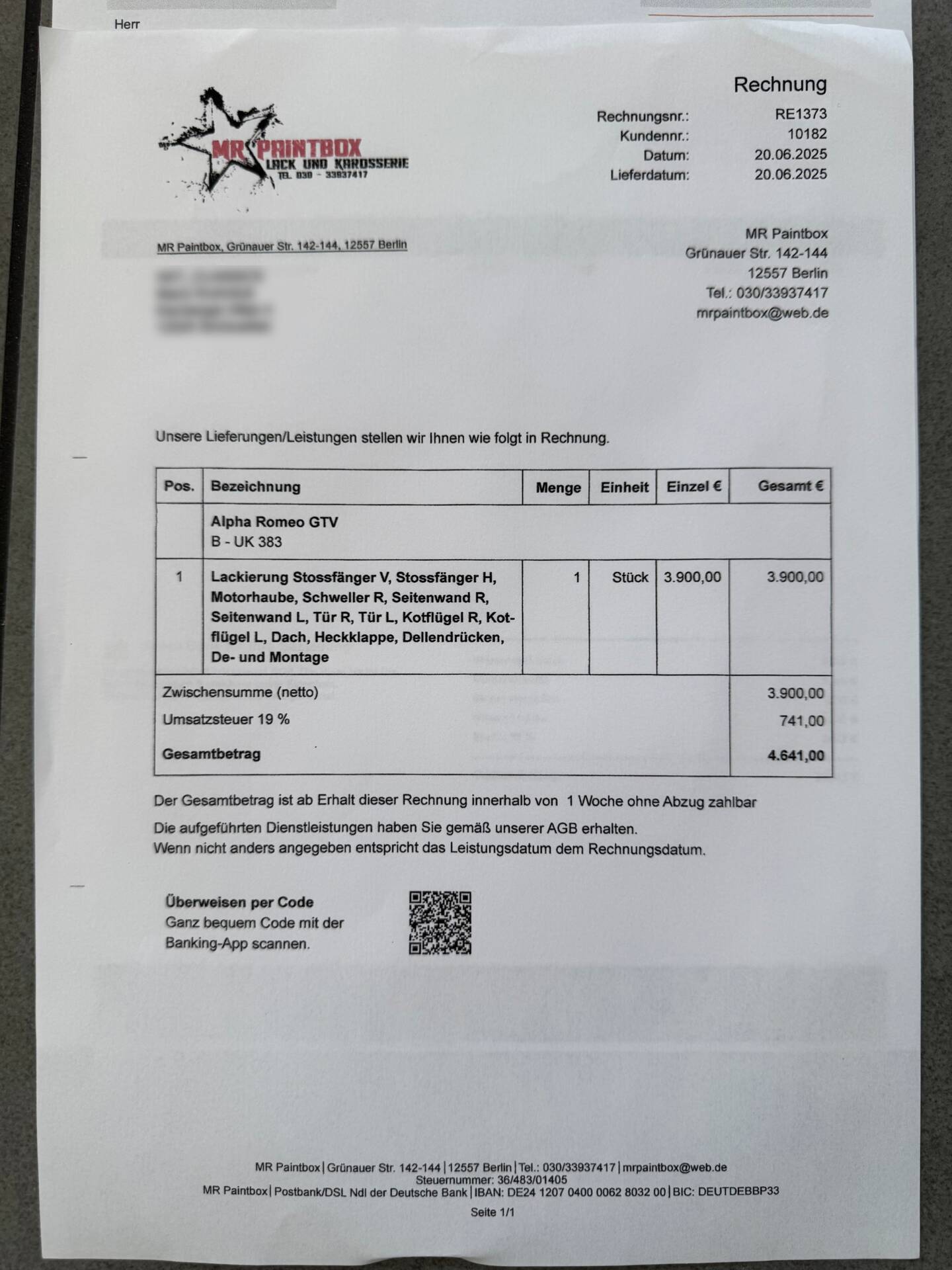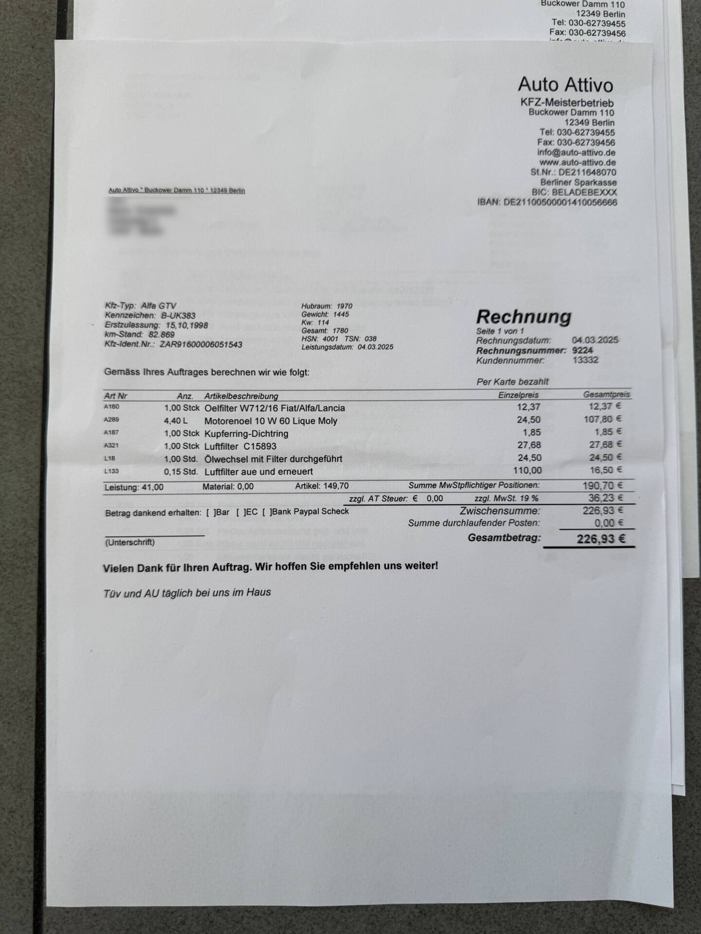Der Alfa Romeo GTV stammt aus erster Hand und befand sich von Beginn an im Familienbesitz. Übergeben vom Vater an den jetzigen Anbieter, wurde der Wagen offenbar stets sorgfältig gepflegt und nie aus der Hand gegeben. Besonders erwähnenswert: Die originale Kaufrechnung von 1998 ist vorhanden – ein seltenes Dokument, das die Authentizität zusätzlich unterstreicht. Detaillierte Unterlagen oder Nachweise zu Wartungsarbeiten sind dem Anbieter zufolge vorhanden.