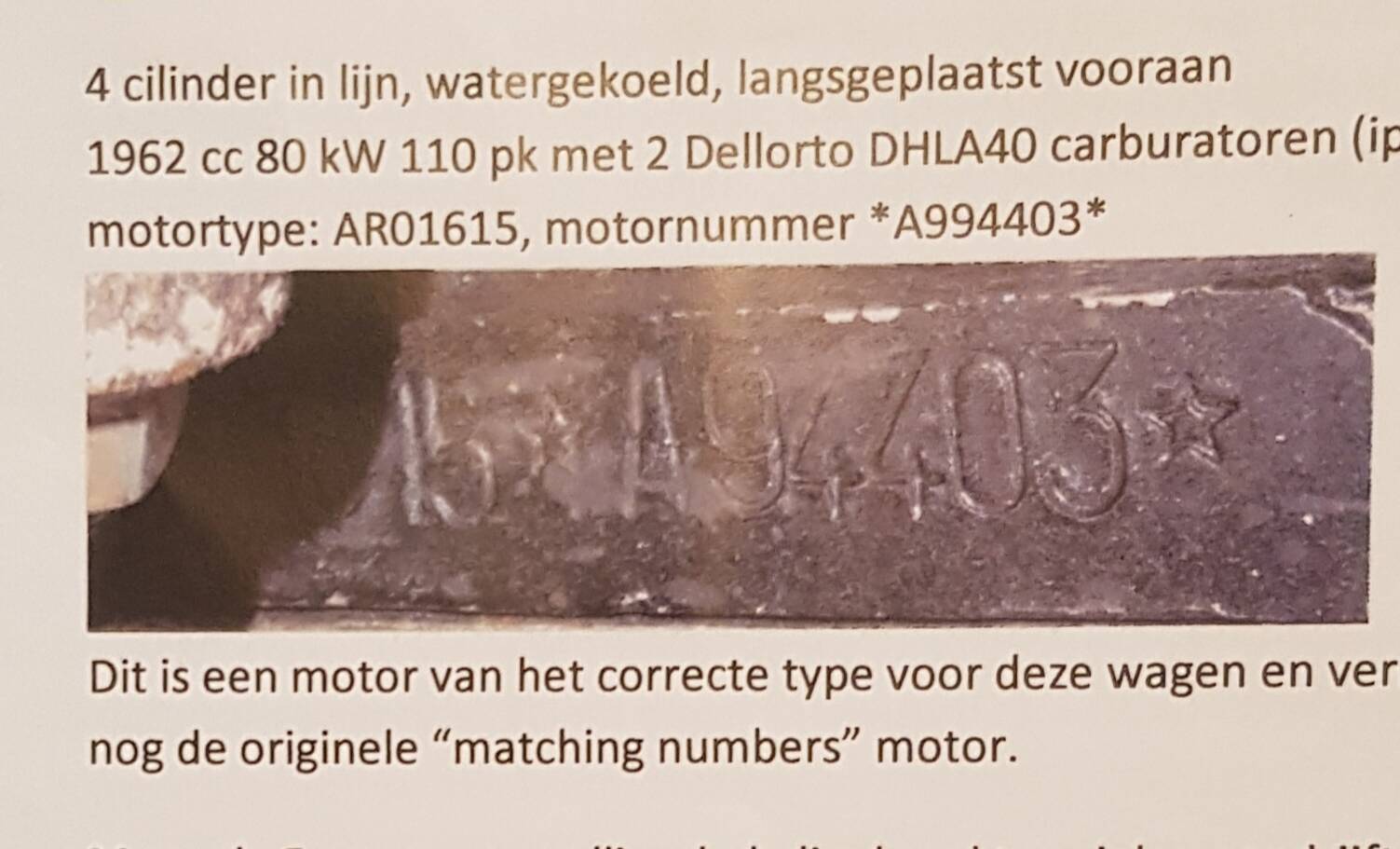 This car has a 4-cylinder in-line, water-cooled, front-mounted 1962 cc 80 kW 110 hp engine with 2 Dellorto DHLA40 carburetors (instead of Spica injection) engine type: ARO1615. The engine still has the original matching number A994403.