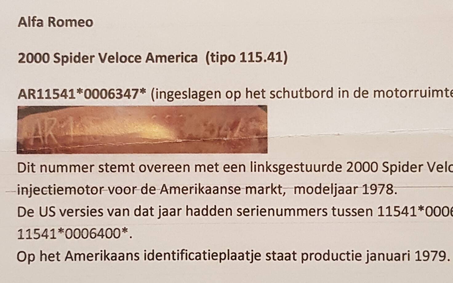 (stamped on the bulkhead in the engine compartment). This number corresponds to a left-hand drive 2000 Spider Veloce with fuel injection engine for the American market, model year 1978. The US versions of that year had serial numbers between 115410006001 and 115410006400. The American identification plate states production January 1979.