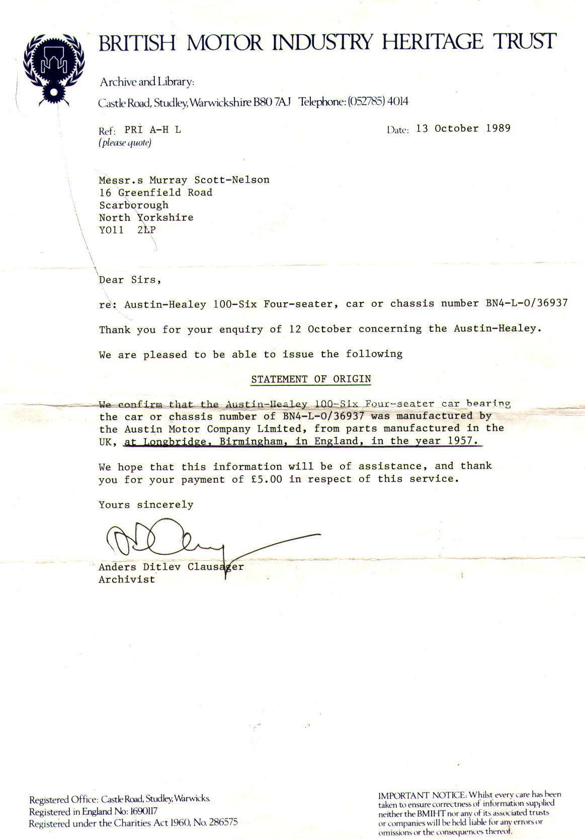 Originally sold new in the United States, this Austin Healey enjoys an international history that further enhances its appeal. In the late 1980s it returned to England, where the owner at the time, Murray Scott Nelson, resident in Scarborough, obtained the British Motor Industry Heritage Certificate.