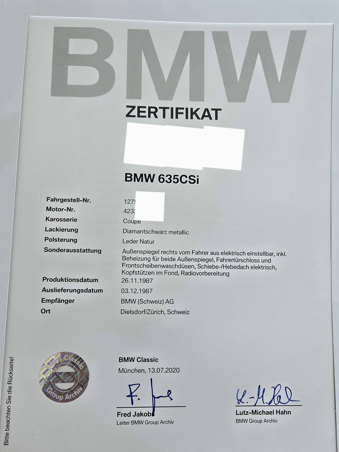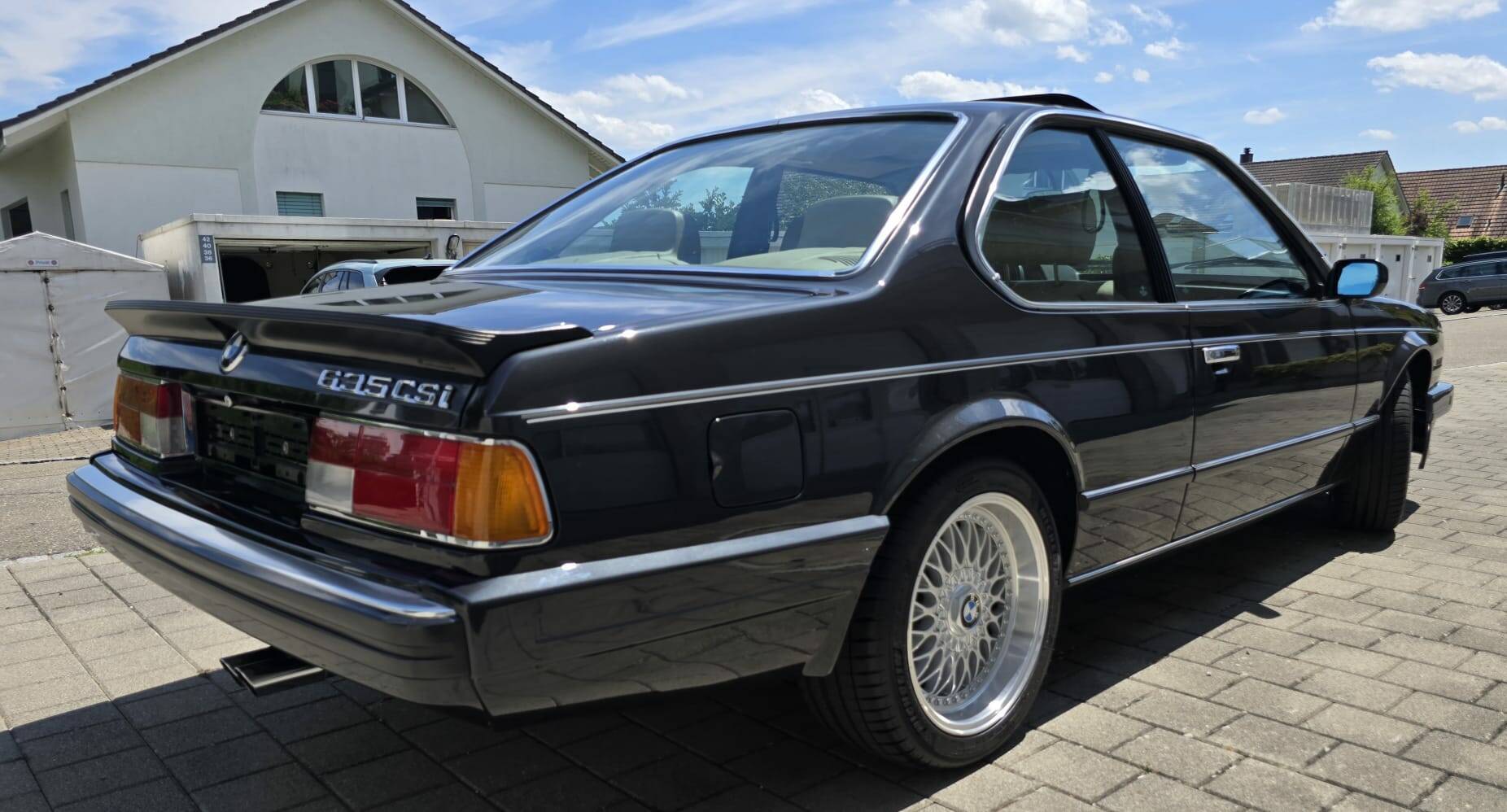 Black metallic BMW 635CSi, manufactured late 1987, first registered in March 1988, beige leather seats, power steering, power windows, power sunroof, registered in Switzerland as a Veteran car