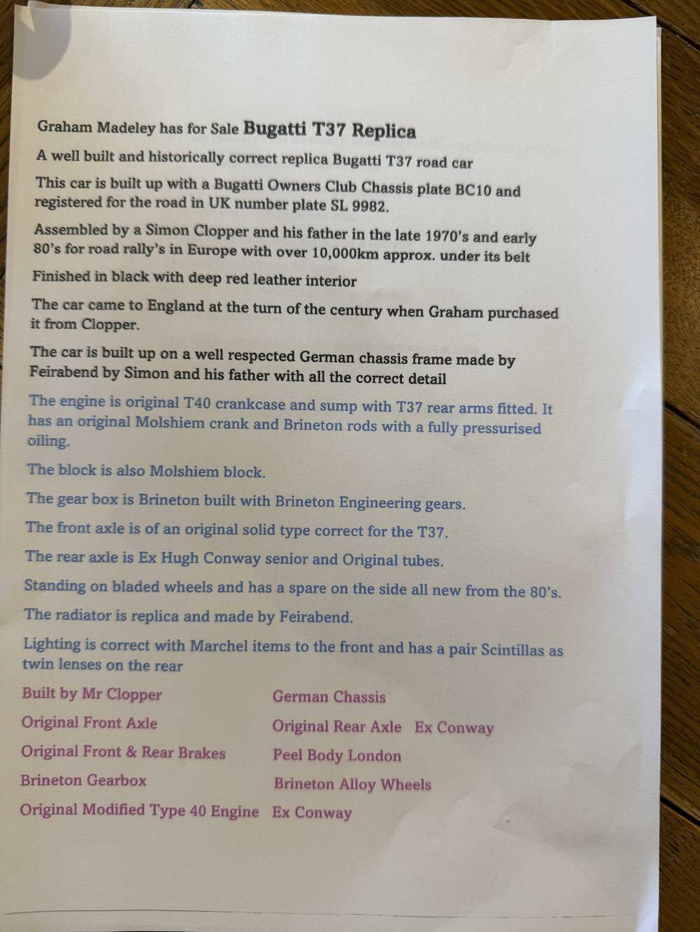 A beautifully built up car with great attention to detail. This car was constructed in the 1970's by a Simon Clopper for european road rallies. It has three original of the 5 important components. This car was the personal car of the proprietors of the Bugatti Specialists Brineton engineering well known for remanufacturing assorted Bugatti parts. The car is road legal & comes with the all important UK V5c Document describing it as being of 1929 origin built from parts some or all of which were not new. The car is currently lady owned.