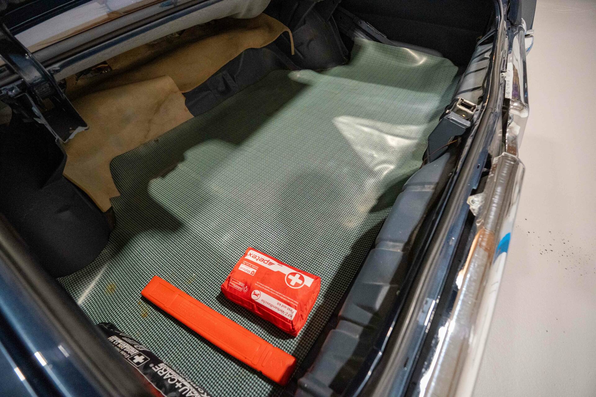 Die Karosserie präsentiert sich weitgehend original, lackiert in elegantem Blau Metallic. Die Lackierung zeigt altersbedingte Spuren, kann jedoch für einen guten optischen Zustand überarbeitet werden. Das hydraulische Verdeck ist neuwertig und funktionstüchtig.