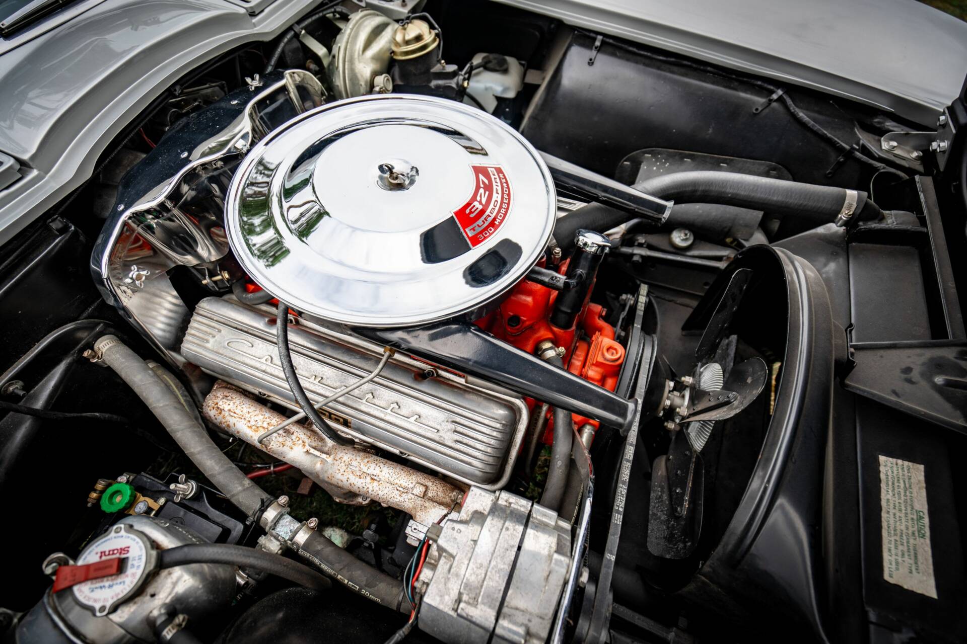 Mécanique : Le V8 de cette Corvette se distingue par son excellent état visuel et témoigne d'une bonne étanchéité, confirmée par un essai statique et un contrôle au sol. Le compartiment moteur est également en très bon état. Le système de freinage de cette Chevrolet Corvette C2 Split Window est équipé de freins à tambours sur les quatre roues, qui se présentent en très bon état et offrent une bonne étanchéité. La transmission fonctionne également très bien. À noter que cet exemplaire dispose de la direction assistée.
