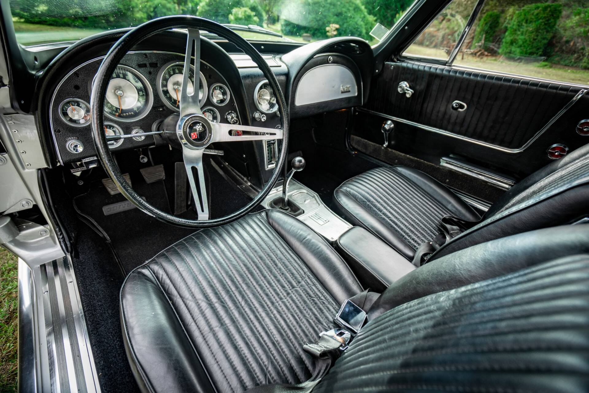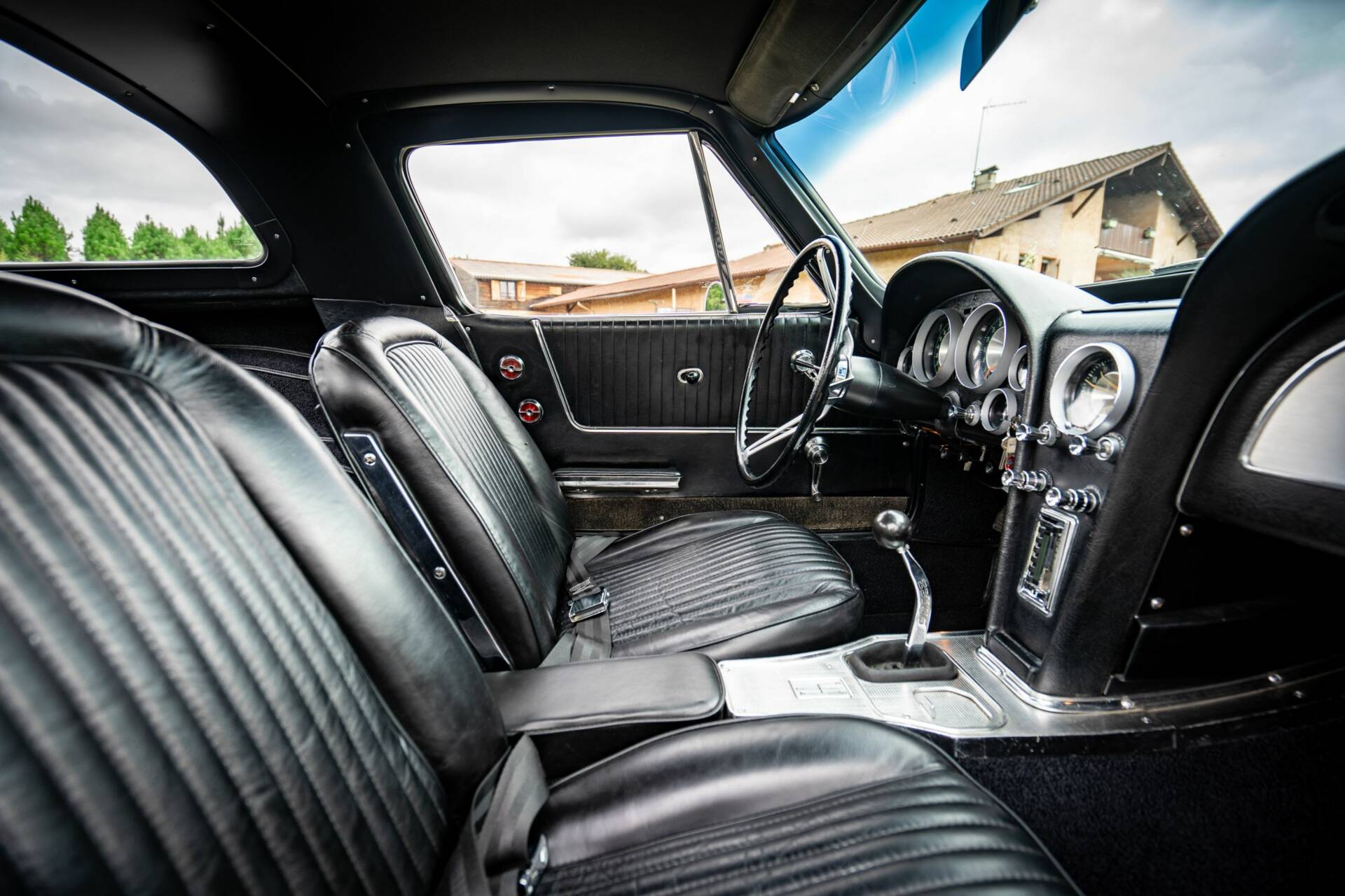 Extérieur : La carrosserie en composite de cette Chevrolet Corvette C2 Split Window est en très bon état de présentation, témoignant du soin apporté lors de sa restauration. La peinture extérieure dans sa teinte d'origine 941A Gris Sebring est bien tendue, sans signe de ternissement, offrant un bel éclat. Les joints et les chromes extérieurs sont également en très bon état, sans traces d'usure majeures, tout comme les optiques de phare rétractables, les jantes et les rétroviseurs. Tous les ouvrants du véhicule (portes, capot, coffre) fonctionnent parfaitement.