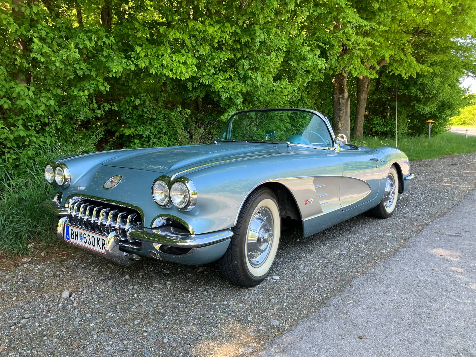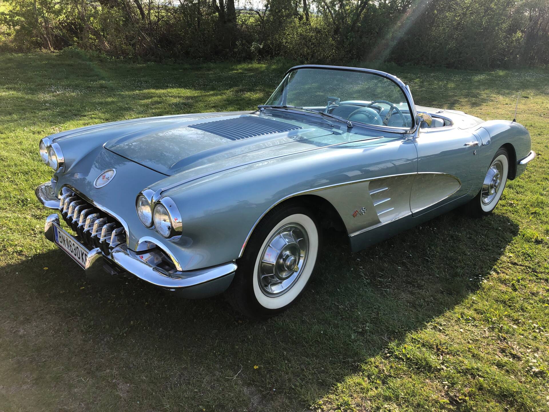 Wunderschöne, sehr gepflegte Corvette C1 mit den besonderen 58er Features (Kühlrippen-Attrappen auf der Motorhaube und 2 Chromleisten am Kofferraumdeckel) in stimmiger Farbkombination - Silber Blau Metallic mit silbernen Coves und die Innentapezierung in Wagenfarbe - ausgestattet.