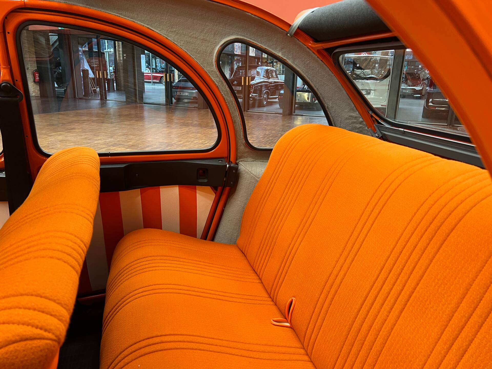 Diese „Spot-Ente“ wurde am 17.08.1976 in Bogani bei Mailand zugelassen. Die seitlichen Blinkleuchten vorn und die durchgehende Sitzbank vorn deuten darauf hin. Über die Historie ist leider nicht viel bekannt. 2024 gehörte das Auto jemandem in Bergamo und dieser ließ es komplett neu aufbauen. Auf der Oldtimermesse in Bologna 2025 wurde die Ente, die zu diesem Zeitpunkt noch nicht ganz fertig war, angeboten. Ein Freund unseres Hauses kaufte das Auto und überließ es uns zur Fertigstellung und anschließenden Vermarktung. Wir haben den Wagen dann untersucht und die bis dahin noch fehlenden Teile wie Sonnenblenden, Innenleuchte, Gummimatten, Radkappen und Scheibenwischer angebaut. Die Spot-Ente steht jetzt da wie aus dem Citroën Showroom. Wir haben lange nach einer guten Spot gesucht, und jetzt, wo das gute Stück dasteht, können wir nicht verstehen, warum nur 1.800 Stück gebaut wurden. Wir können uns kaum ein Auto vorstellen, welches mehr Lebensfreude ausstrahlt. Wenn man bei Sonnenschein einsteigt, ist es, als würde man in einen Malkasten einsteigen, und man ist spontan guter Laune. Dieses Auto ist gewissermaßen das Gegenstück zu den heute allzu oft fad, langweilig und beliebig wirkenden Neuwagen. Keine 500 PS und elektronische Gimmicks vermögen heute auch nur annähernd diese Lebensfreude zu vermitteln. Joie de Vivre …