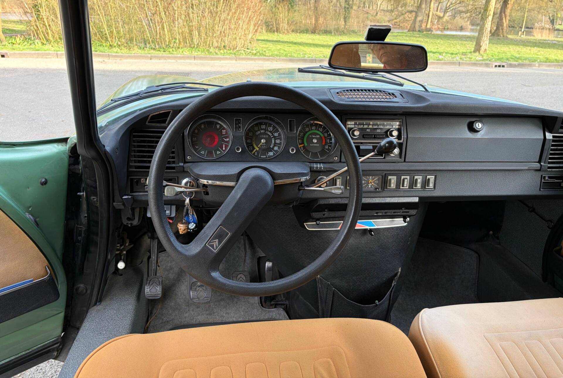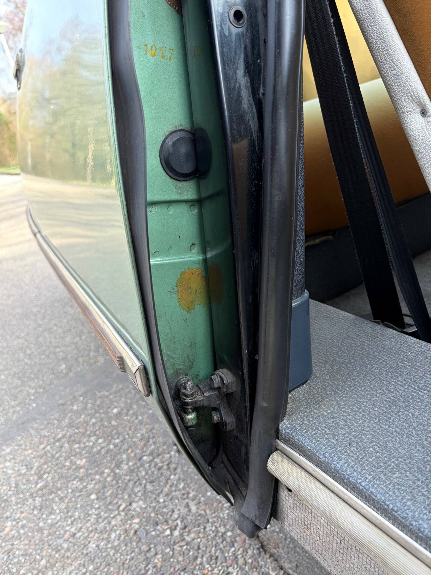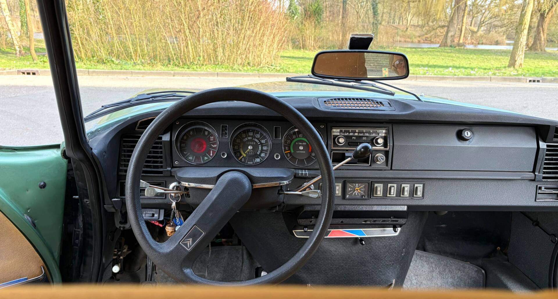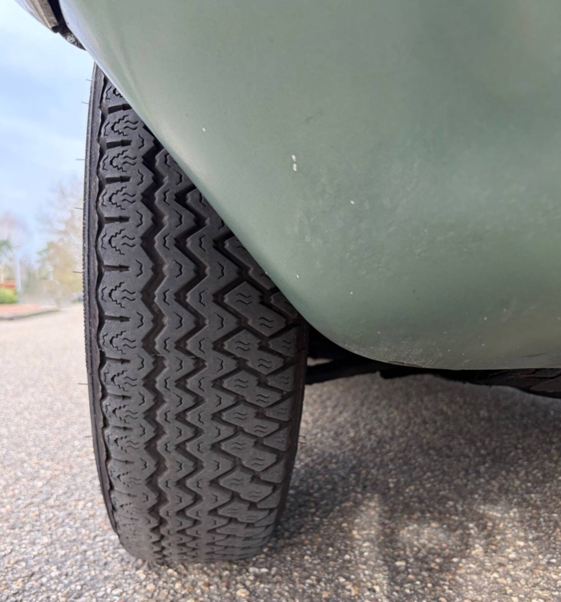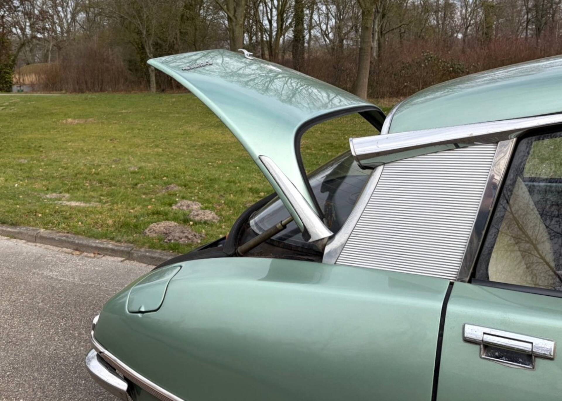 The Super 5 was delivered new in the colour ‘Vert Argente AC 527’ and the body has been repainted in the original metallic colour in the past. The quality of the paintwork is fine and there are some signs of wear and paint flaws. The body is otherwise in good condition. Many stainless steel and chrome parts are still original and have slight signs of wear. The well-known chrome wheel trims have been renewed and spare ones are available. Upon arrival in the Netherlands, a complete anti-rust treatment and major maintenance were carried out. In 2006, the demanding owner had a Dinitrol treatment carried out by the best Dinitrol specialist in the Netherlands: Gosliga from Leeuwarden. The car is therefore excellently protected. The doors and bonnet close neatly and the seams are also in perfect condition.