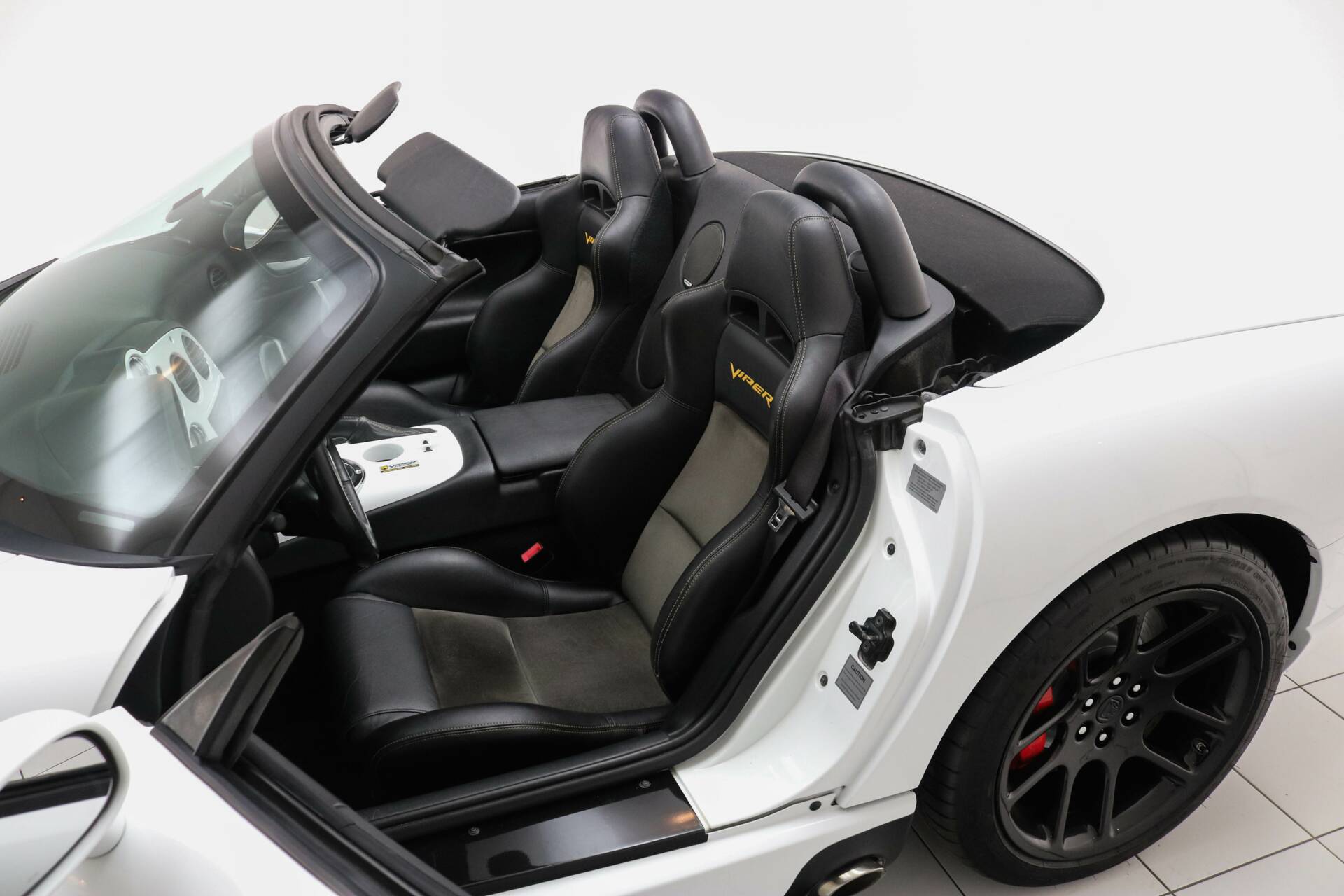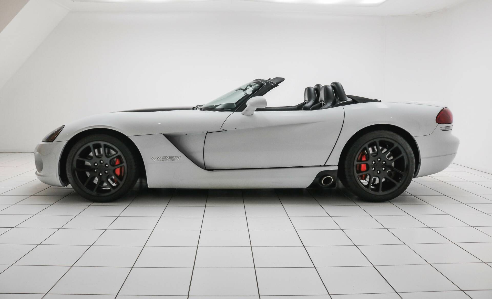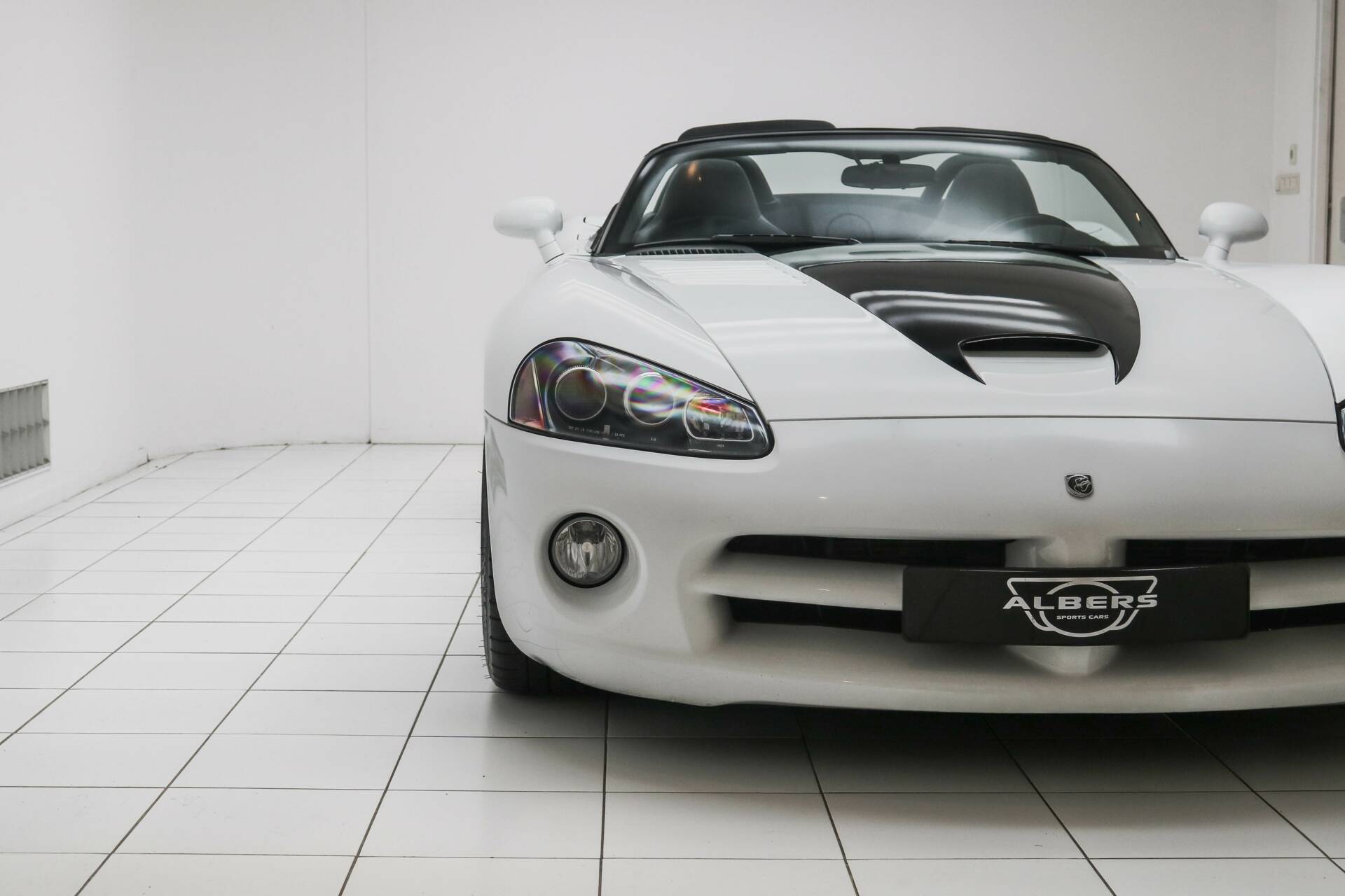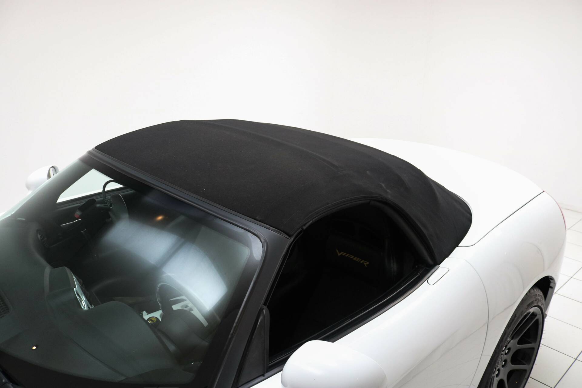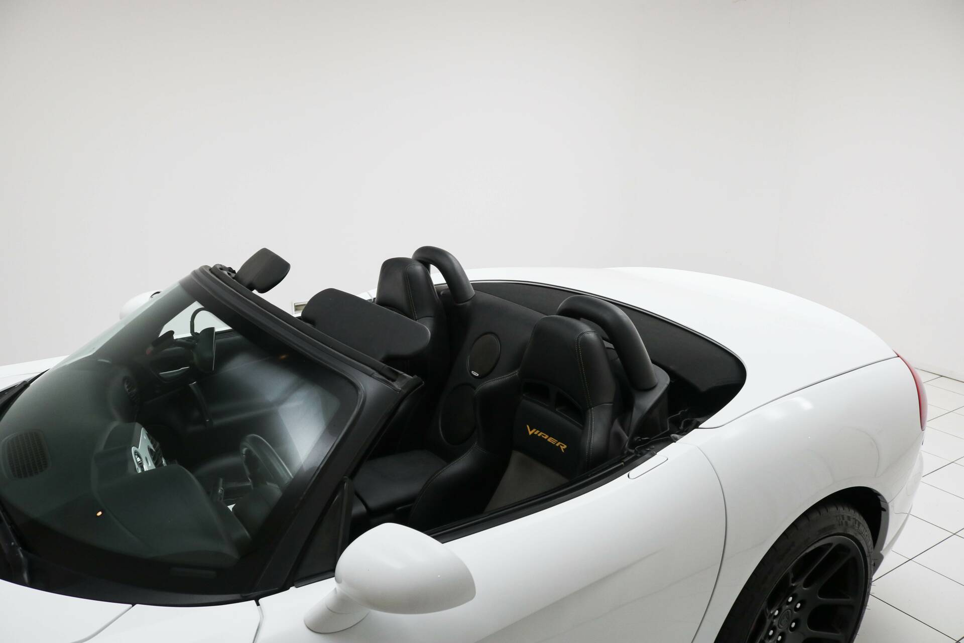 El exterior de este Dodge está acabado en Viper Bright White. Está montado sobre las llantas originales de aleación negras de Viper, que se encuentran en buen estado. El coche también cuenta con un techo blando negro y los característicos side-pipes.