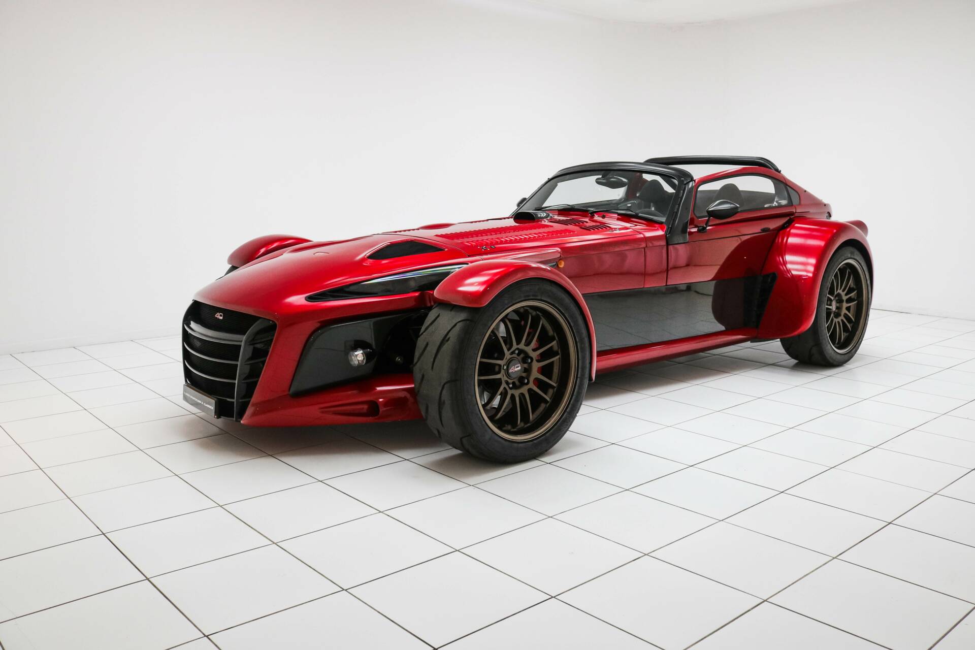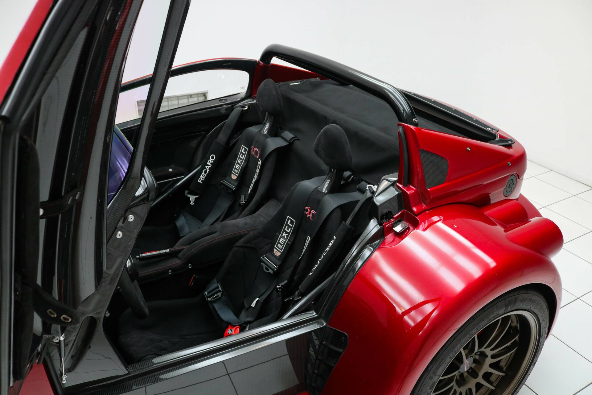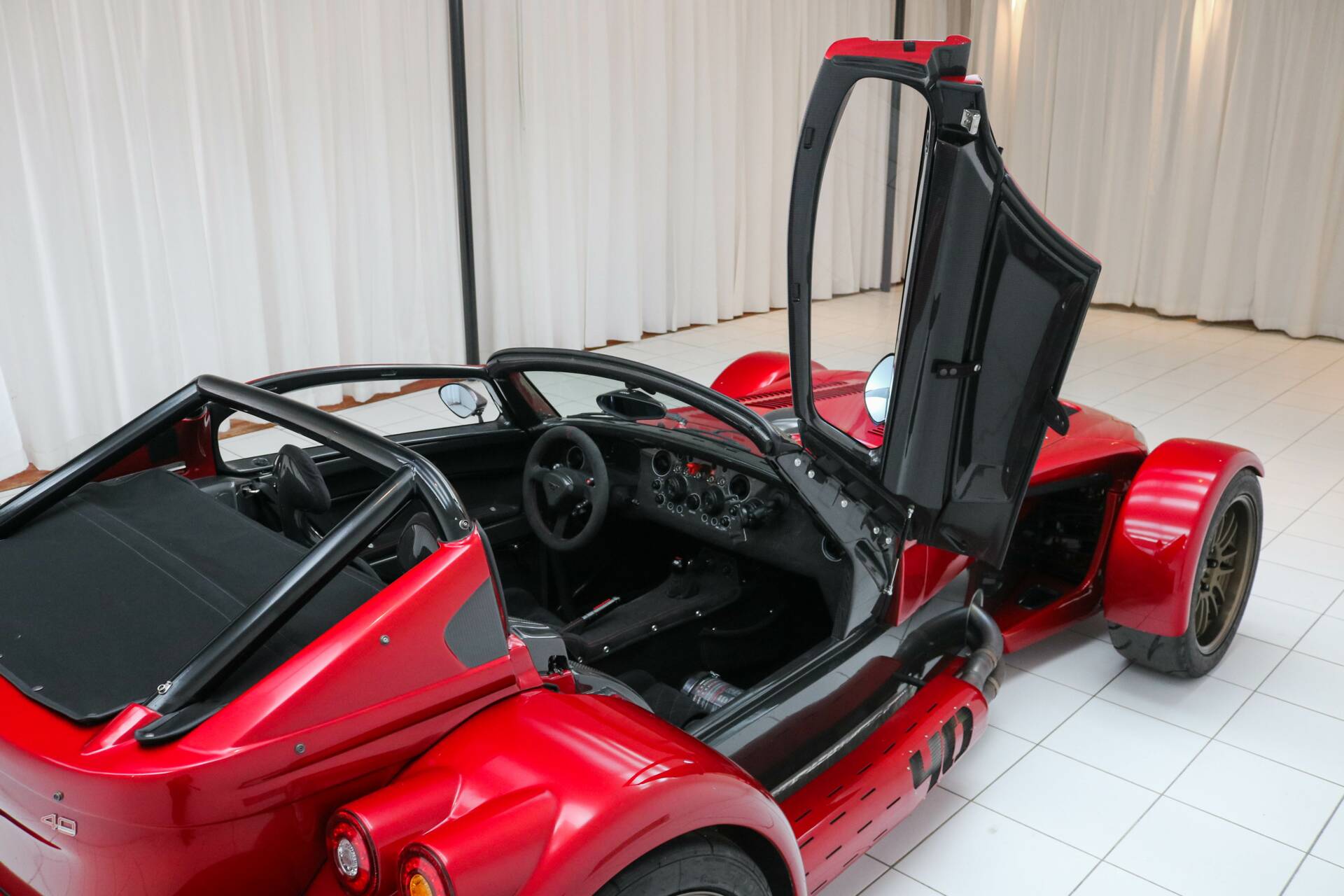 El exterior de este Donkervoort está acabado en el llamativo color Ferrari Rosso Magma. Este GTO monta llantas de aleación ligera de 18 y 19 pulgadas en acabado bronce, equipadas con neumáticos semi-slick Nankang. También cuenta con el paquete exterior Black Pack. Los marcos de las ventanas y el difusor están realizados en carbono visto, y el vehículo dispone del paquete exterior de carbono. Además, incorpora refrigeración del diferencial para un rendimiento óptimo.