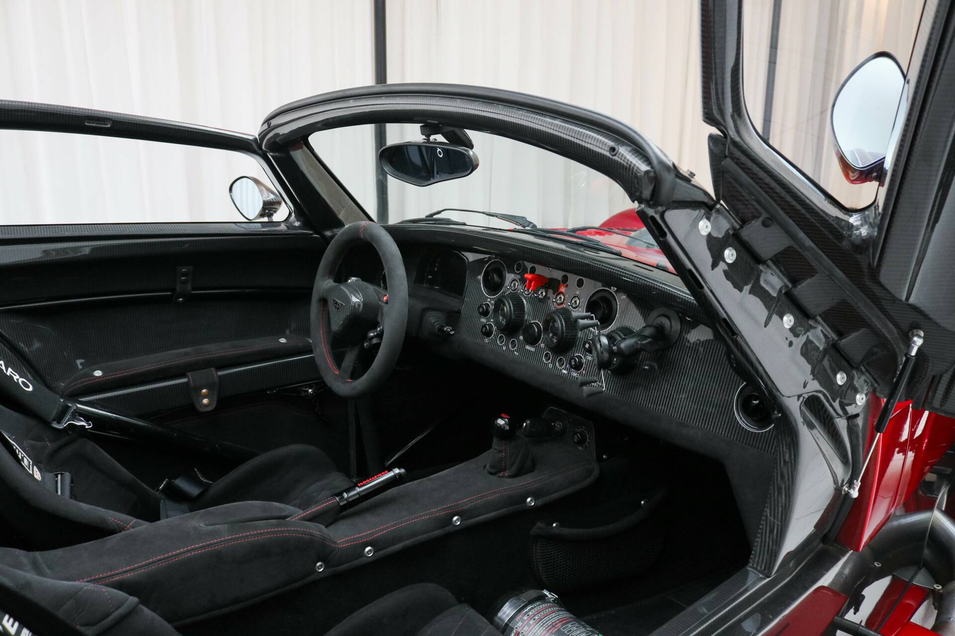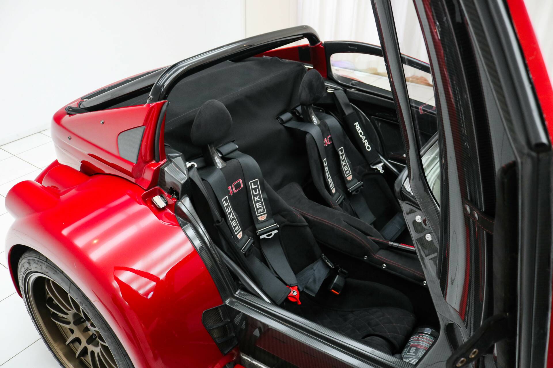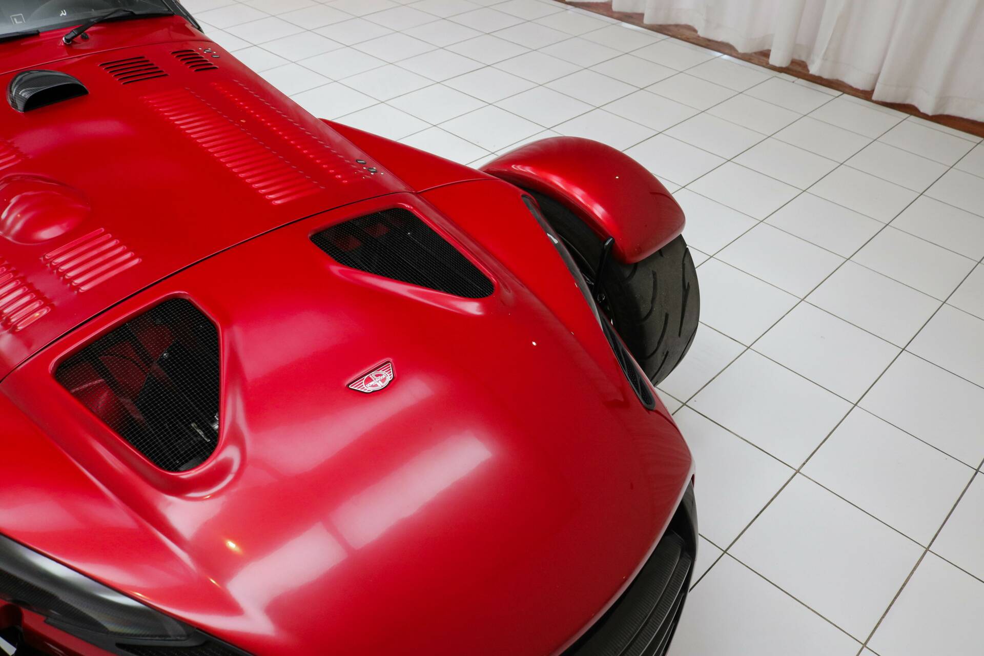 El exterior de este Donkervoort está acabado en el llamativo color Ferrari Rosso Magma. Este GTO monta llantas de aleación ligera de 18 y 19 pulgadas en acabado bronce, equipadas con neumáticos semi-slick Nankang. También cuenta con el paquete exterior Black Pack. Los marcos de las ventanas y el difusor están realizados en carbono visto, y el vehículo dispone del paquete exterior de carbono. Además, incorpora refrigeración del diferencial para un rendimiento óptimo.