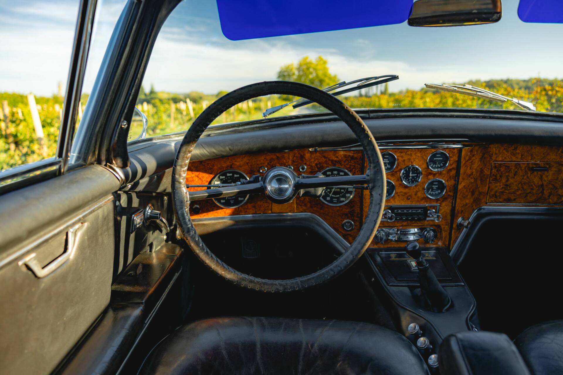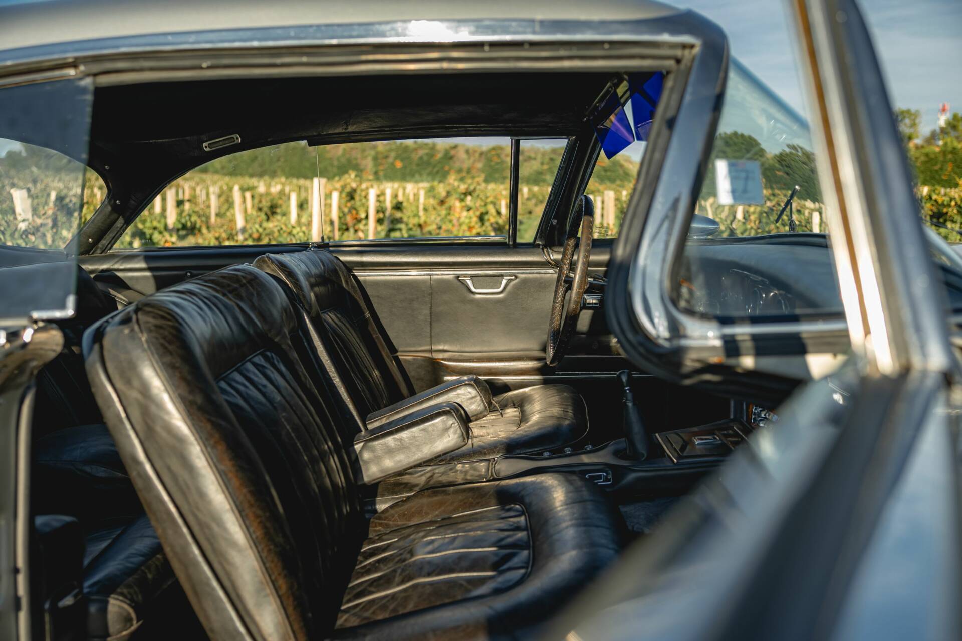 La carrosserie est en bonne condition. Elle a été restaurée par un professionnel il y a plusieurs années. La peinture présente un brillant uniforme et est bien tendue. Nous pouvons retrouver tout de même de légers défauts autour de l’auto. Le pare-brise “Glacetex” a été remplacé. Les jantes “Robergel” et les optiques “Marchal” sont en très bon état. Nous ne relevons pas de trace de choc important ou de corrosion perforante.
