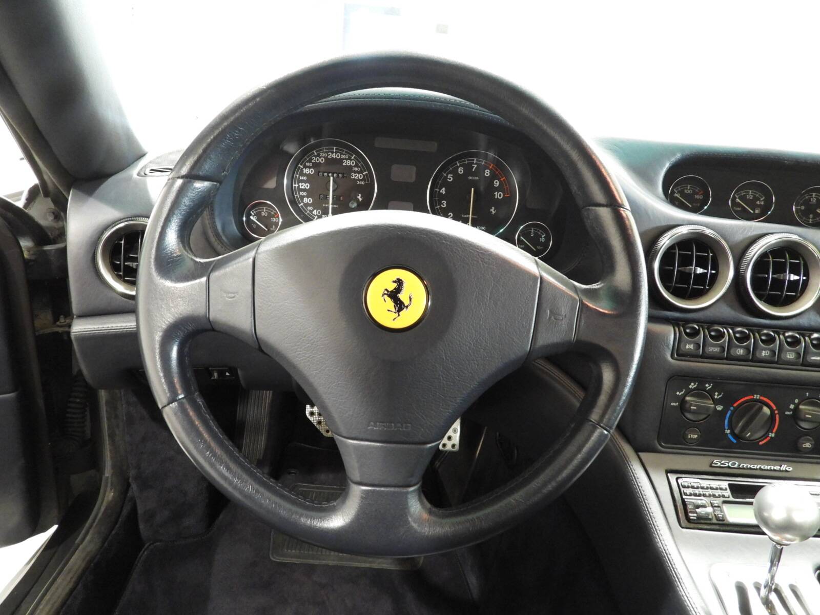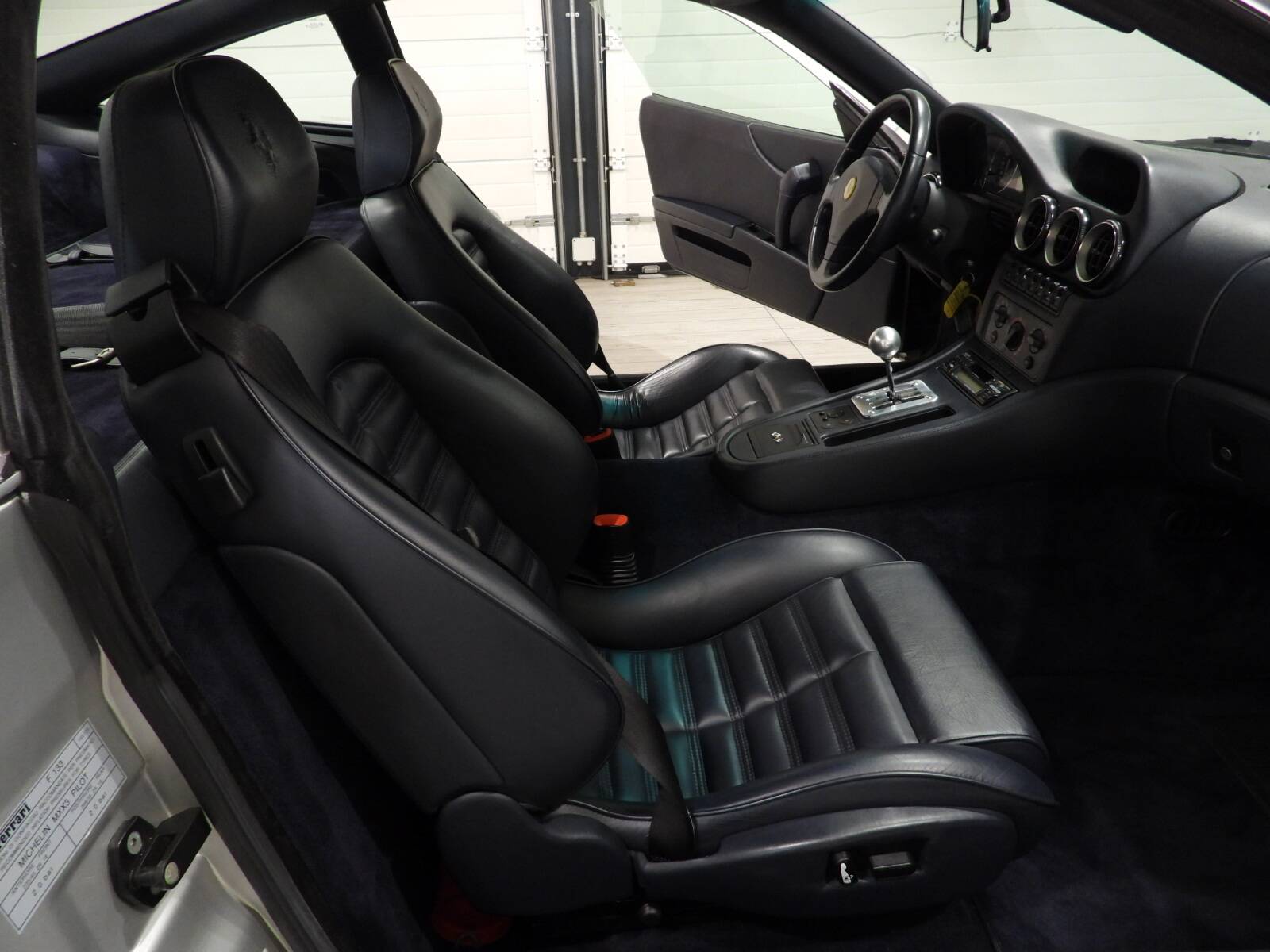 Electrically adjustable seats, panels and dashboard in full dark blue connoly leather, Ferrari three-spoke steering wheel with leather crown, Blue wool carpet on the floor, Aluminium sports pedals, Automatic climate control, Stereo 7 Ferrari XR - F21RDS cassette AM/FM radio original from the era with CD changer, Body-coloured electrically adjustable double exterior mirror, Electric windows, White fog lights, Ferrari 5-spoke alloy wheels with black calipers with Michelin pilot super sport tyres front 255/40 ZR18 and rear 295/35 ZR18