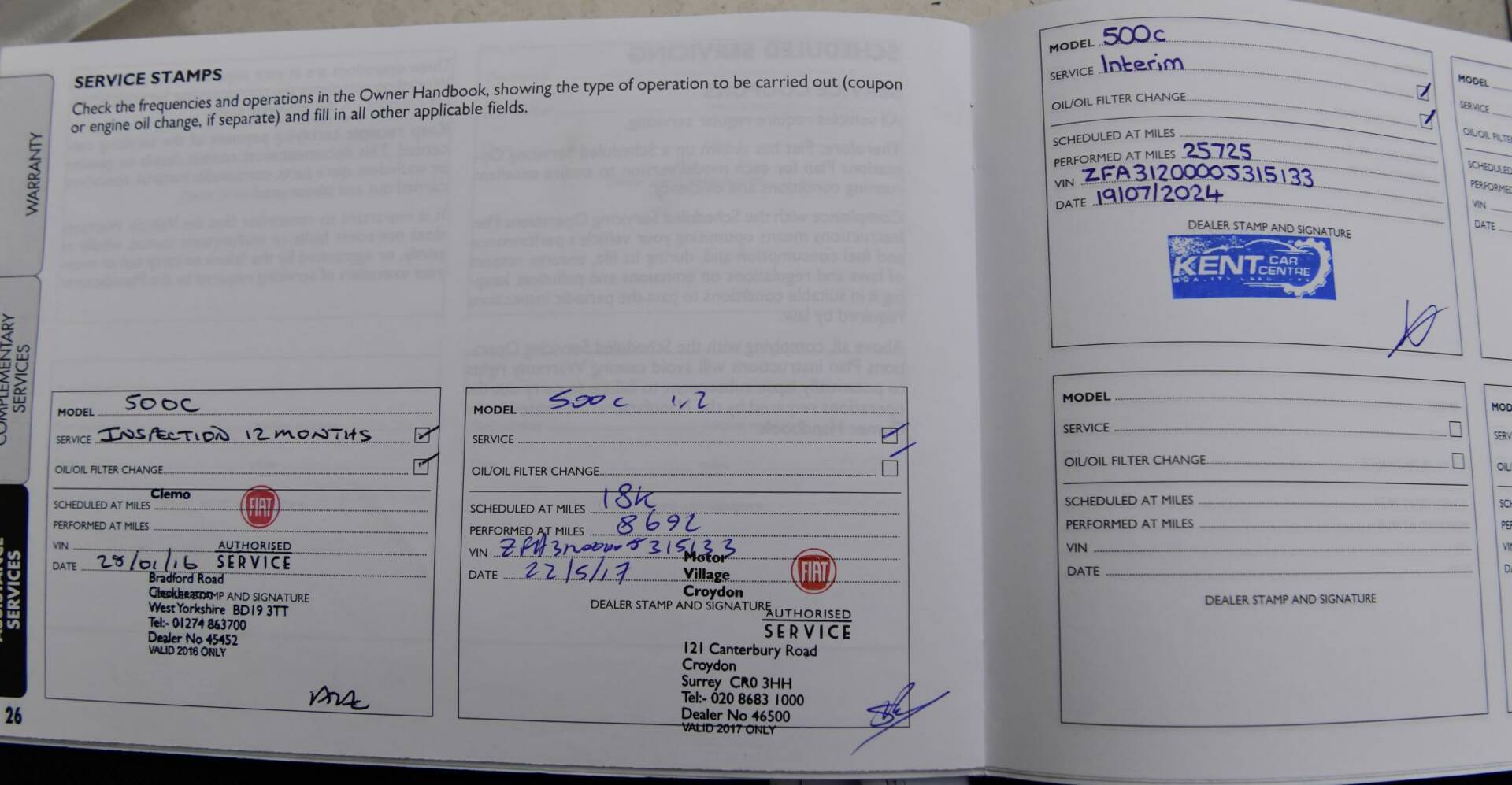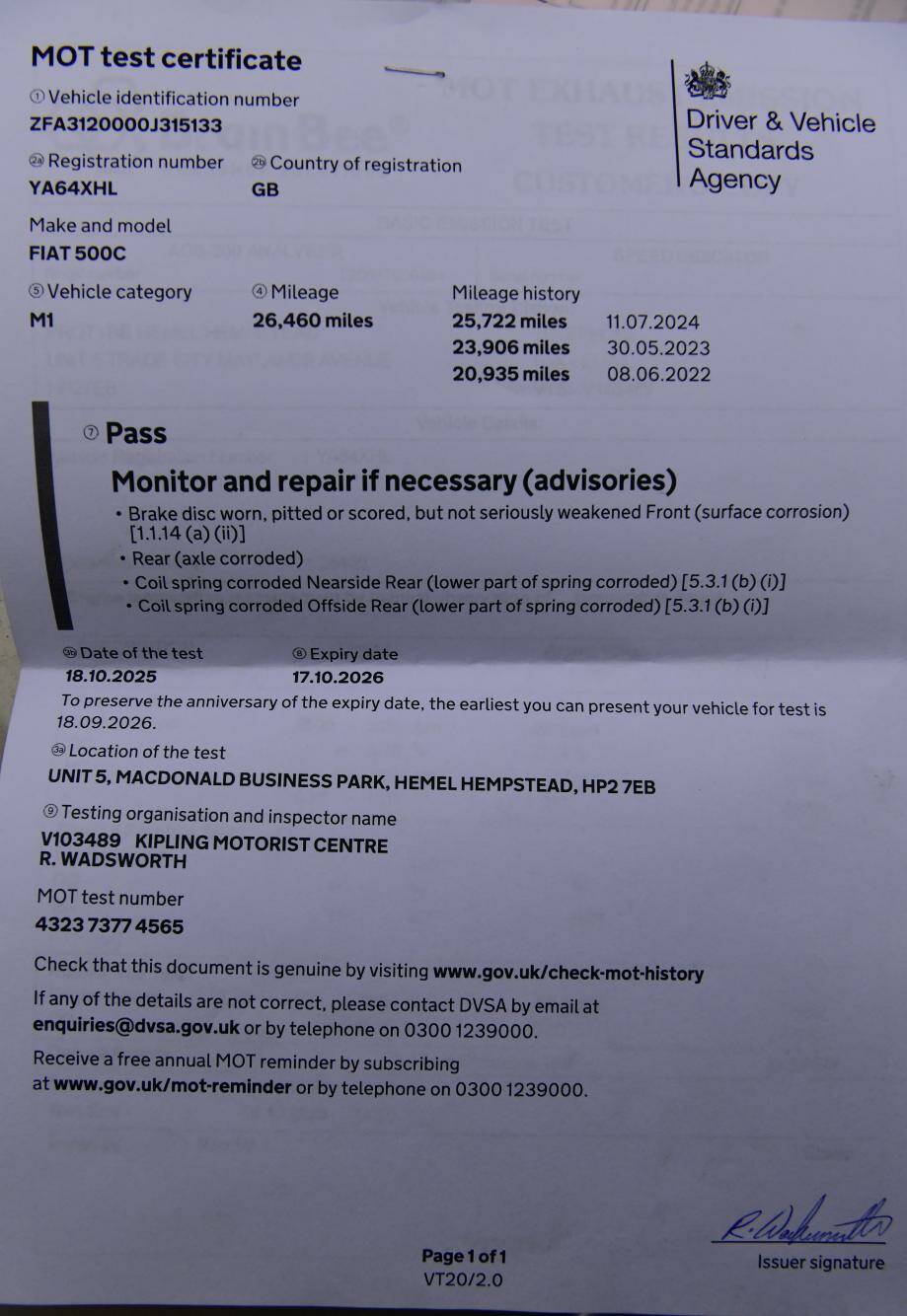 A Very Low 26,000 miles covered from new backed up by incremental mileage in the paperwork. Lady Owned; this car just flew though its MOT & was serviced less then 1000 miles ago. This little Fiat is in excellent condition with 4 good tyres & nice clean Verde Latte paintwork