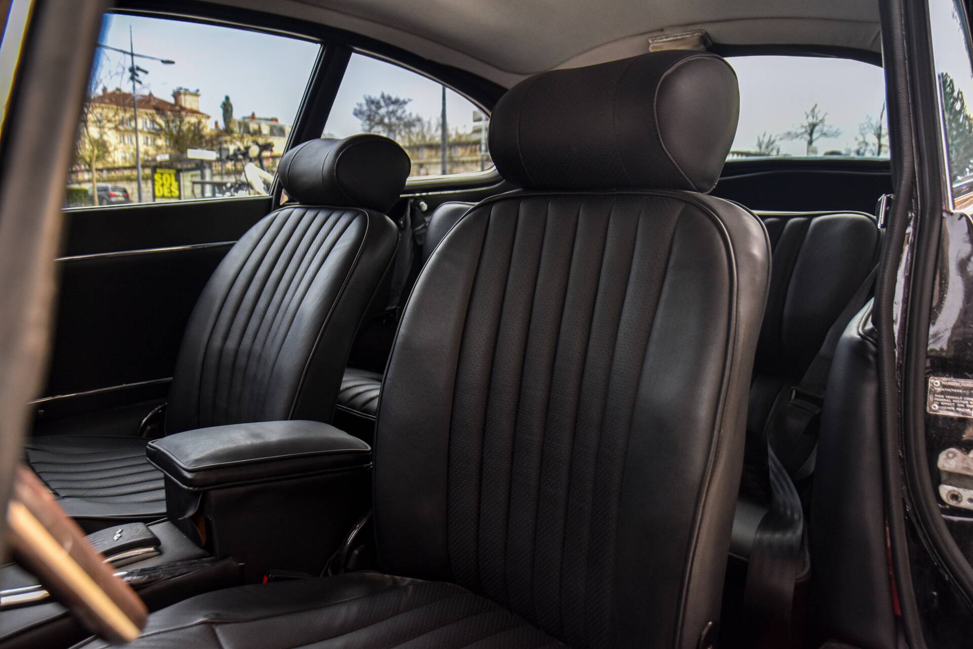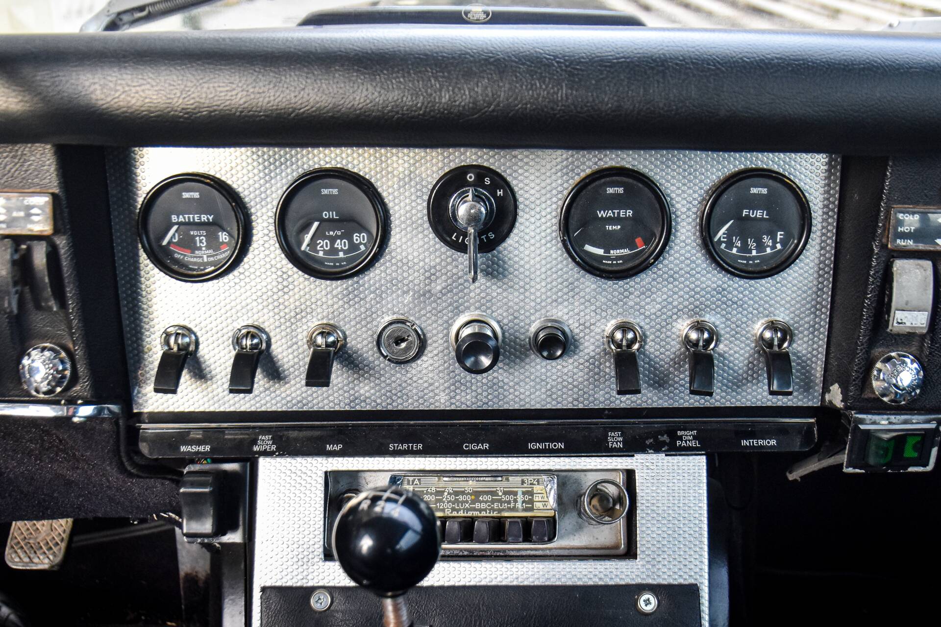 Intérieur : L’intérieur est en excellent état et a été entièrement refait à neuf. Les cuirs sont neufs et présentent parfaitement. La console centrale est conforme à celle d’une Jaguar Type E Série 1, reconnaissable aux leviers sur la planche de bord, un détail recherché par les connaisseurs. Le véhicule est en configuration 2+2 avec les sièges arrière.