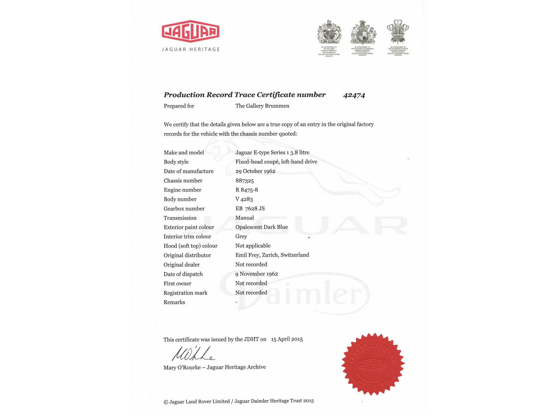 Jaguar E-Type 3.8 Litre Coupe Series 1 "From the first owner, first paint" TOP original! From the first Swiss owner who bought the Jaguar new, only 57.000 km from new! Remarkably well preserved and original, Newly delivered in Switzerland - Lucerne, First owner traded in his XK150 for this E-Type, All booklets - Purchase invoice and Abgaswartung accompanying the car and showable,