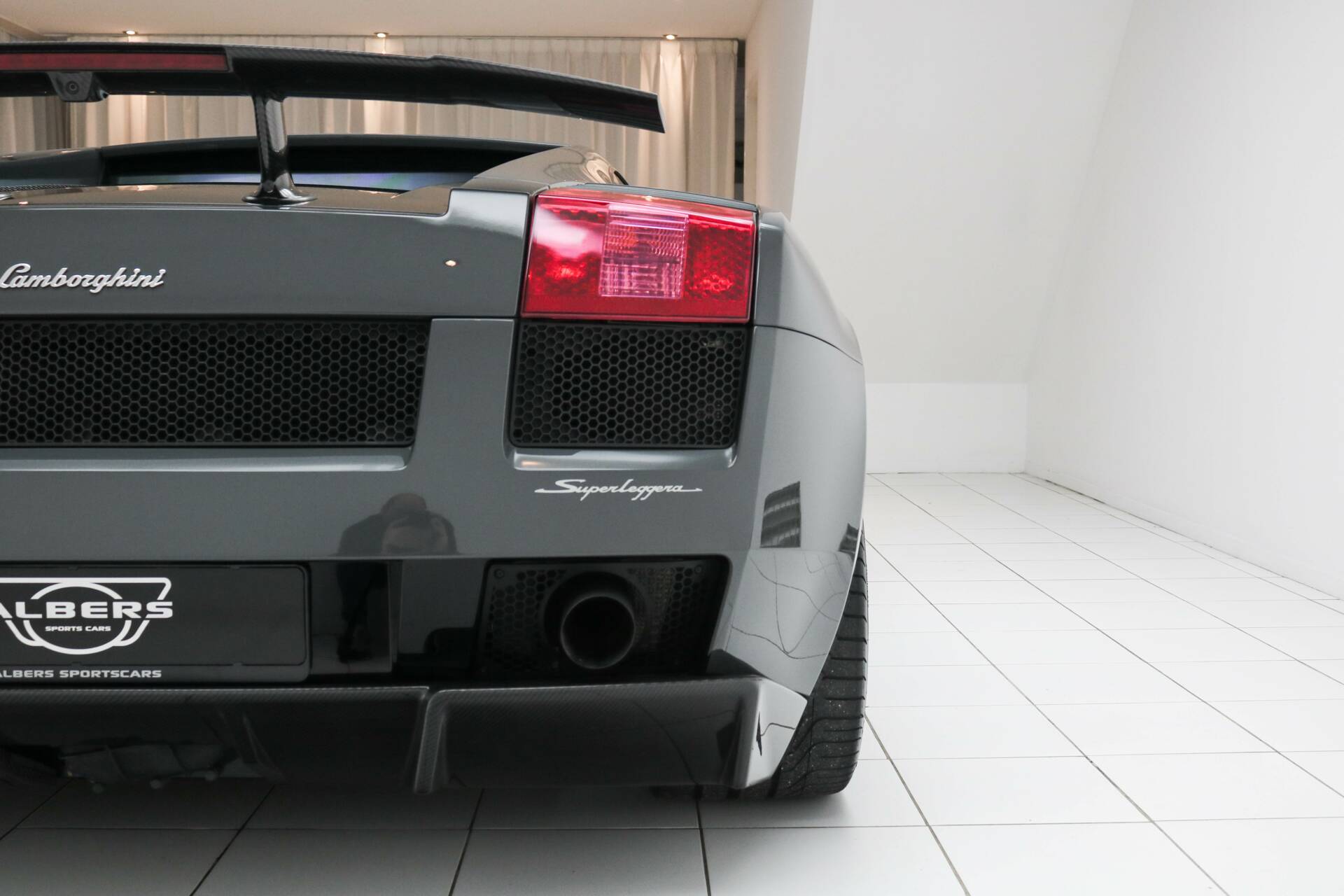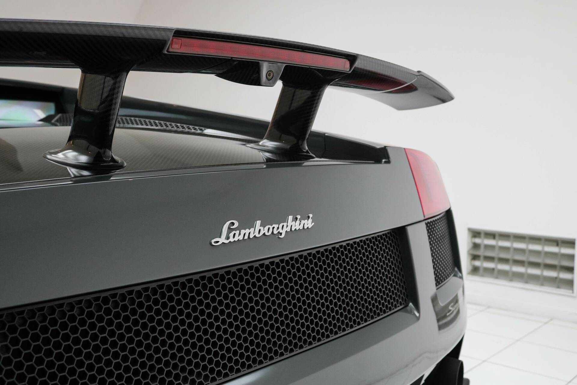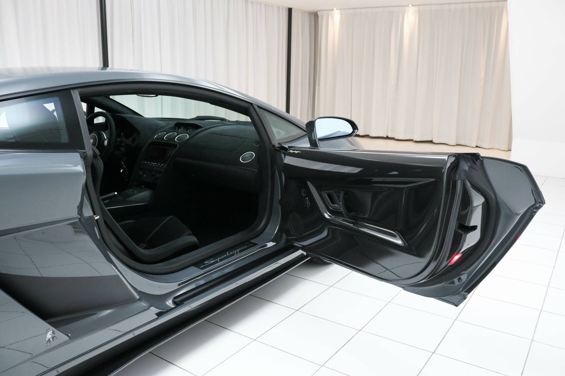 Este Lamborghini Gallardo Superleggera está acabado en el exclusivo color Grigio Telesto. El exterior cuenta con el paquete exterior de carbono, que incluye un gran alerón trasero de carbono, faldones laterales de carbono, un difusor de carbono y una cubierta de motor de carbono. La cámara trasera está integrada en el alerón trasero de carbono. Las llantas originales Speedline Lamborghini Superleggera completan el carácter deportivo y ligero.