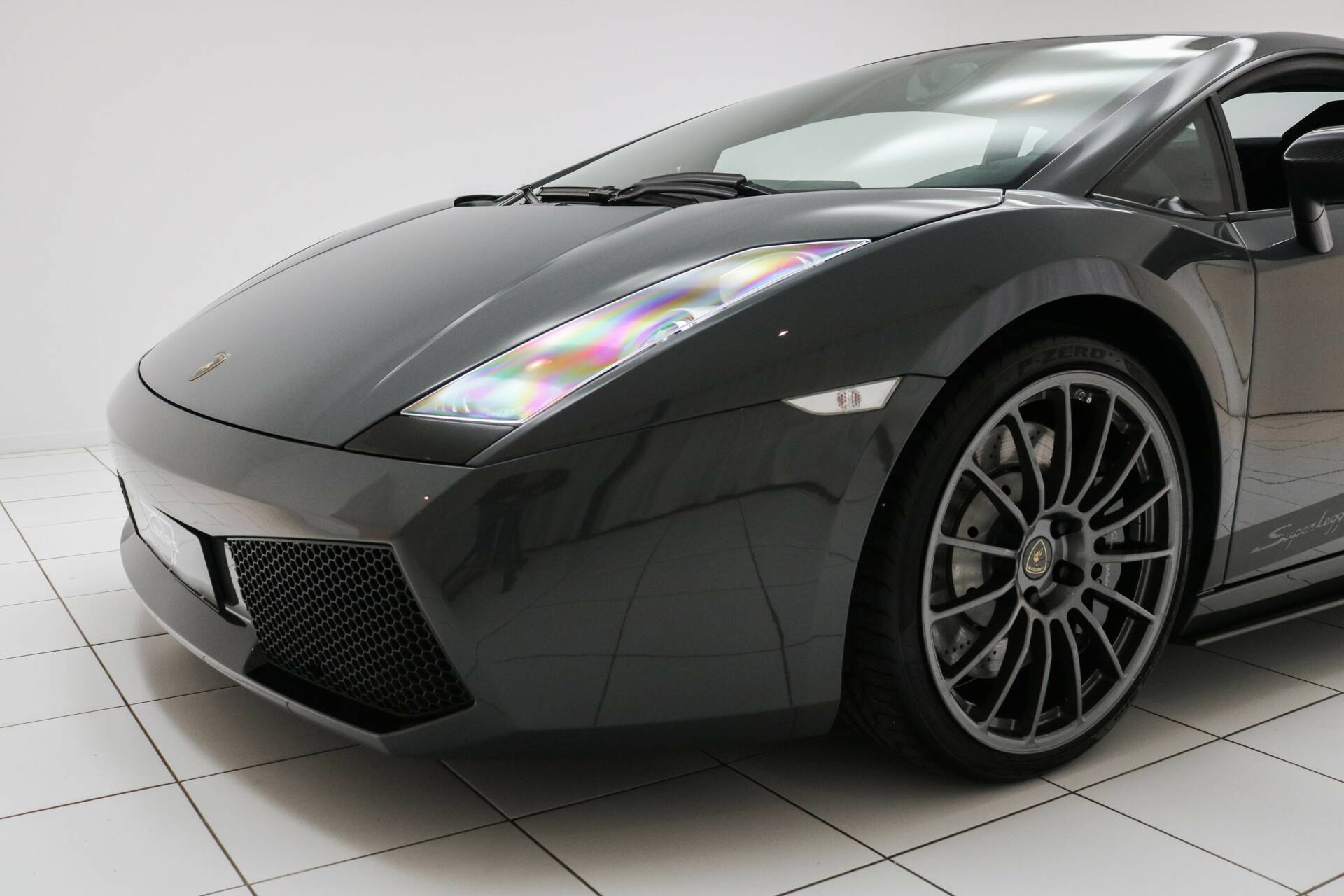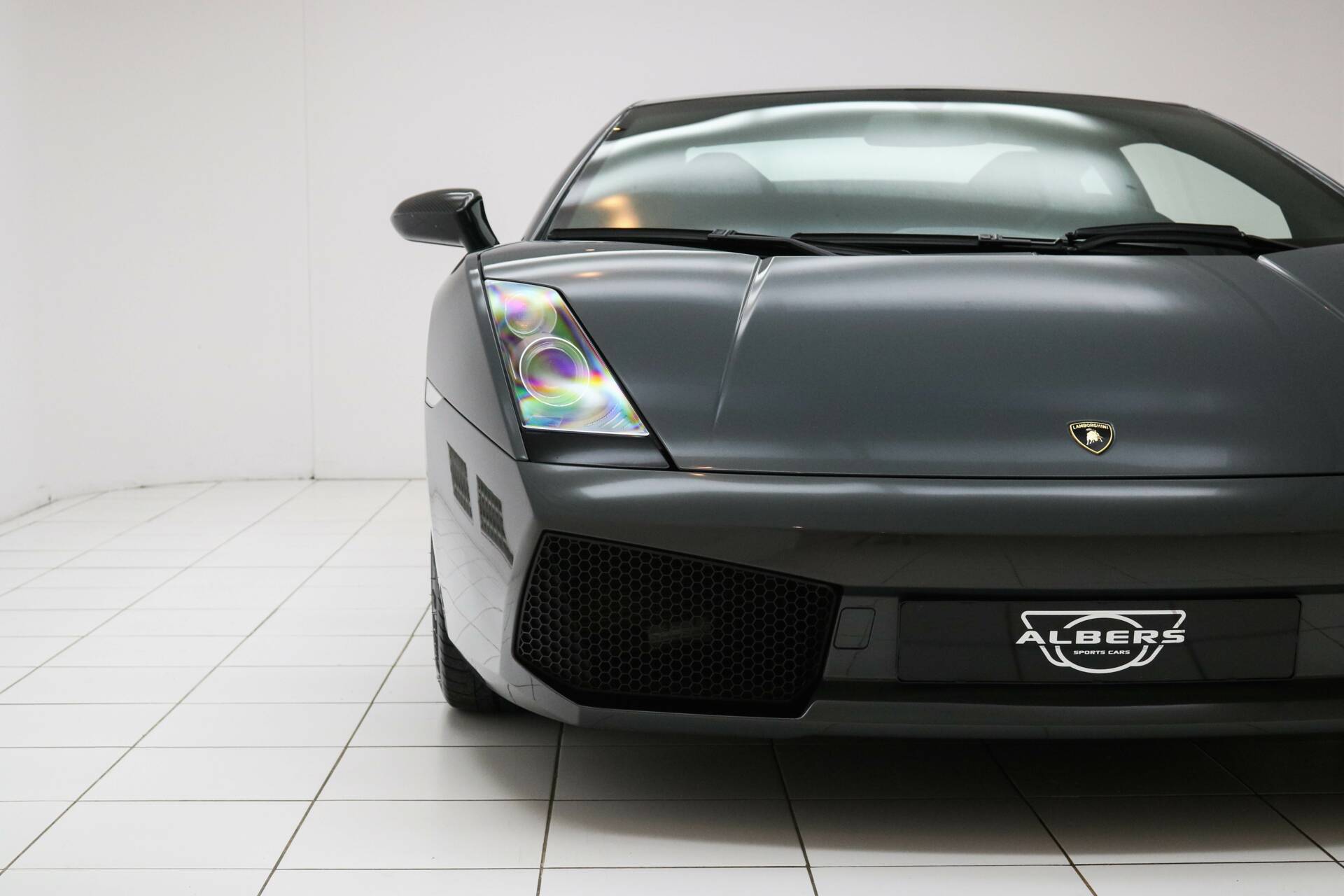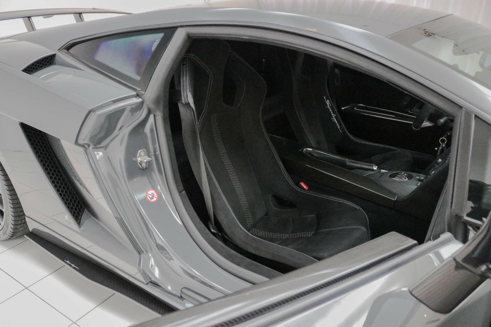Este Lamborghini Gallardo Superleggera está acabado en el exclusivo color Grigio Telesto. El exterior cuenta con el paquete exterior de carbono, que incluye un gran alerón trasero de carbono, faldones laterales de carbono, un difusor de carbono y una cubierta de motor de carbono. La cámara trasera está integrada en el alerón trasero de carbono. Las llantas originales Speedline Lamborghini Superleggera completan el carácter deportivo y ligero.