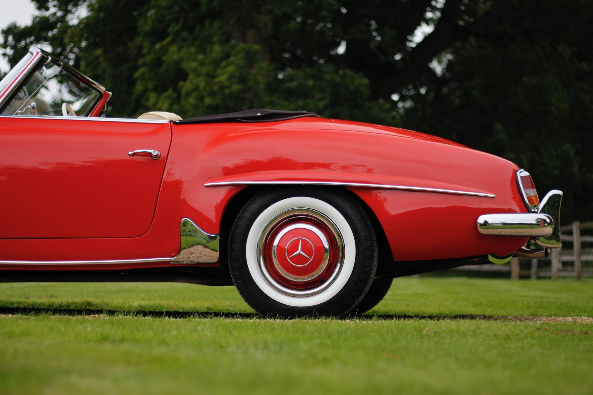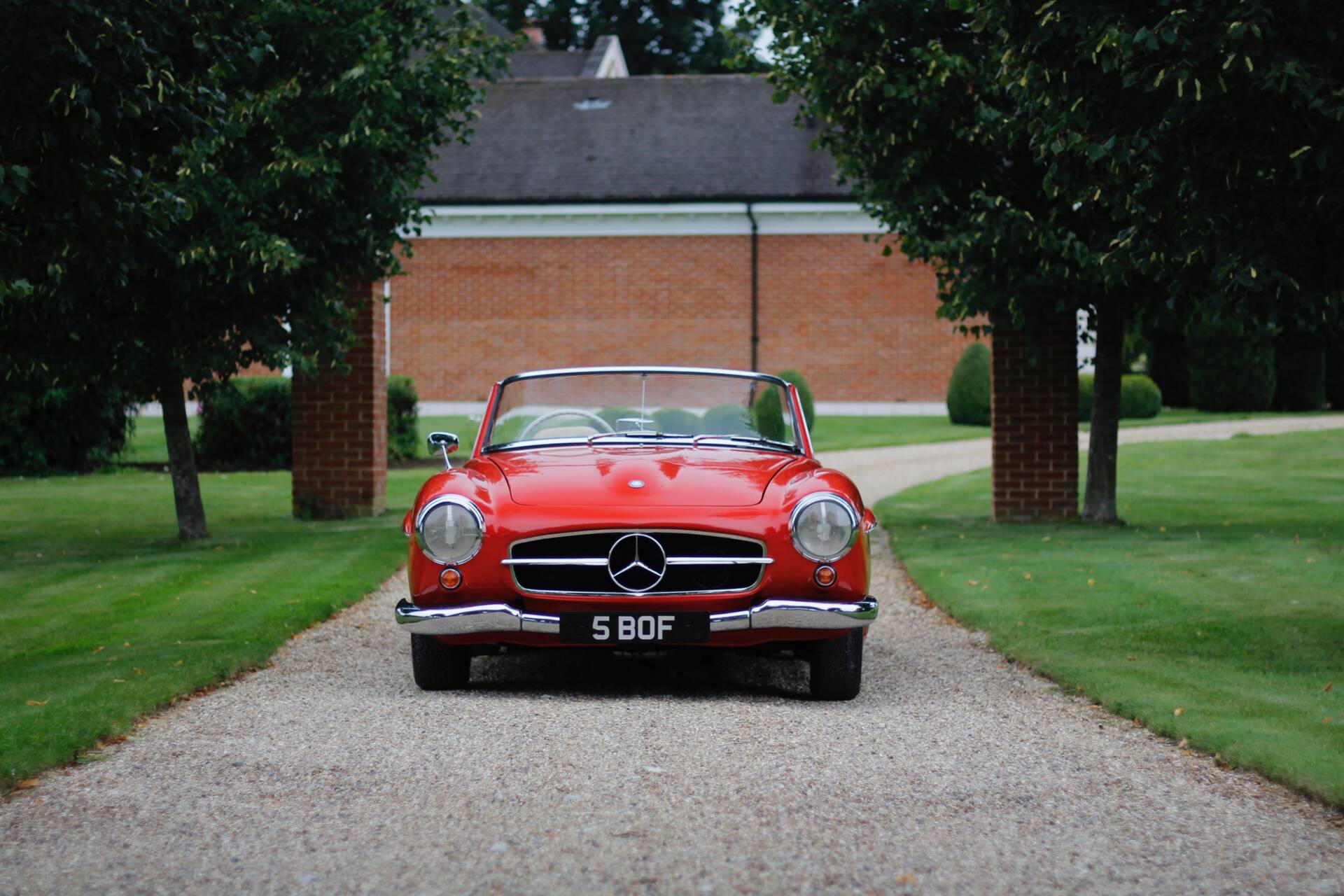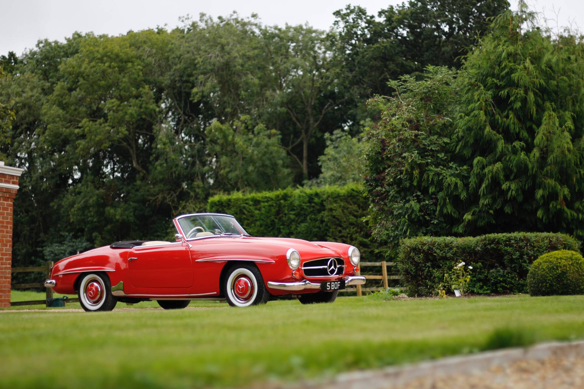Only a few right-hand drive examples were supplied new to the UK market during the 1959 model year, this example was one of those few, chassis 121.040-20-014566 was originally finished in the striking colour of red with a new beige hood. Issued with registration number '5 BOF' on 23rd September 1959 and still retaining the number, this example has spent the majority of its life in Surrey. One of only 562 units manufactured by Mercedes-Benz in right hand drive guise throughout the eight-year production run, this 190 SL presents exceedingly well. The vendor has just spent circa £12,000 on this Mercedes-Benz, including new carburettors, fuel pump and a thorough engine tune. Shod with a good set of whitewall tyres which help accentuate the shiny Fire Engine Red paintwork. The glovebox has an inset clock and the dashboard carries a Becker Mexico radio which is thought to be original to the car. Ultimately, the Mercedes-Benz 190 SL stands as a car that embodied the glamour of postwar Europe and the growing international reputation of Mercedes-Benz. It wasn't the fastest sports car of its time, but it delivered style, quality, and everyday usability, making it an enduring classic and a cornerstone of Mercedes-Benz's rich heritage in open-top motoring. Consigned by Stewart Banks.
