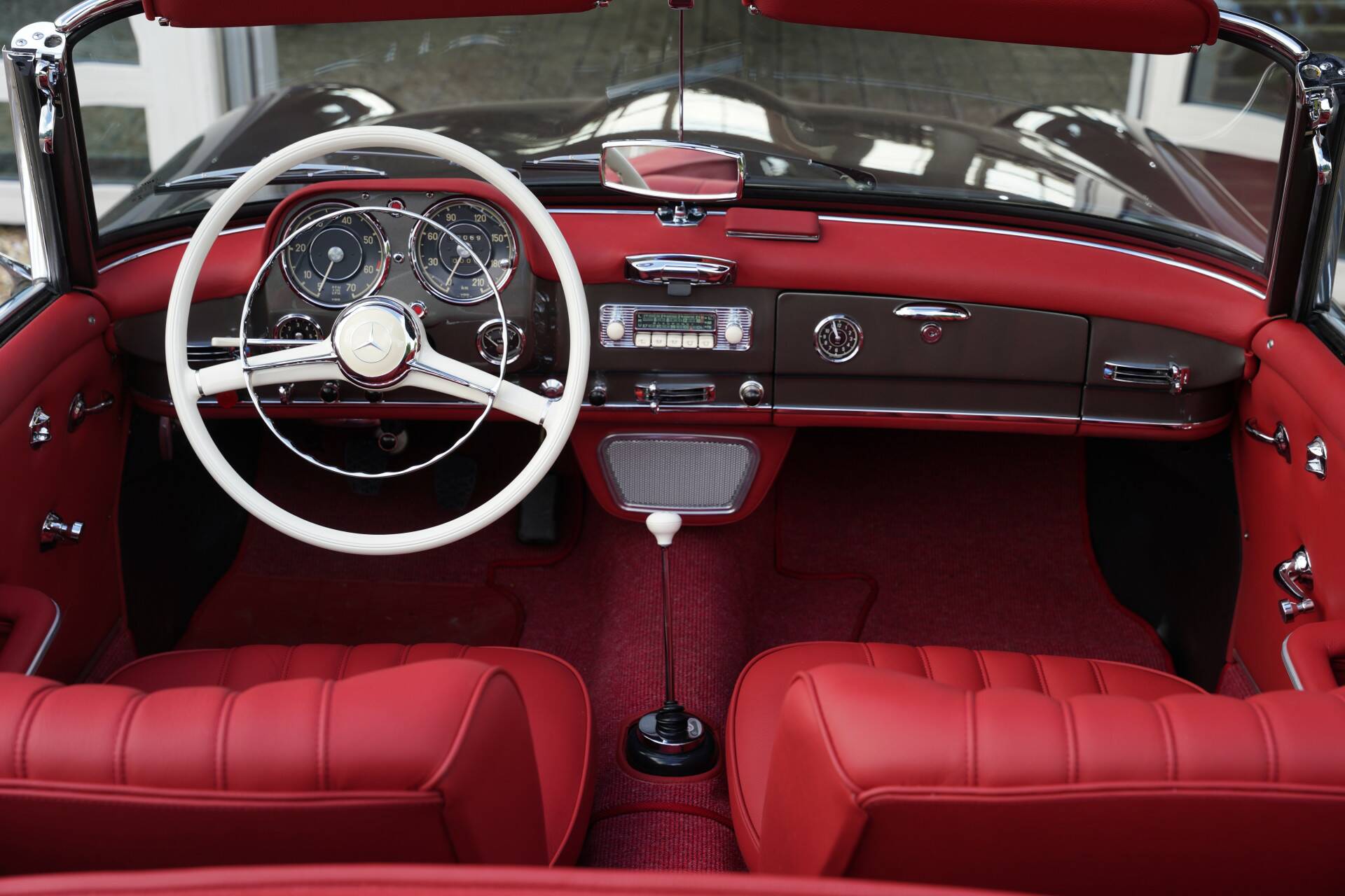 The interior is just as striking. Completely reupholstered with high-quality materials, it features a rich Mittelrot leather that creates a striking contrast with the exterior. From the seats to the door panels, carpets to the dashboard, every inch shows attention to detail. For a closer look, we invite you to browse the photo gallery on our website. The dashboard and oversized steering wheel instantly transport you back to the refined atmosphere of the 1960s.
