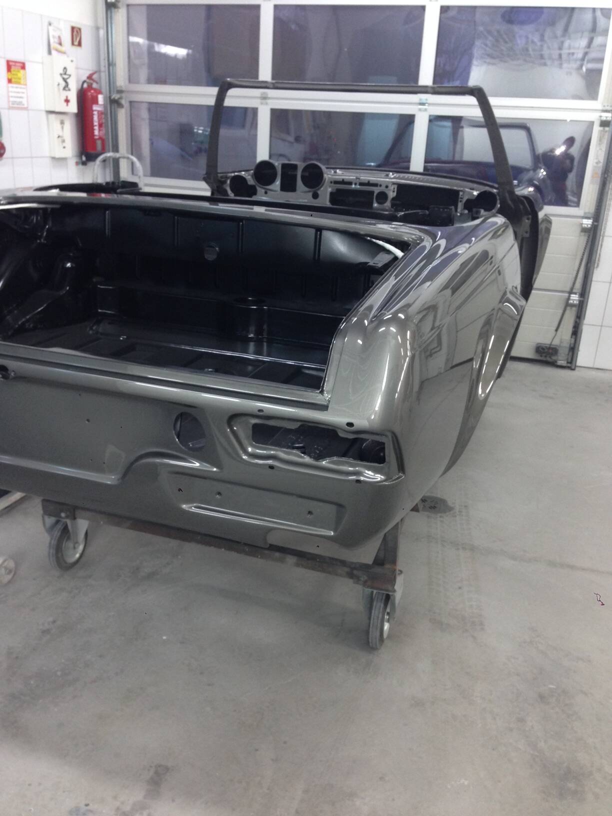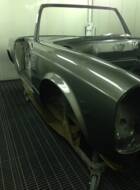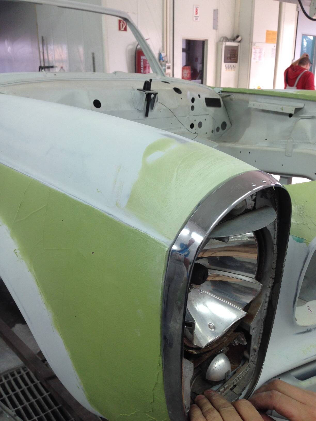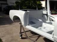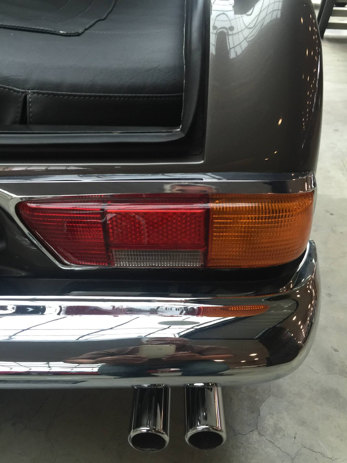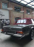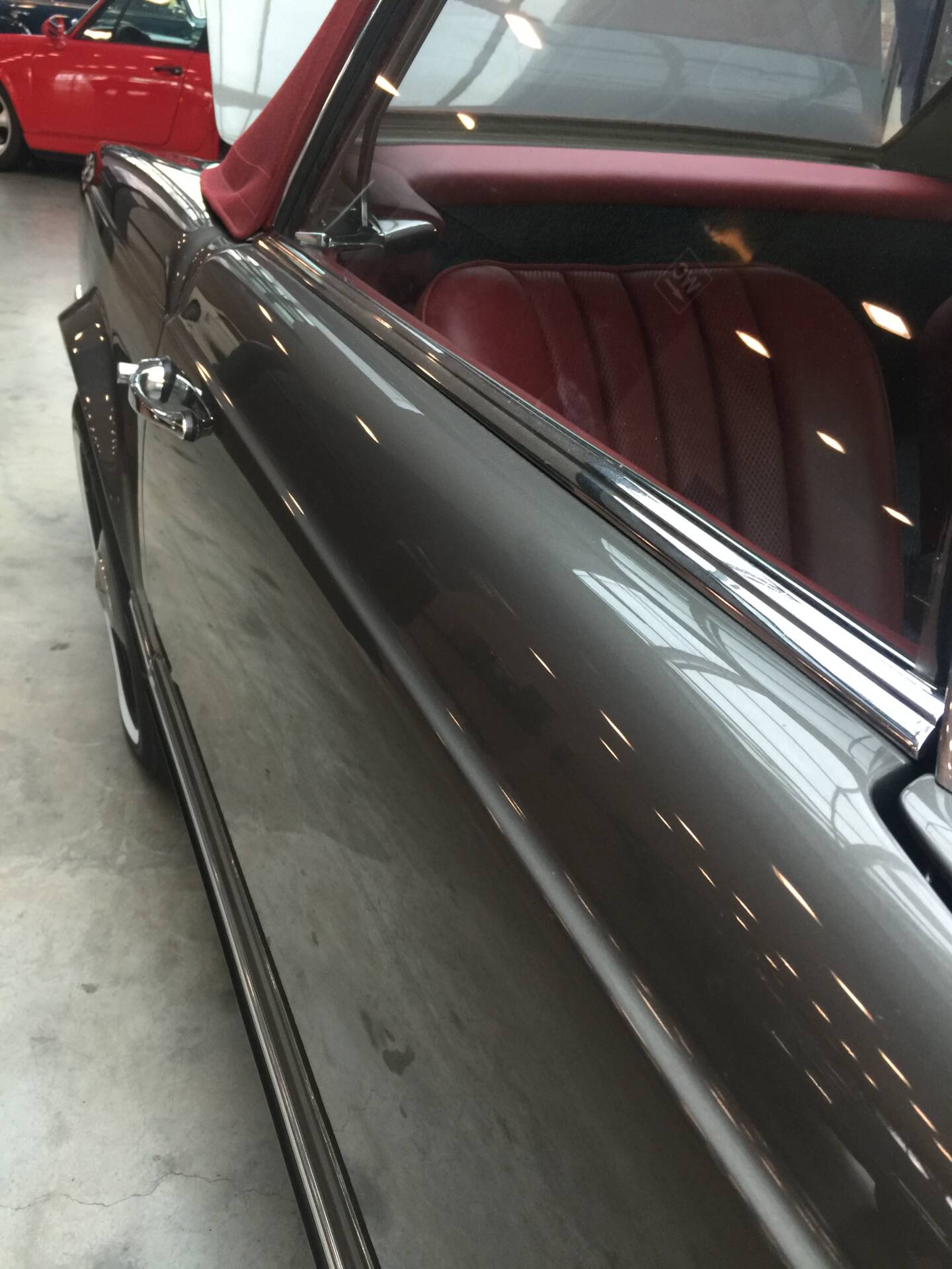 Die Karosserie zeigt sich nach Kalifornien-Import in außergewöhnlich originalem Zustand. Die behutsame Entlackung erfolgte größtenteils chemisch, lediglich an zwei Stellen wurde zur Substanzschonung Glasperlenstrahlen eingesetzt. Die Linienführung der Pagode bleibt so authentisch erhalten; die Spaltmaße und Blecharbeiten geben laut Restaurierungsdokumentation keinen Anlass zu Beanstandungen. Der Lack wurde nach deutschen Qualitätsstandards erneuert und präsentiert sich heute im zeitgenössischen, typischen Farbton. Amerikanische Exportleuchten und Details sind erhalten oder fachgerecht zurückgebaut.