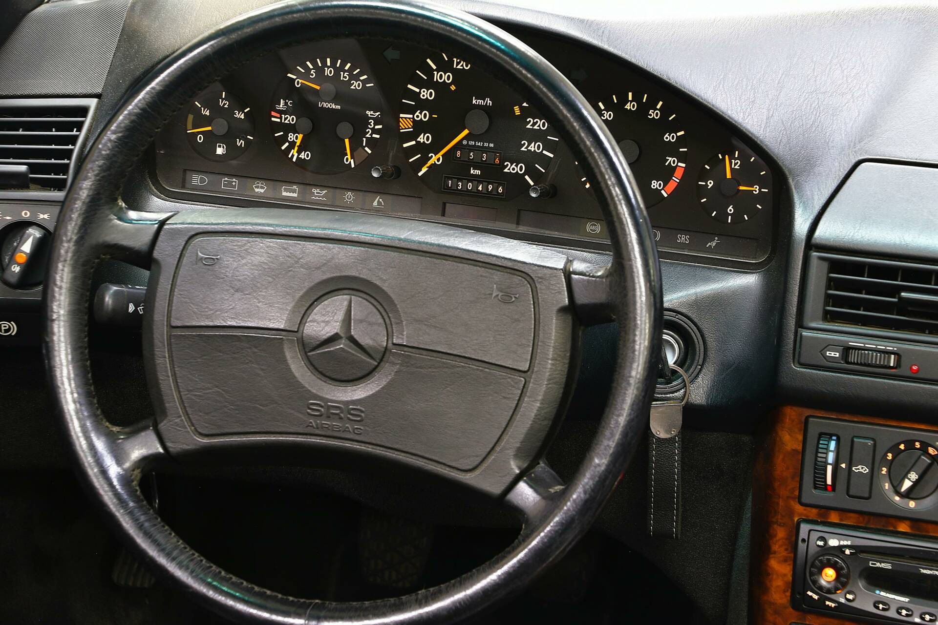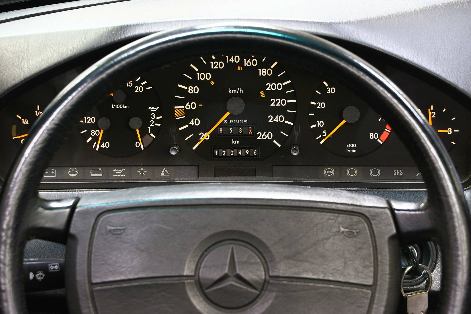 Unser 300SL-24 wurde am 15.10.1993 erstzugelassen. Er verbrachte seine "frühen Jahre" in Italien (Region Modena), wurde aber bereits 2003 wieder nach Deutschland gebracht und vom heutigen Halterehepaar am 27.10.2003 zum Verkehr zugelassen.Mehr als 22 Jahre also blieben die letzten Halter dem Wagen treu, womit sich auch der gute Erhaltungszustand erklären lässt. Das Zählwerk steht bei 130.500 Kilometern -- ein Wert, der sich aus den vorliegenden Dokumenten ab dem Jahr 2003 nachvollziehen lässt und den wir mit Blick auf den Gesamtzustand des Wagens für authentisch halten.