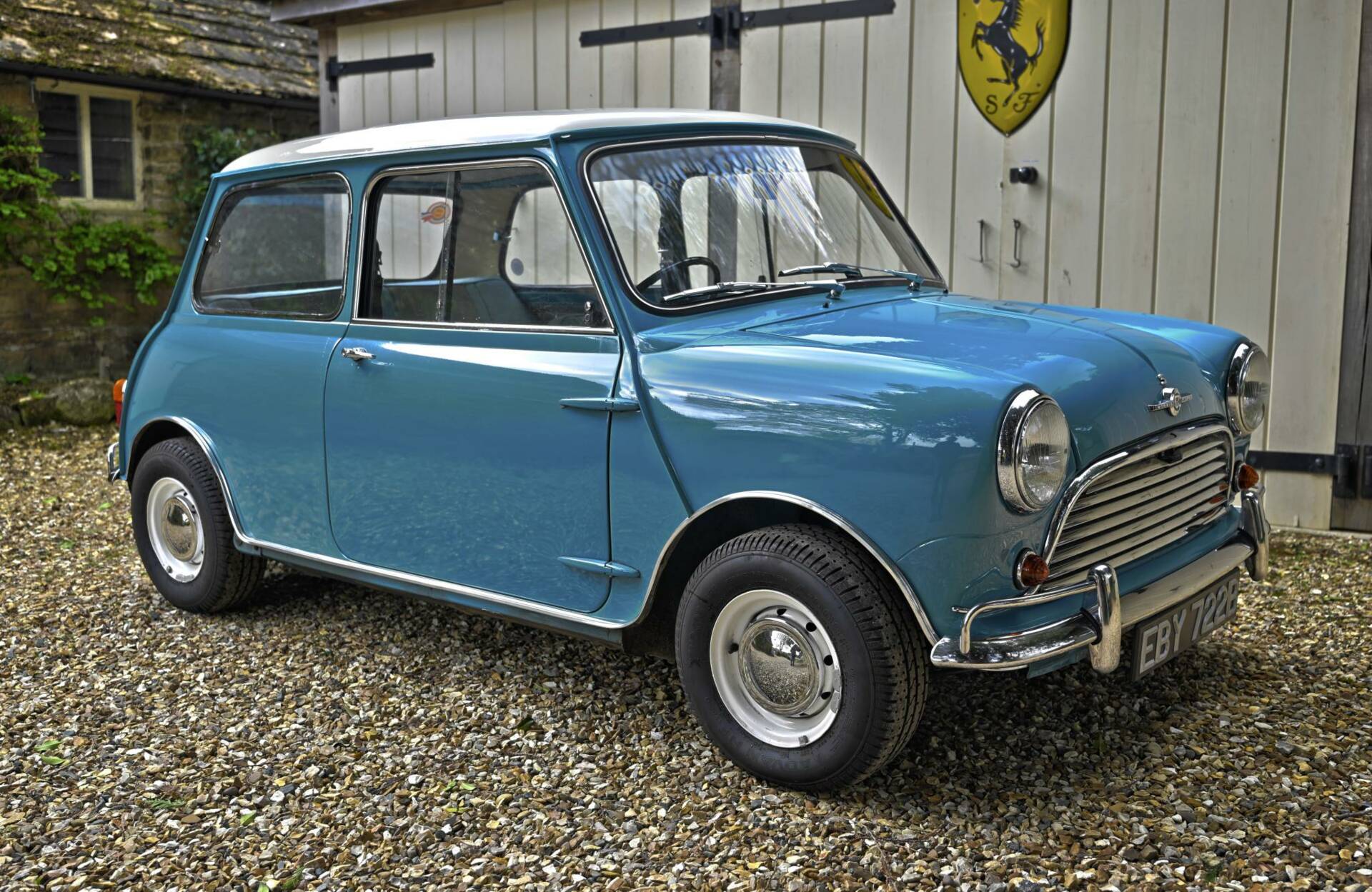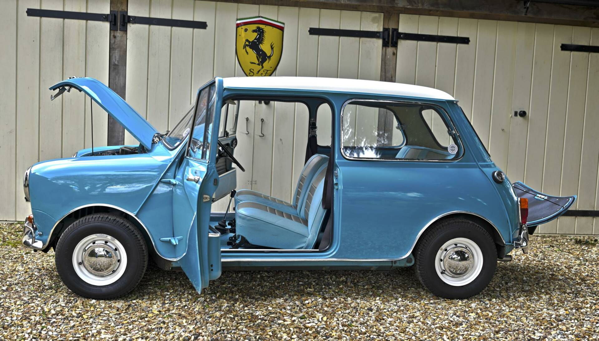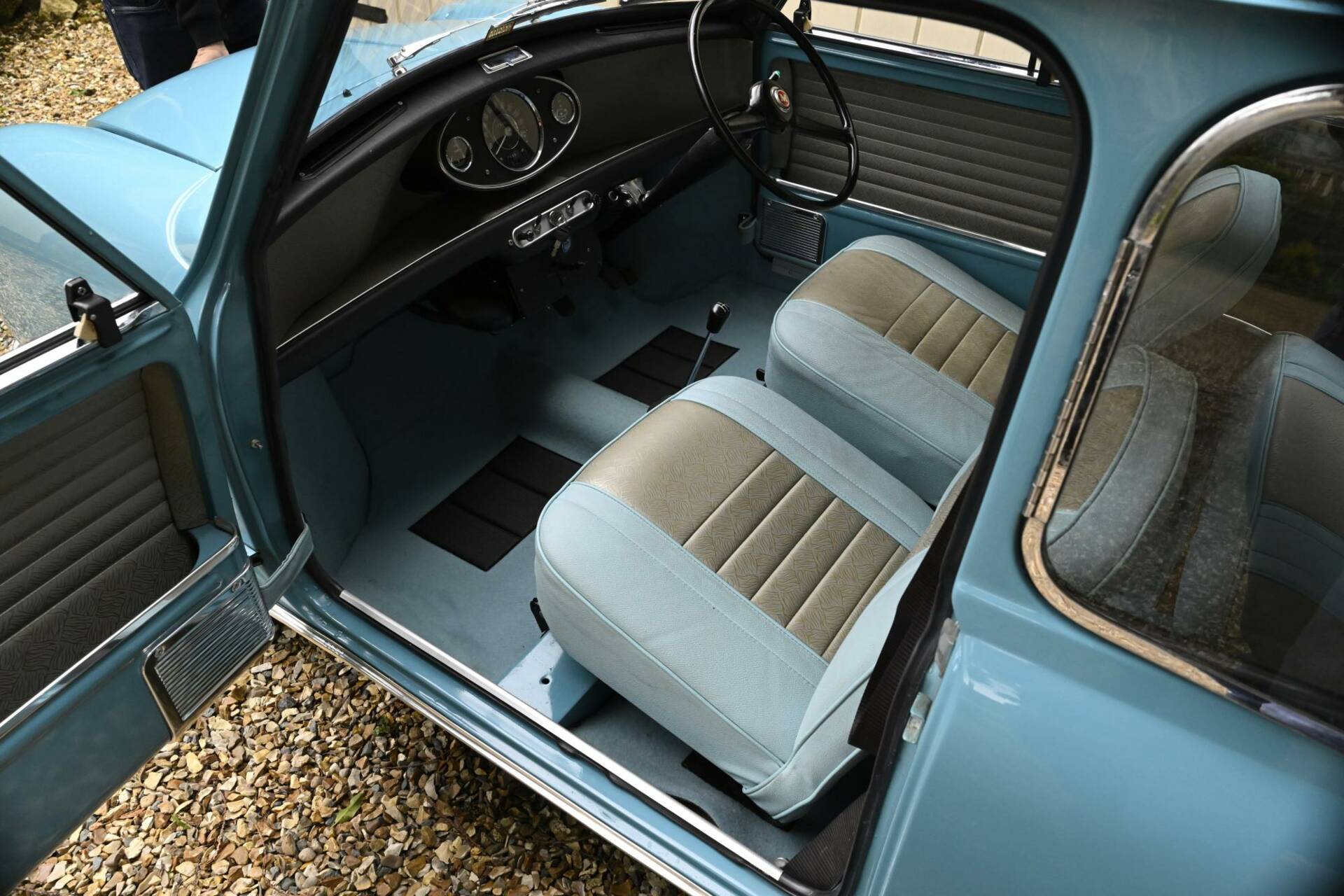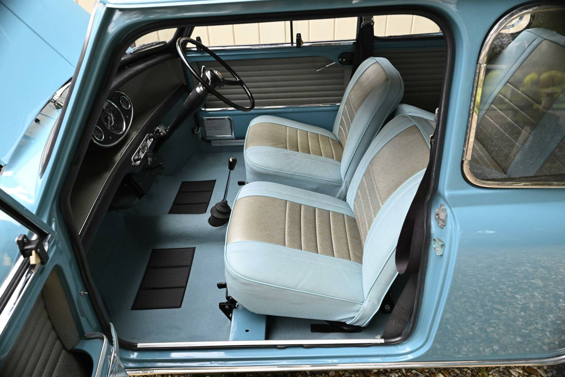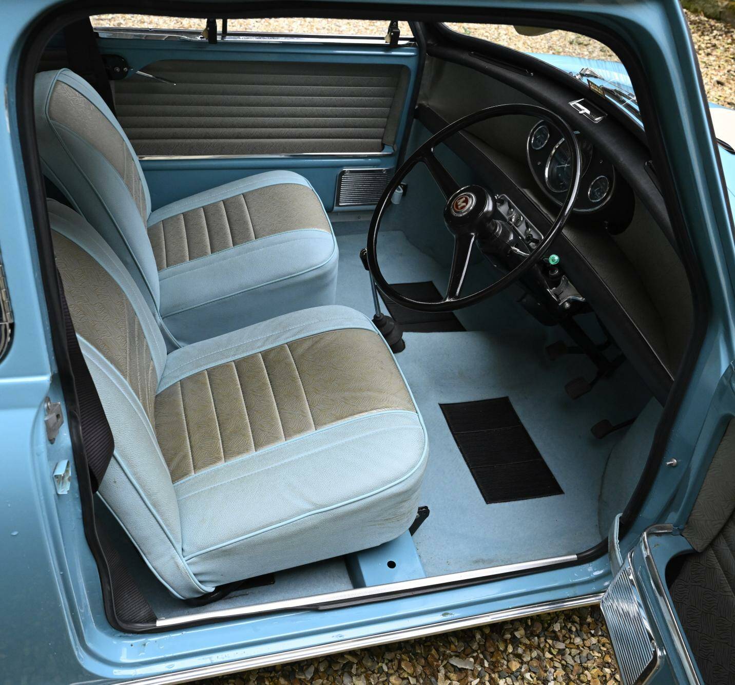 Fully restored over a three year period on behalf of and by it's then owner, a retired aircraft engineer. On completion, the car was sold to a new owner in 2016. It comes complete with photographic record and invoices totalling around £22,000 for work undertaken. This car was ordered new with the optional wider wheels which it wears to this day inlcuding a full size spare under the boot tray. Finished in Surf Blue with an Old English White roof and complemented by the correct Powder Blue/ Gold Brocade Grey vinyl trim, this Mini has been superbly restored to an impeccable standard.