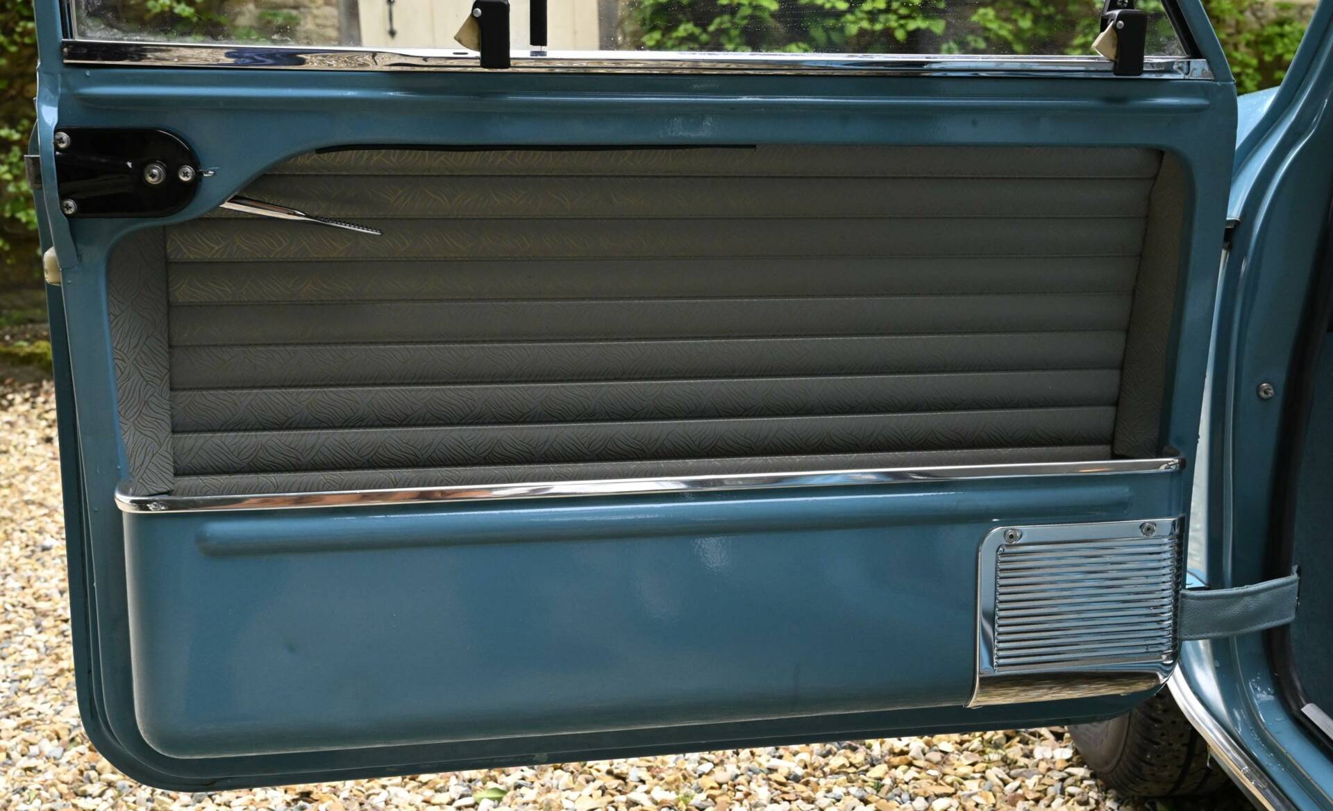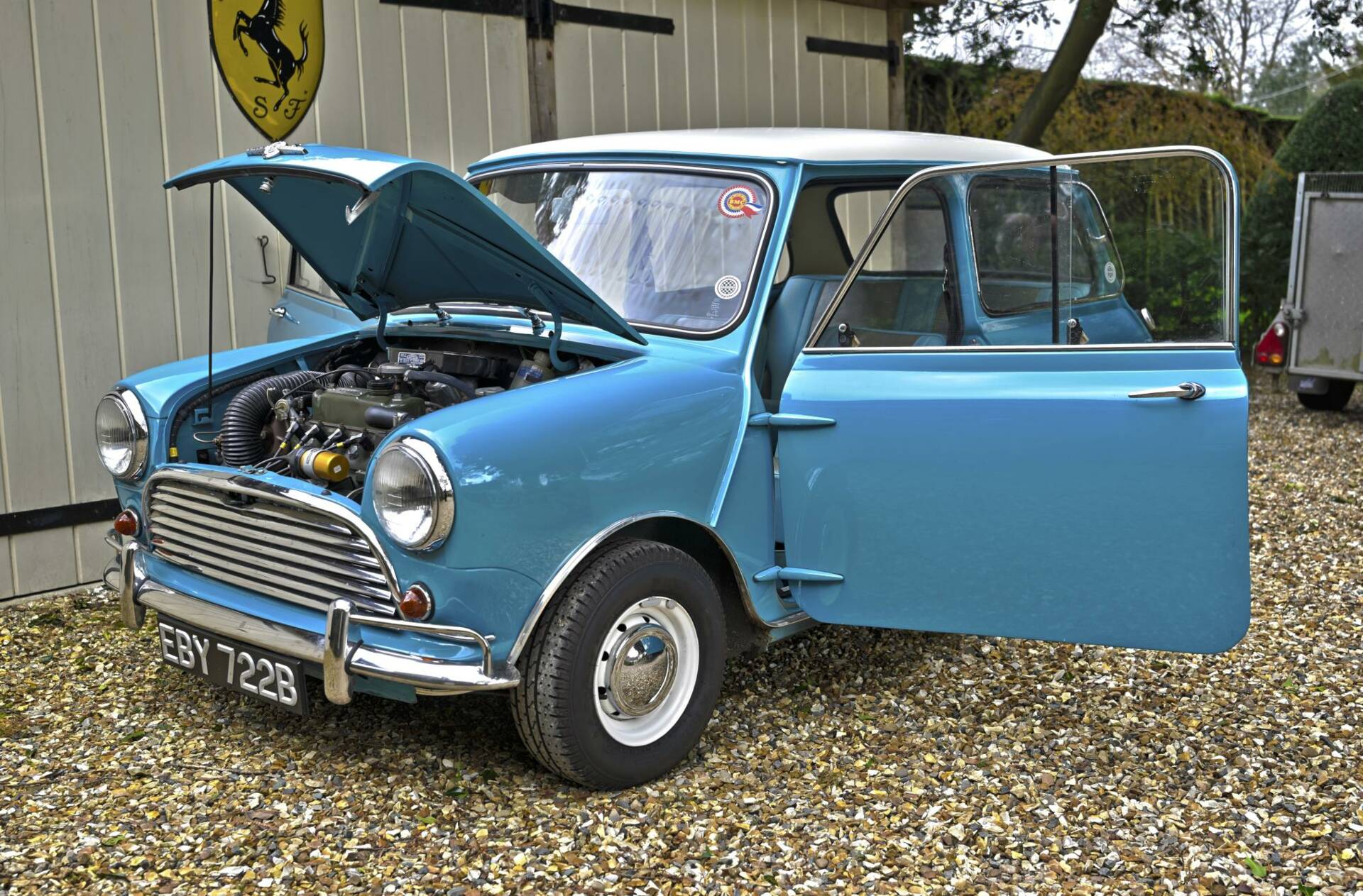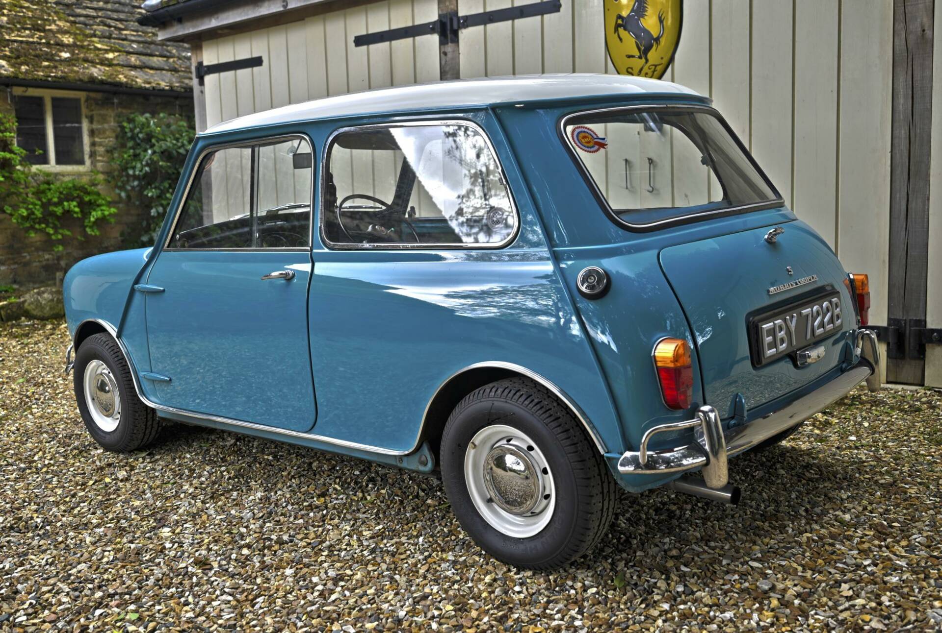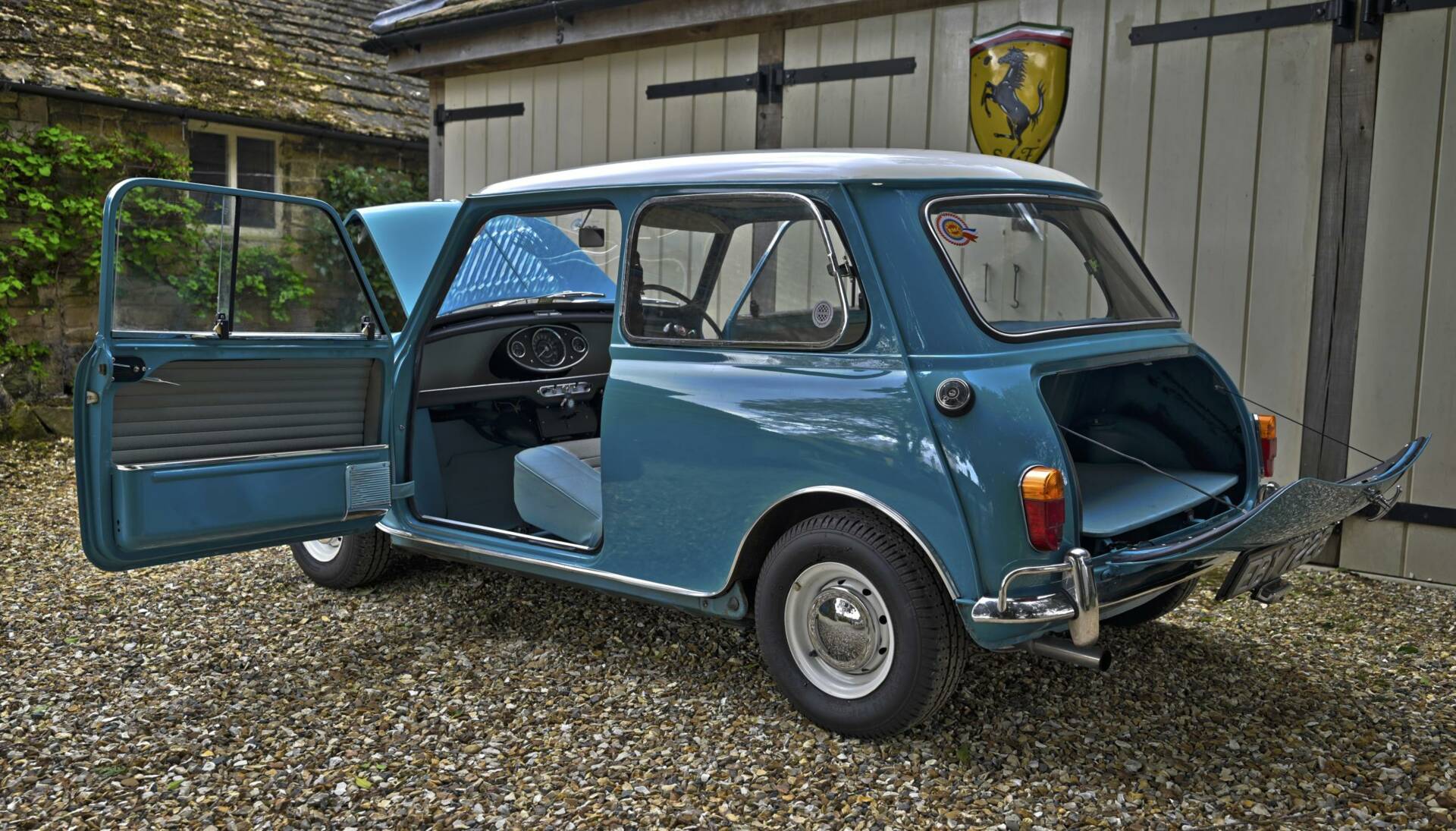 Fully restored over a three year period on behalf of and by it's then owner, a retired aircraft engineer. On completion, the car was sold to a new owner in 2016. It comes complete with photographic record and invoices totalling around £22,000 for work undertaken. This car was ordered new with the optional wider wheels which it wears to this day inlcuding a full size spare under the boot tray. Finished in Surf Blue with an Old English White roof and complemented by the correct Powder Blue/ Gold Brocade Grey vinyl trim, this Mini has been superbly restored to an impeccable standard.