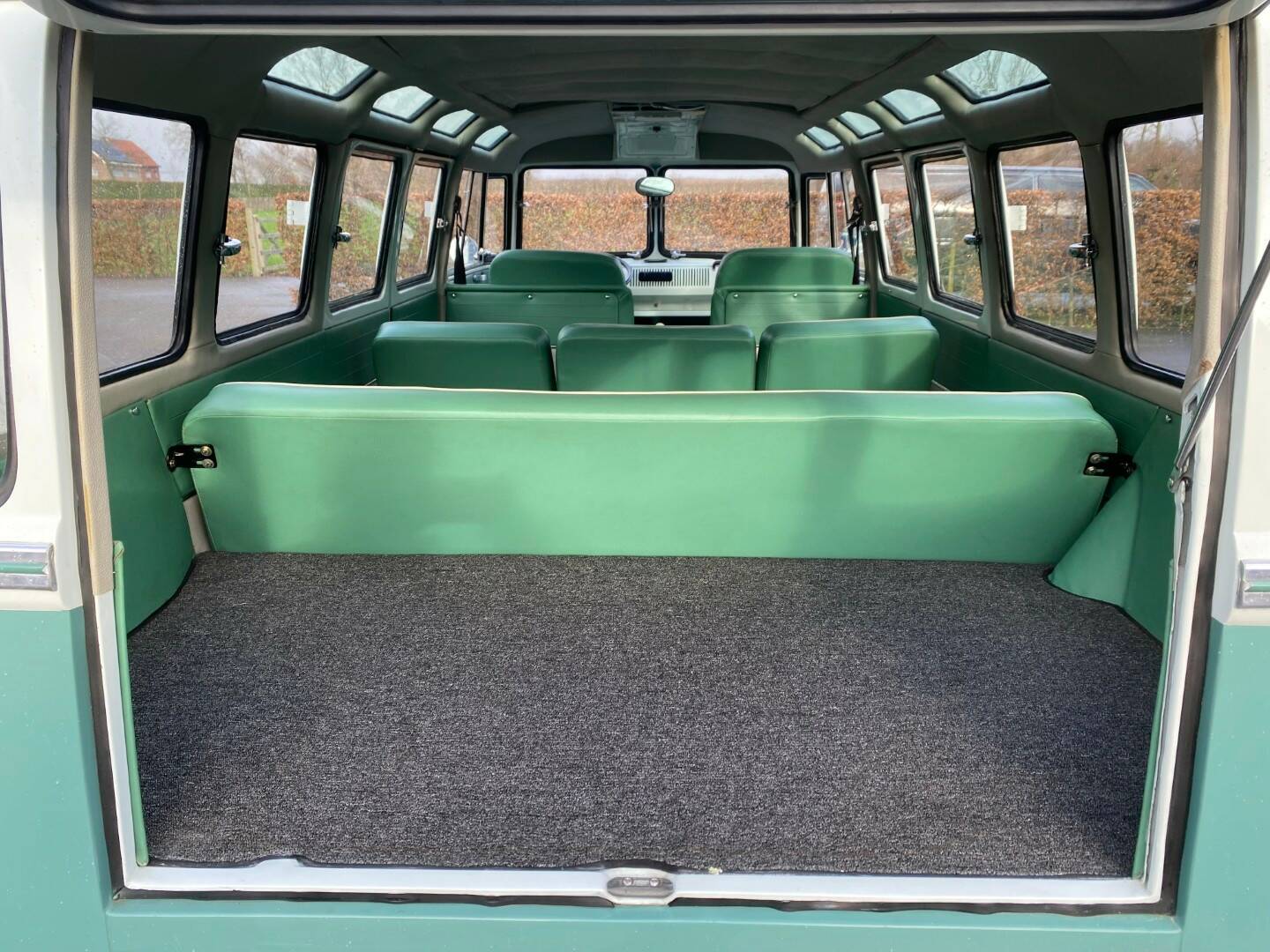 Prachtige Volkswagen T1 Samba - deluxe bus met schuifdak en safariramen. Deze bus is zorgvuldig gerestaureerd door middel van een grondige restauratie. De staat van de bus spreekt voor zich. De carrosserie is volledig ontroest en gerestaureerd en heeft deze prachtige groen-witte kleurcombinatie gekregen. Het interieur heeft hetzelfde proces ondergaan en is volledig opnieuw bekleed met groen kunstleer met witte biezen en afgewerkt met een set grijze tapijten. Over de staat van het chassis, de carrosserie en het lakwerk valt niets te zeggen. Het is gewoonweg prachtig.
