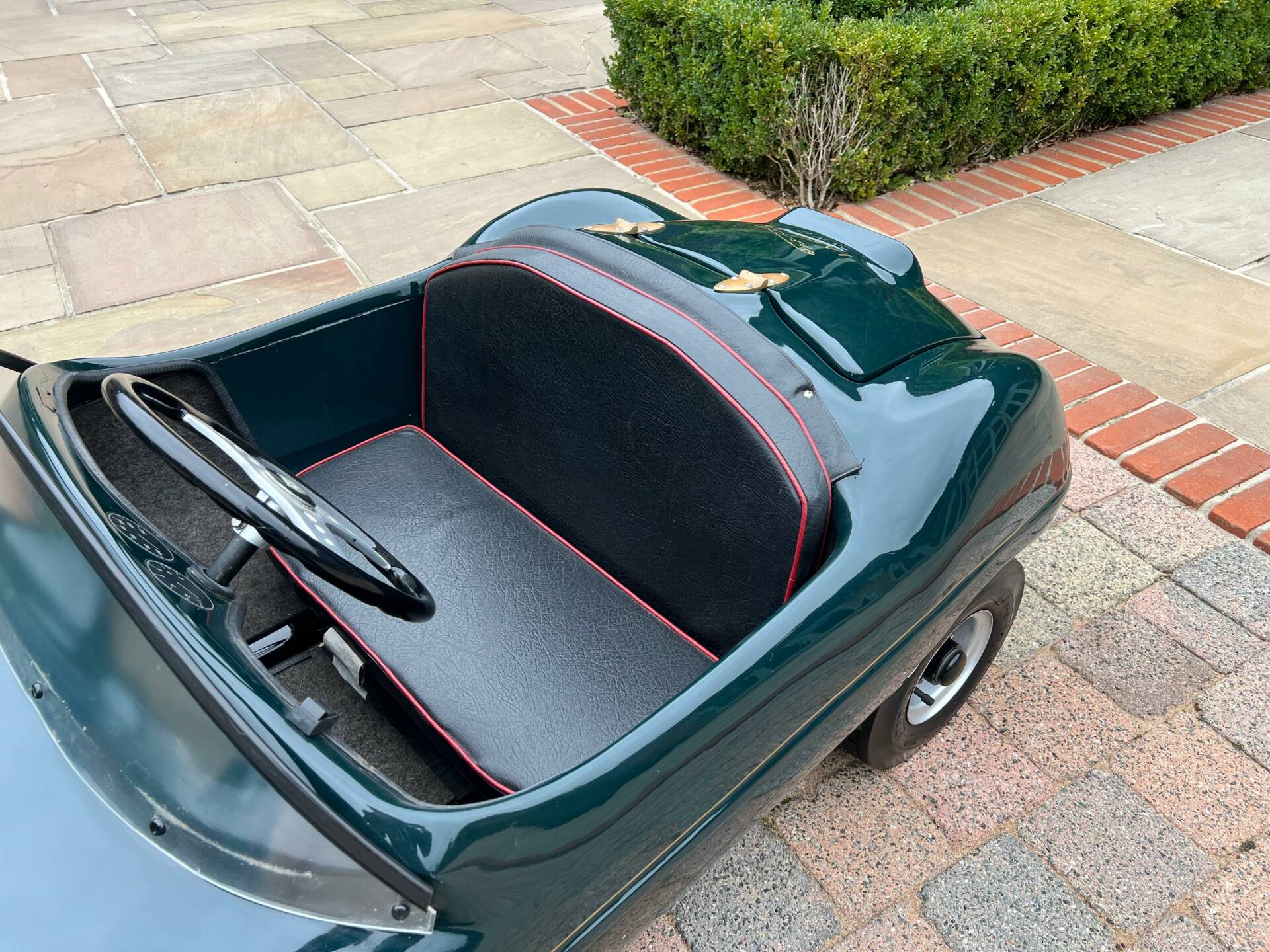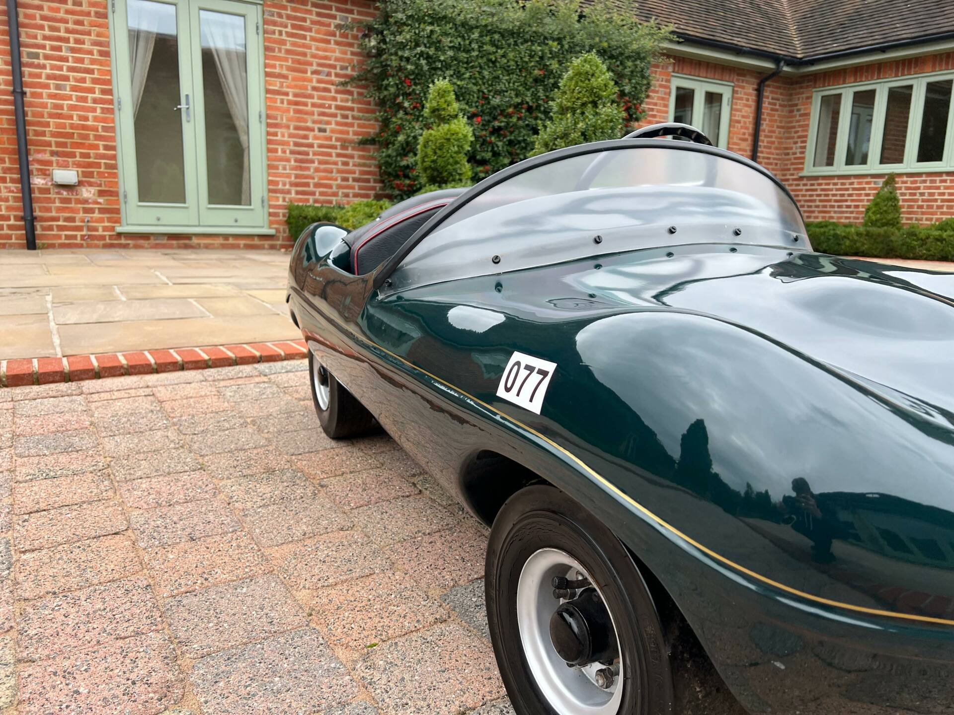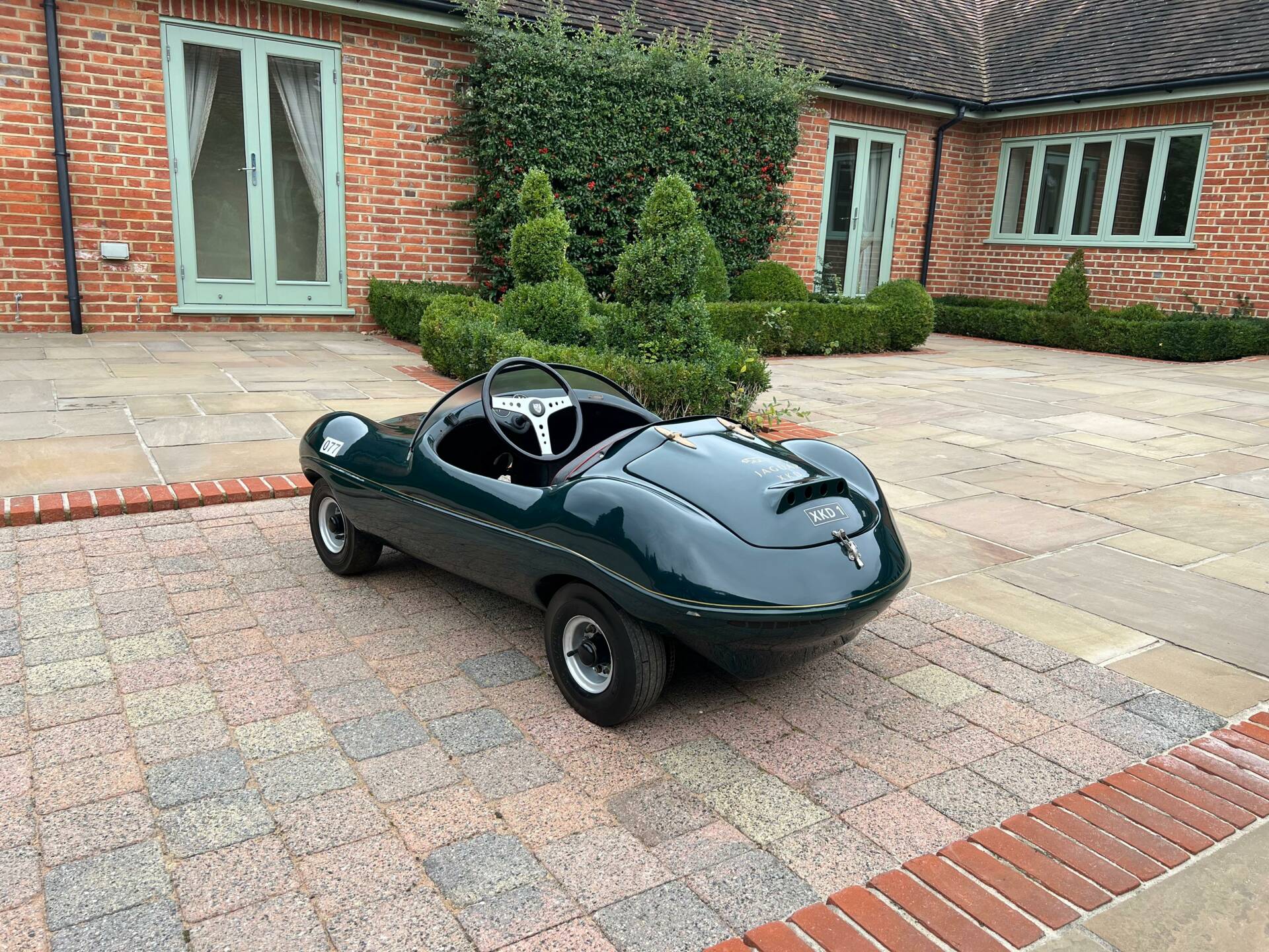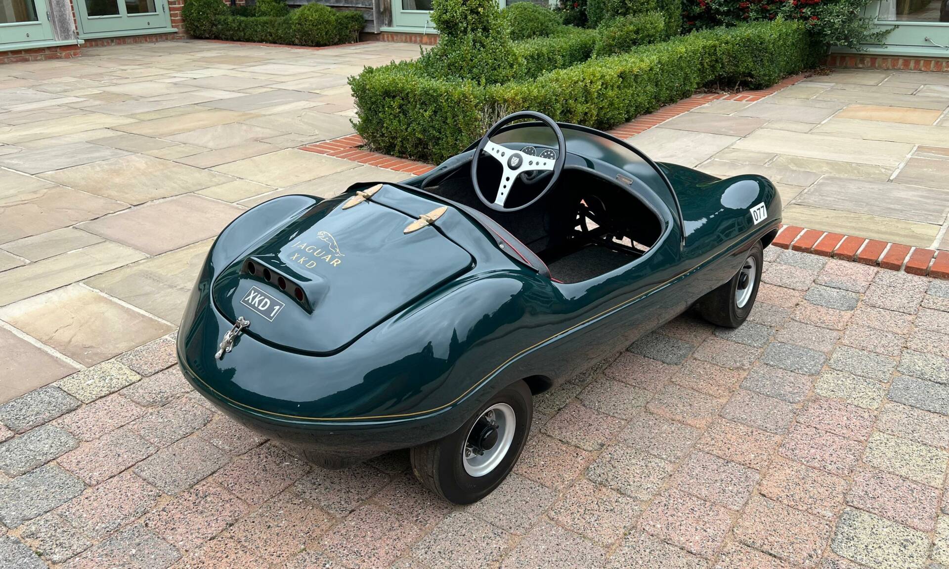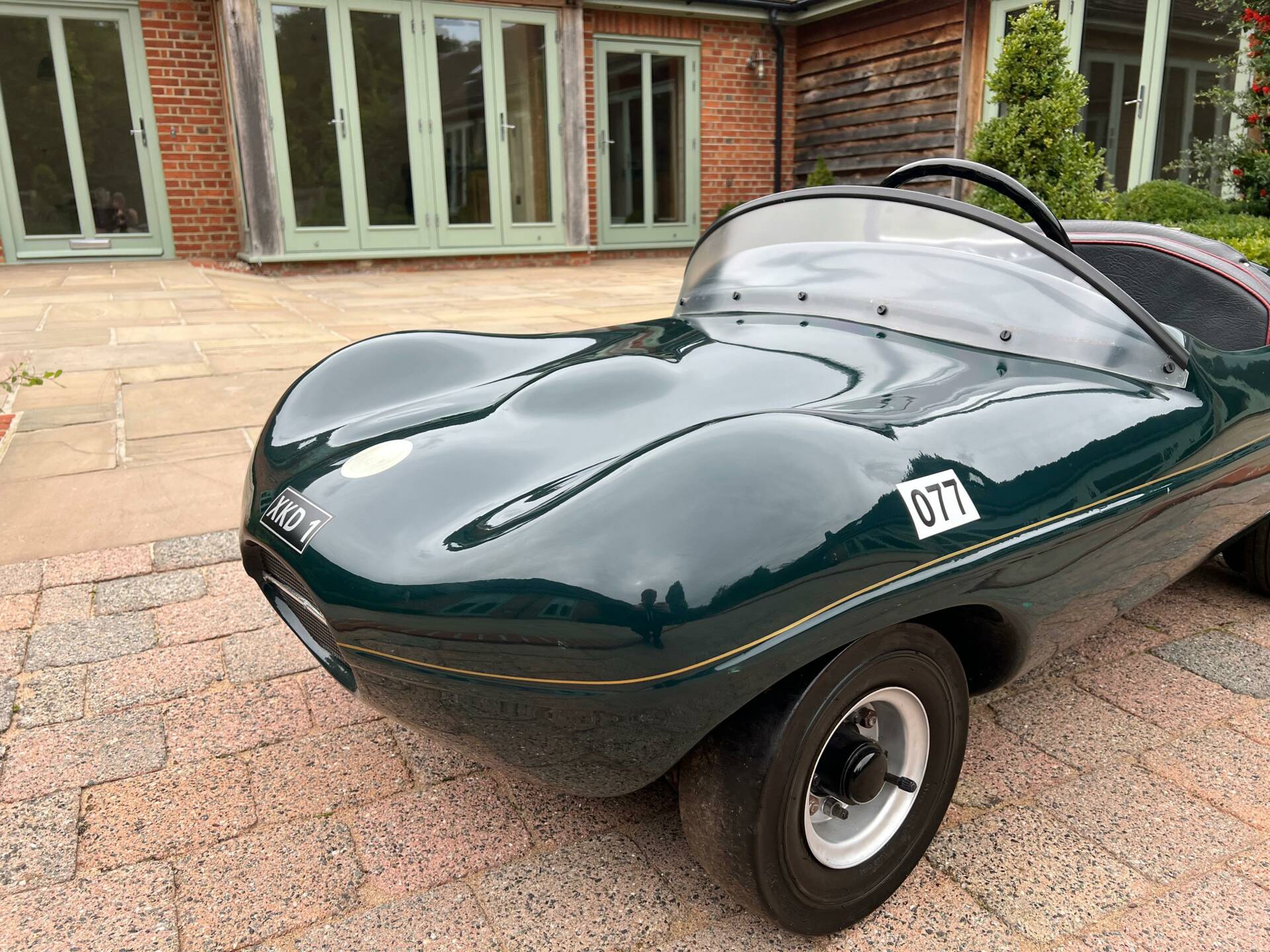 Dating from early 1960s and built by Watsonian, this example comes complete with dashboard plaque giving body no as CC90. It is powered by a 75cc engine and finished in British racing green with a black seat trimmed in red piping and fully carpeted. Chain driven and cosmetically restored to a very high level, the composite body lifts up at the rear panel to access the rear mounted engine. Wearing XKD 1 number and decals including 077, it sits on pneumatic 3.5x5 tyres which are in very good condition on metal hubs. Sit your favourite (or any) child on the padded seat with a three spoke metal steering wheel and you're sure to be the most popular parent/grandparent. Equally this would look fantastic in any collection especially one that boasts Jaguars of course. Consigned by Mathew Priddy