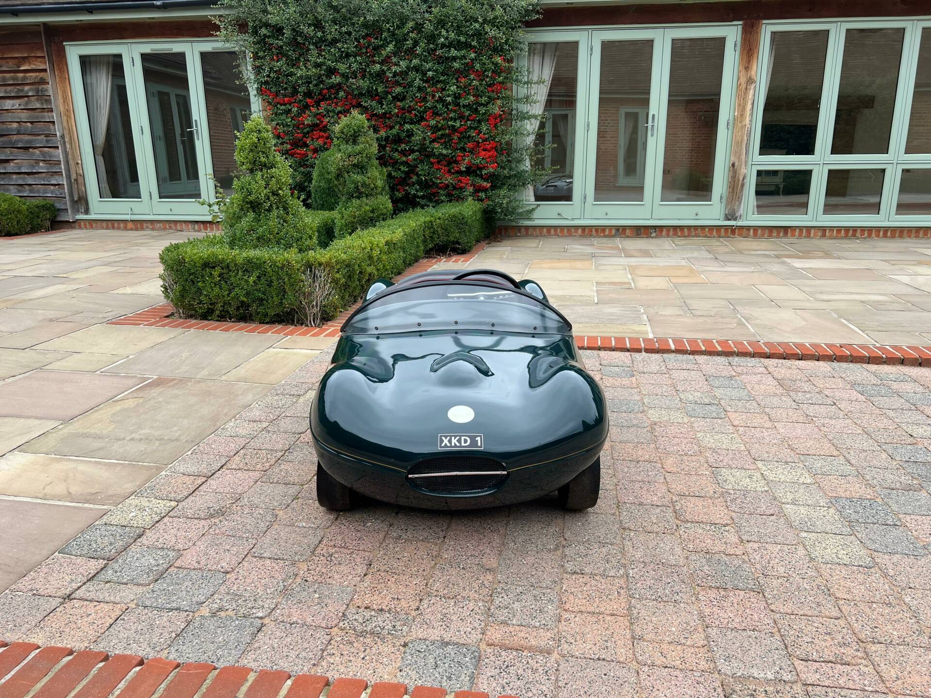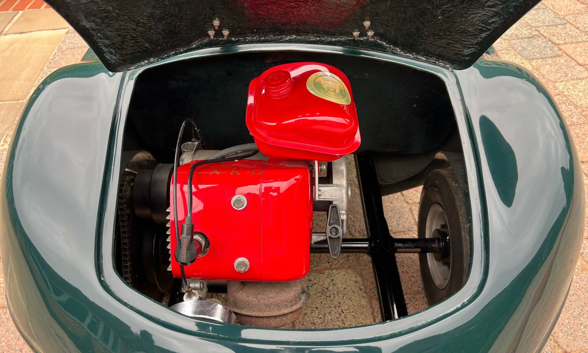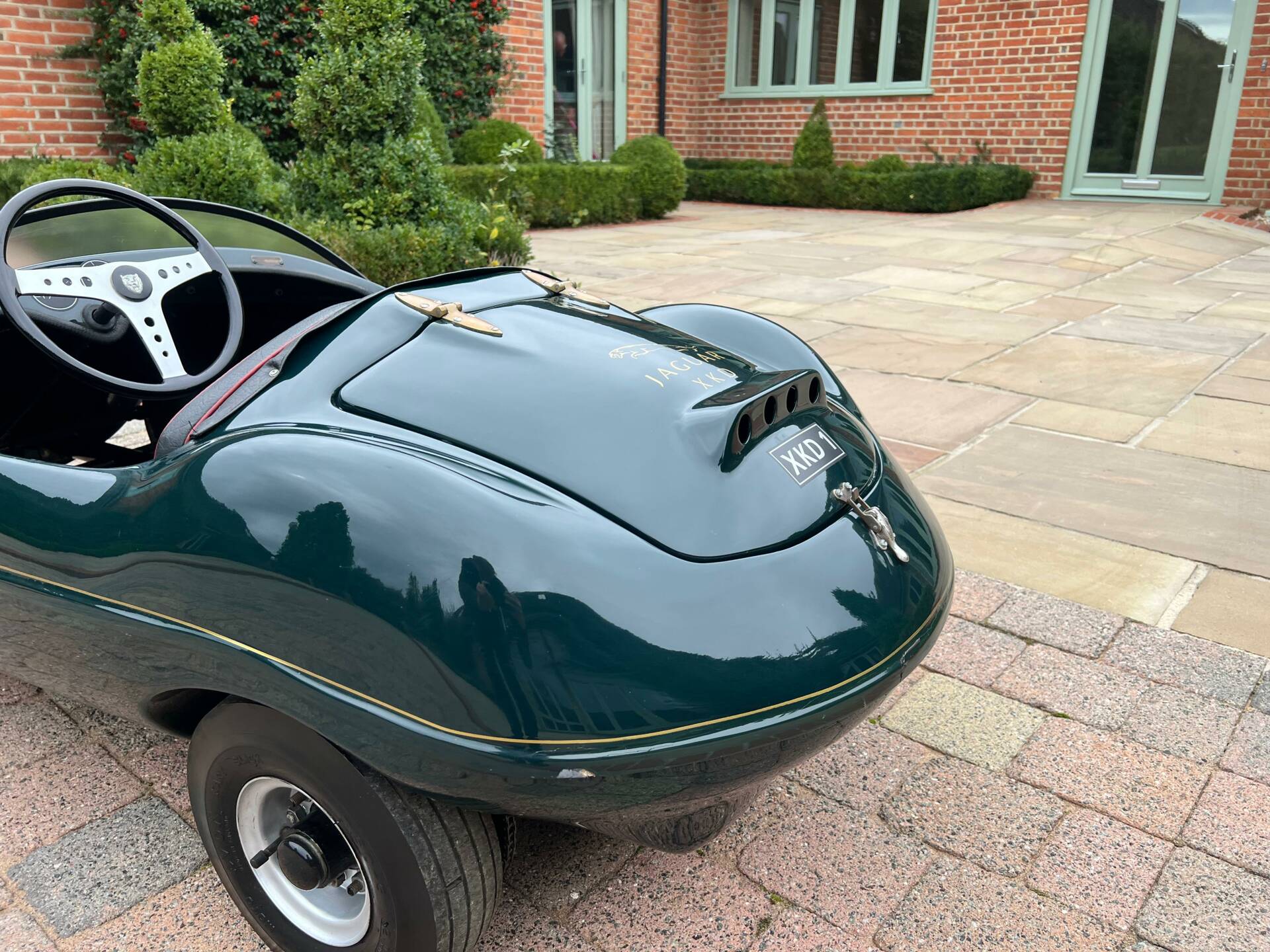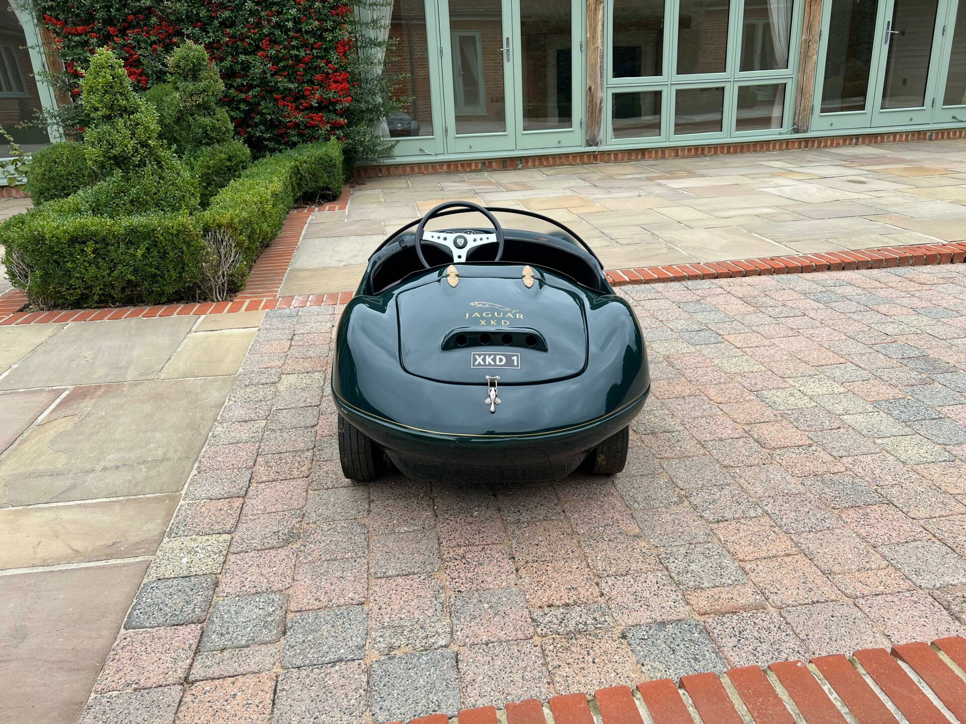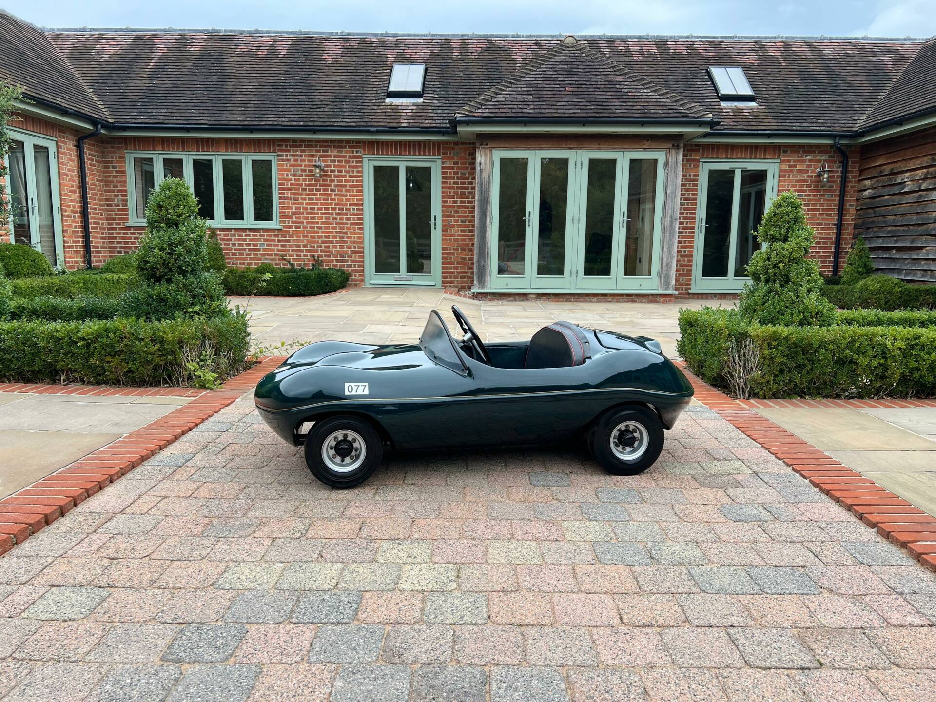 Dating from early 1960s and built by Watsonian, this example comes complete with dashboard plaque giving body no as CC90. It is powered by a 75cc engine and finished in British racing green with a black seat trimmed in red piping and fully carpeted. Chain driven and cosmetically restored to a very high level, the composite body lifts up at the rear panel to access the rear mounted engine. Wearing XKD 1 number and decals including 077, it sits on pneumatic 3.5x5 tyres which are in very good condition on metal hubs. Sit your favourite (or any) child on the padded seat with a three spoke metal steering wheel and you're sure to be the most popular parent/grandparent. Equally this would look fantastic in any collection especially one that boasts Jaguars of course. Consigned by Mathew Priddy