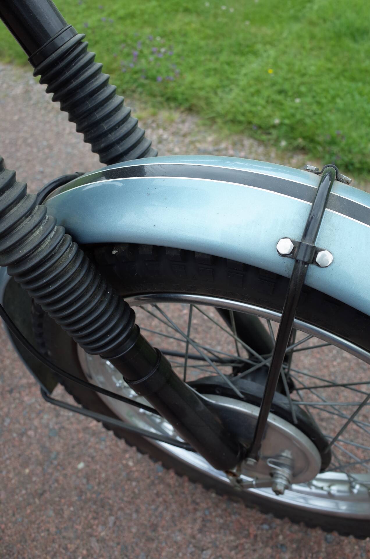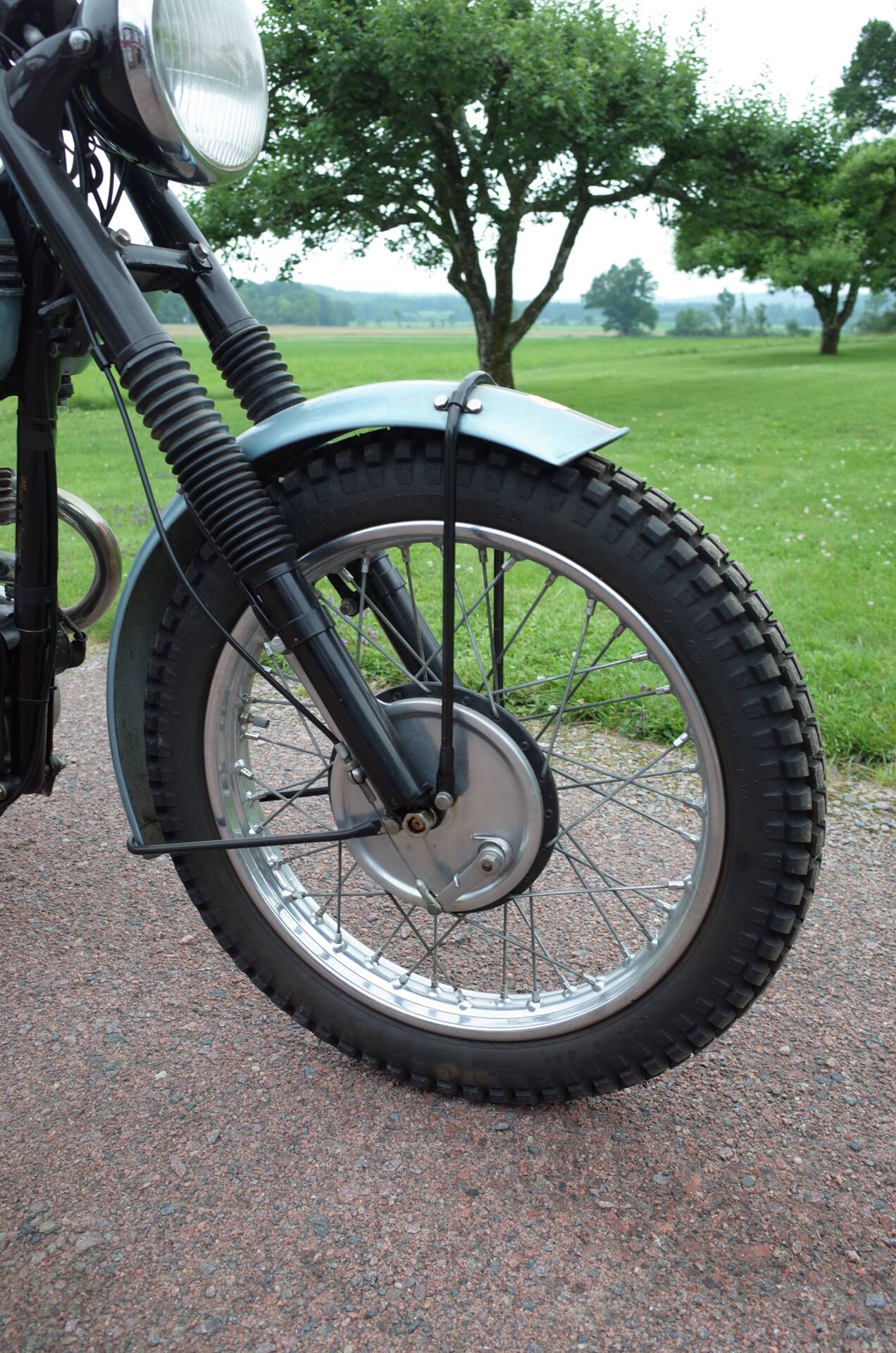 The TR5 Trophy is powered by a responsive 500cc twin-cylinder four-stroke engine, designed to deliver strong low-end torque and dependable performance across varied terrain. The high-level two-into-one exhaust system, both practical and visually striking, reflects its competition heritage, offering improved ground clearance for trials and off-road riding. Lightweight, mechanically straightforward, and robustly constructed, the TR5 earned its reputation for reliability and tractable performance in demanding conditions.
