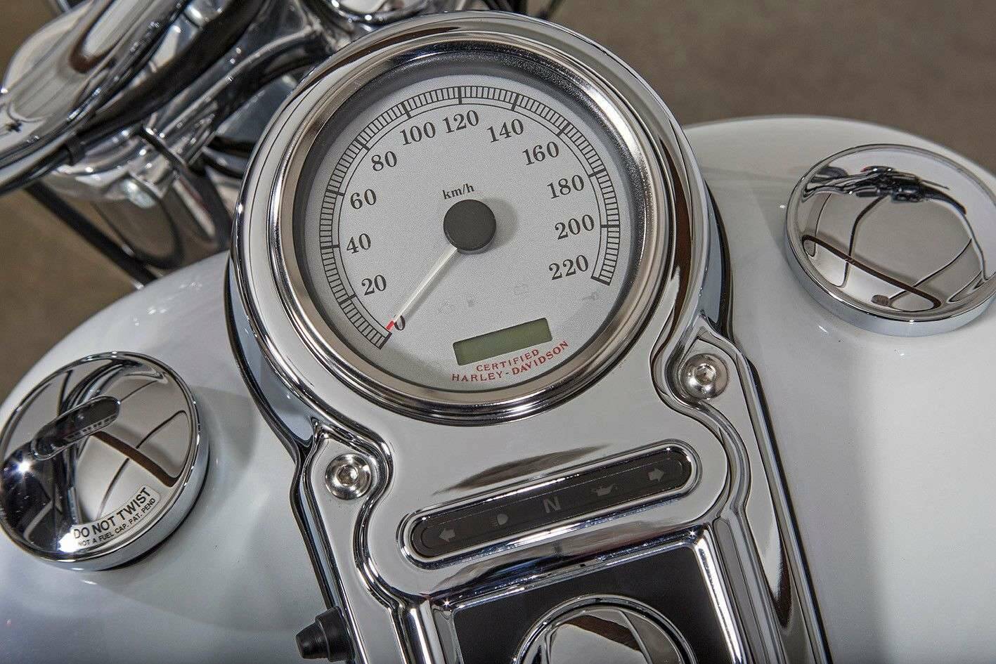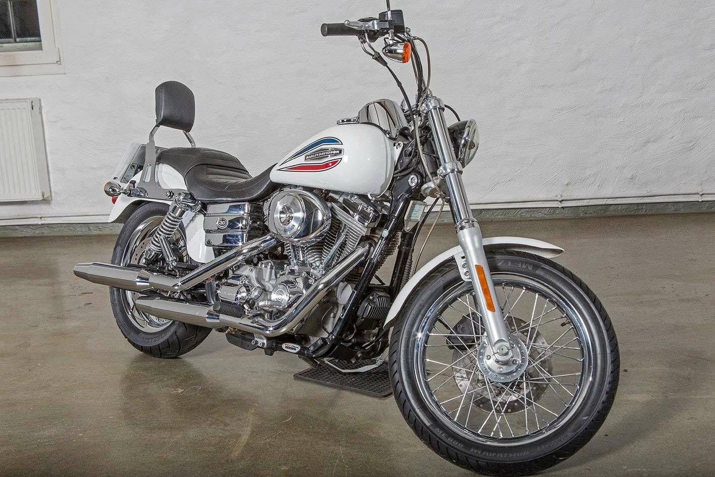 Harley-Davidson FXDI 35th Anniversary Super Glide Mit dem limitierten Sondermodell FXDI 35th Anniversary Super Glide feiert Harley-Davidson 2006 den 35. Geburtstag einer Ikone amerikanischen Motorrad-Designs: Die ursprüngliche rot-weiß-blaue FX Super Glide entwarf Willie G. Davidson zum Modelljahr 1971. Mit der Lackierung in Glacier White Pearl und den verwendeten Graphics weist das Anniversary-Sondermodell klare Bezüge zum Original auf, vervollständigt durch das Metallemblem mit dem unsterblichen Number One Logo auf dem Tank. Sonderembleme und eine Zweipersonen-Sitzbank mit Rippenmuster komplettieren das Nostalgiepaket. Die Fertigung ist strikt auf eine Auflage von 3.500 nummerierten Exemplaren begrenzt. Harley-Davidson FXDI 35th Anniversary Super Glide Daten: Schwingungsentkoppelter Twin Cam 88 Motor mit ESPFI Silberfarben pulverbeschichteter Motor mit verchromten Abdeckungen Verchromte Staggered Shorty Dual Auspuffanlage Neues Cruise Drive Sechsgang-Getriebe Neue Telegabel mit 49 Millimeter Standrohrdurchmesser Gabelwinkel 29 Grad, Lenkkopfwinkel 29 Grad Pullback-Lenker Fat Bob Tank Lederbezogene Tankkonsole mit integriertem Tachometer Mittig montierte Fußrastenanlage Zweipersonen-Sitzbank mit Rippenmuster Verchromte Batterieabdeckung Verchromte Leichtmetall Profile Drahtspeichenräder Neuer, tief heruntergezogener Heckfender Neuer 160 Millimeter breiter Hinterreifen Verchromte Abdeckung für Zahnriemen, vordere Riemenscheibe, Elektrik und Zündspulen Anniversary Tankembleme Anniversary Number One Logo auf dem Tank Anniversary Label auf Luftfilter- und Batteriegehäuse Rot-weiß-blaue Farbkombination mit Zierstreifen auf Front- und Heckfender Limitierte Auflage von 3.500 nummerierten Einheiten Diebstahlwarnanlage mit Wegfahrsperre serienmäßig