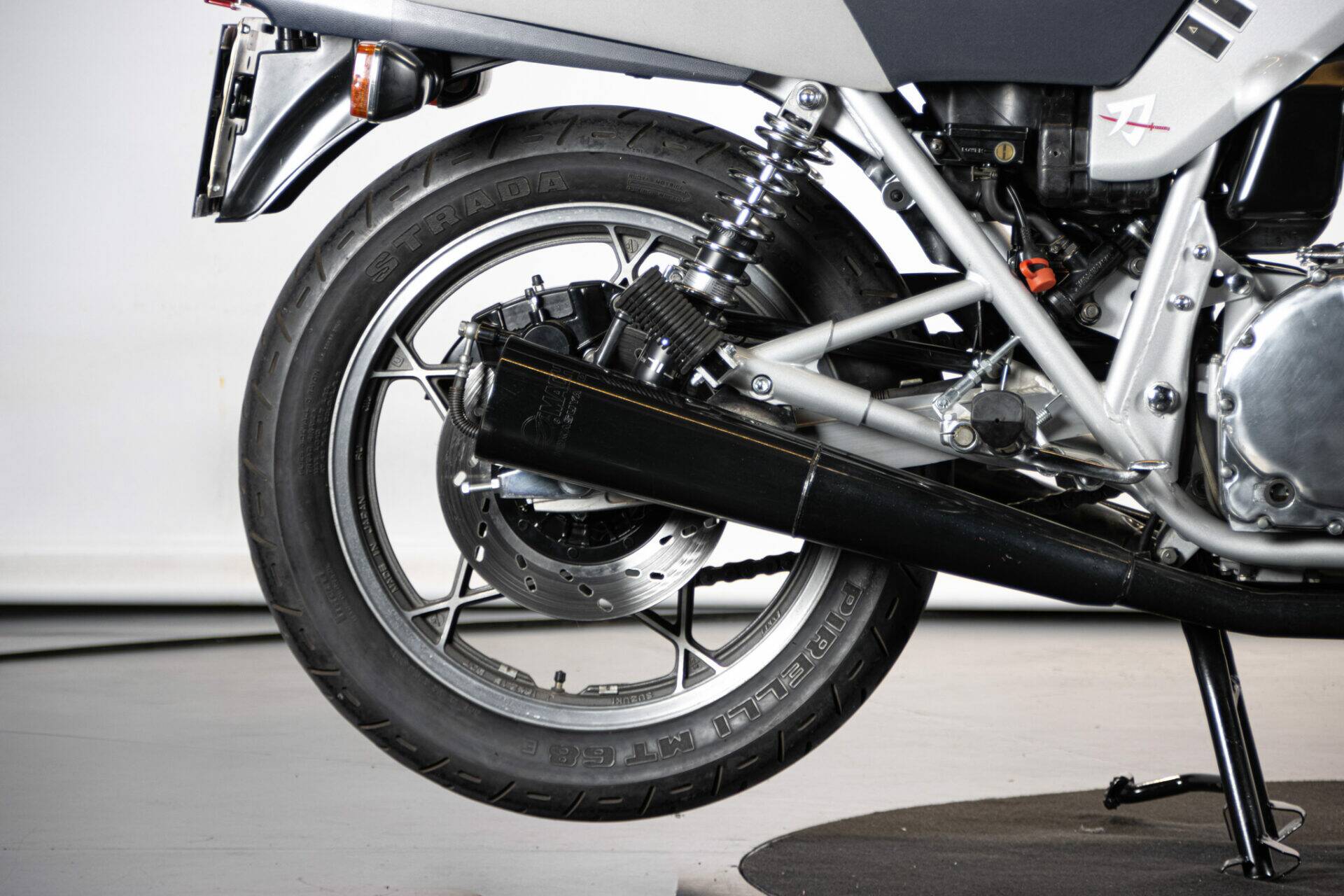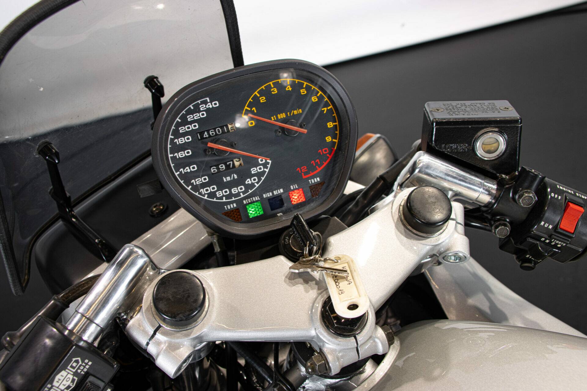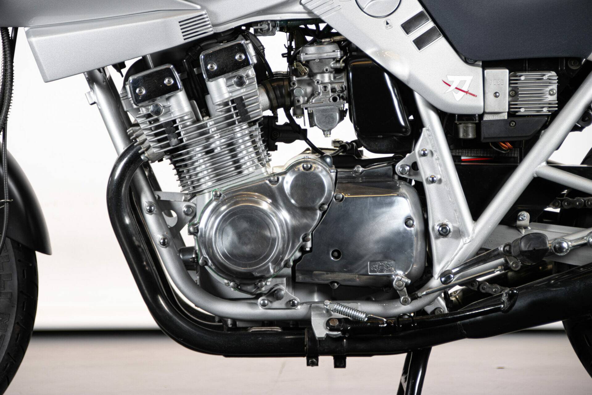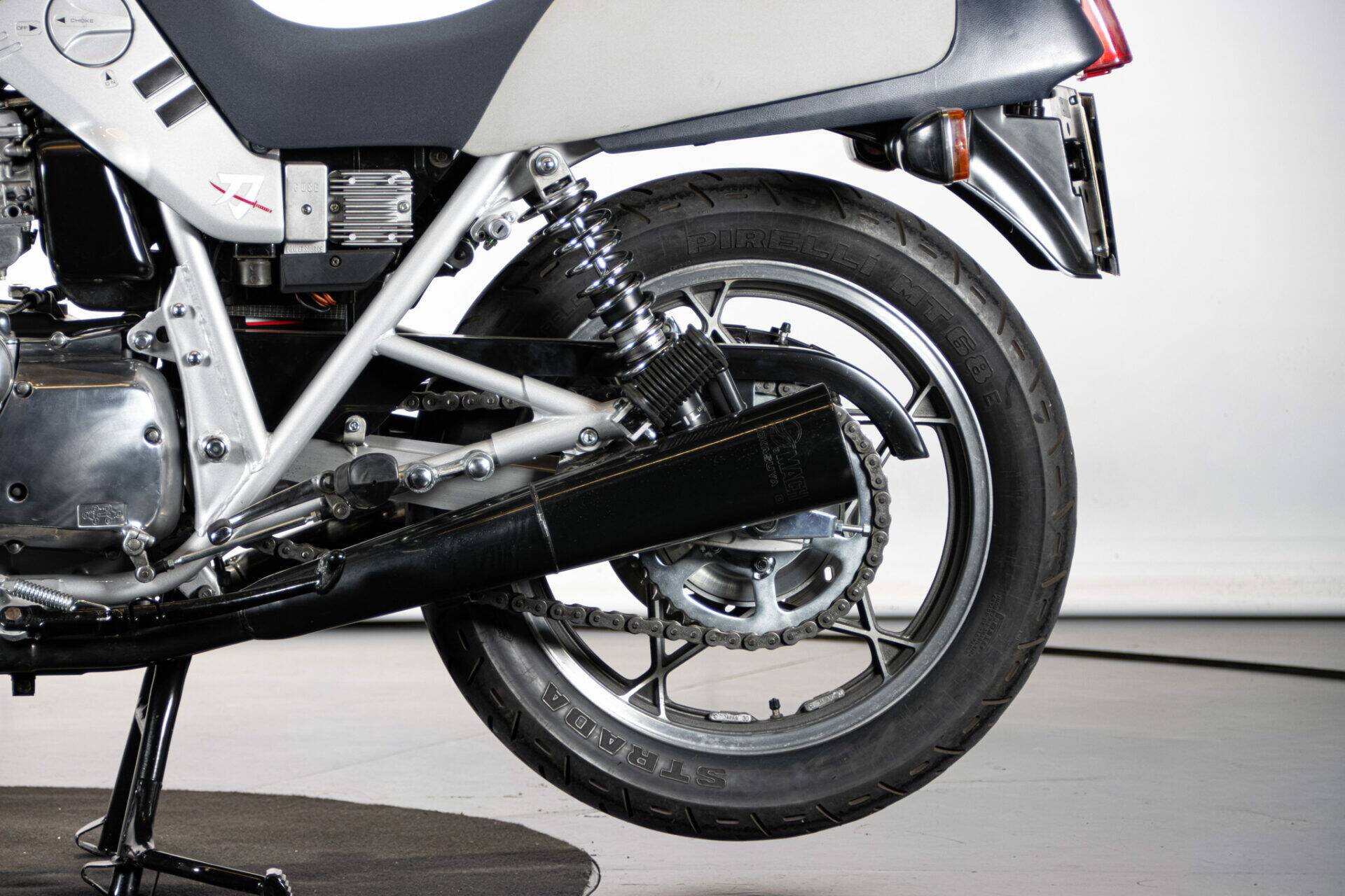 The Suzuki Katana (which takes its name from the Samurai swords) was unveiled at the Cologne Motor Show in 1980. Designed by car engineers, its very modern shape was innovative for its time. The headlight grille stands out, while the tank is coupled to the sides and the saddle, the seat is pushed far back and shaped to allow a sporting ride, while the handlebar is lowered and tilted. The 1982 Katana has greater power (111 hp at 8,500 rpm), making it an extremely fast bike. It has a four-cylinder, 16-valve, 1074 cc engine.