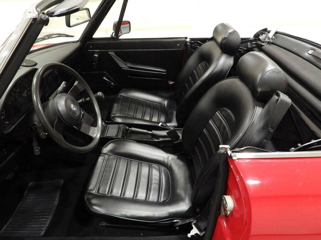 Black seats and sky panels, black wool carpeting, three-spoke steering wheel, Alfa Romeo Vitaloni double electrically adjustable door mirrors, black canvas hood, steel wheels with 185/70 R14 tires.