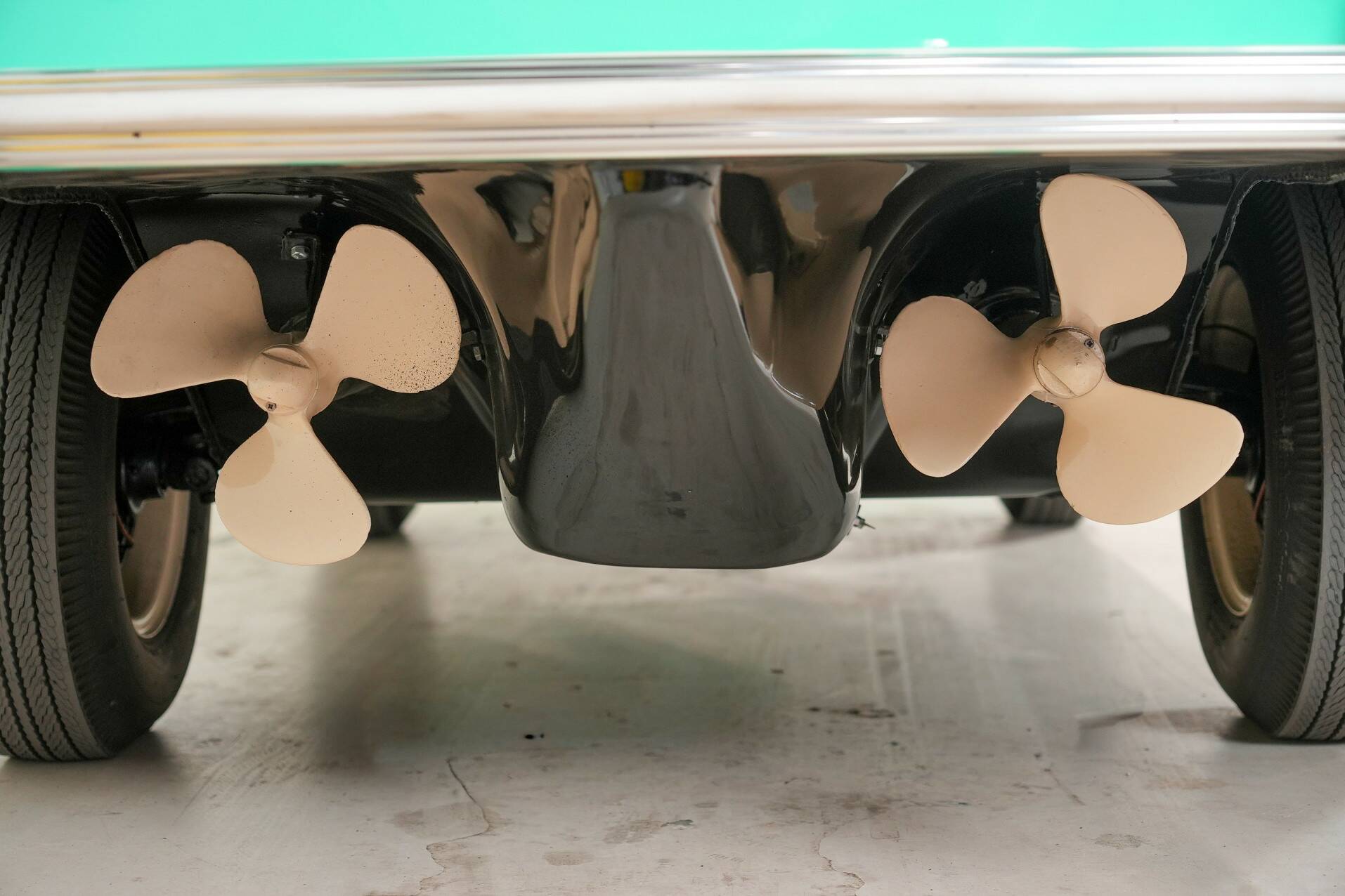 The Amphicar is a unique chapter in automotive history. It's a car that can sail and drive, but it's a compromise. It's a boat that doesn't handle water optimally, and a car that isn't among the best road-going. It's made of considerably thicker steel and therefore somewhat heavier. It has two propellers and steers with the front wheels. Any incoming water can be drained with a bilge pump. The engine is from the British Triumph Herald. At the time, the Amphicar cost about the same as two Volkswagens. Approximately 3,000 were made.