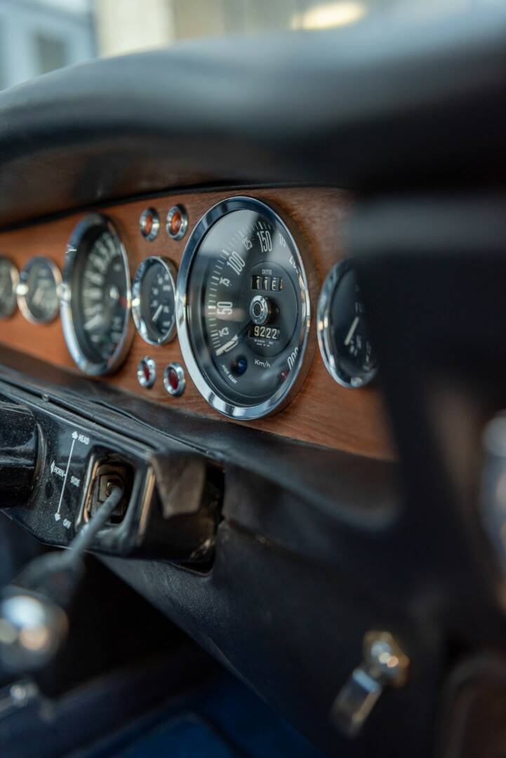 Sa sellerie d'origine en cuir bleu marine est en excellent état avec une superbe patine. Le pavillon et les moquettes sont propres ainsi que les panneaux de portes. Elle possède toujours son volant en bois d'époque.