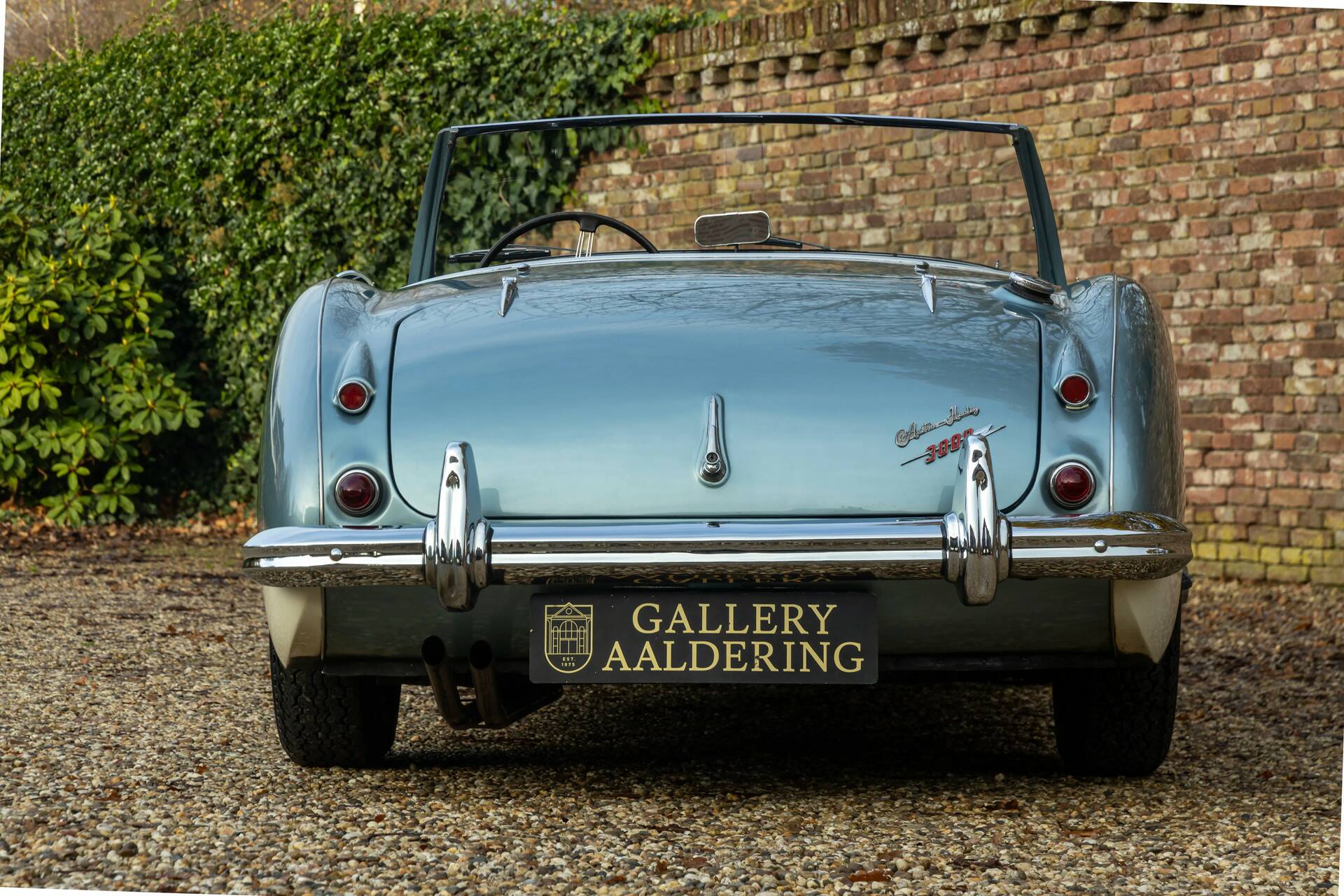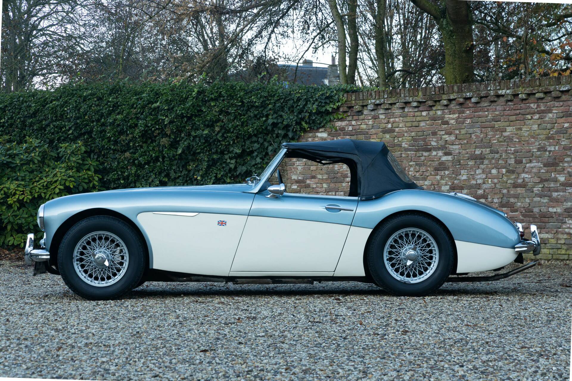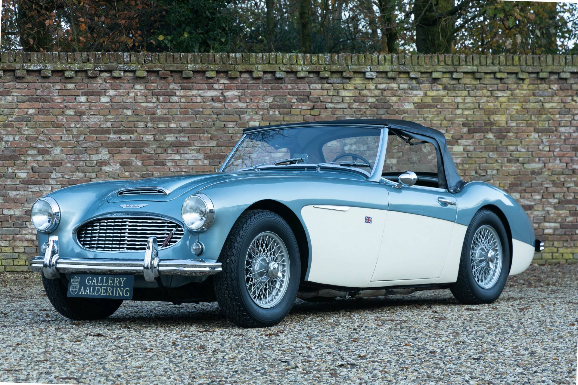 Austin Healey 3000 MKI Overdrive BN7 "Two seater" Two-seater BN7 in much-appreciated color scheme “Ice Blue over Old English White”, The condition can be described as an older restoration (1990s) and in good driving order, Factory optional extra's: Heater - Eelctrically operated overdrive - Wire spoke 'knock on' wheels, "New power-plus performance and aerodynamic lines" A two-fold triumph for Austin Healey,