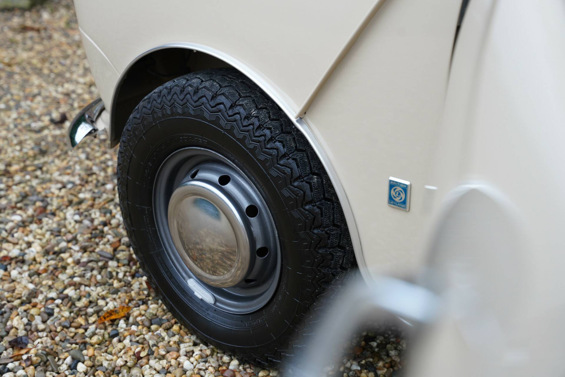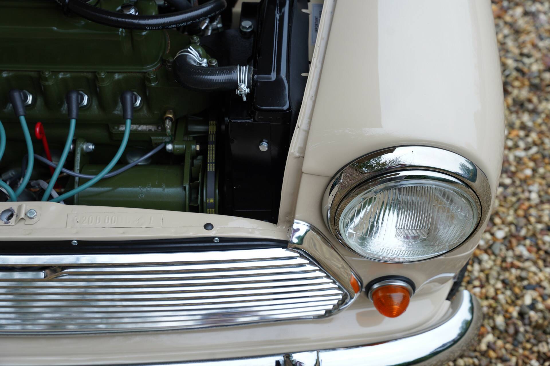 The entire car is immaculate. The exterior has been resprayed in the original color with which this Mini was delivered in 1970: Bedouin. With sleek sheet metal and beautiful chrome parts, the exterior is a beauty! The same goes for the interior. The original upholstery color, Autumn Leaf (what a beautiful name), is stunning, and everything has been completely renewed. As a result, the interior also looks magnificent.