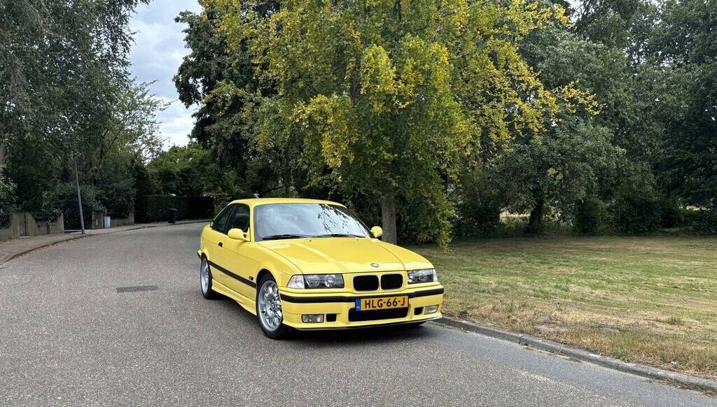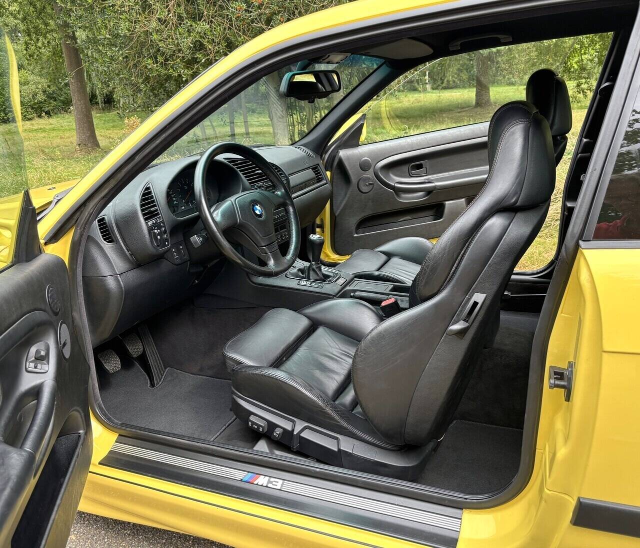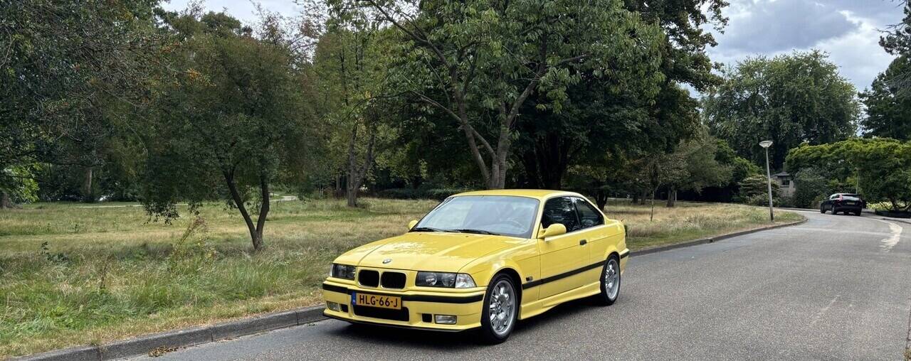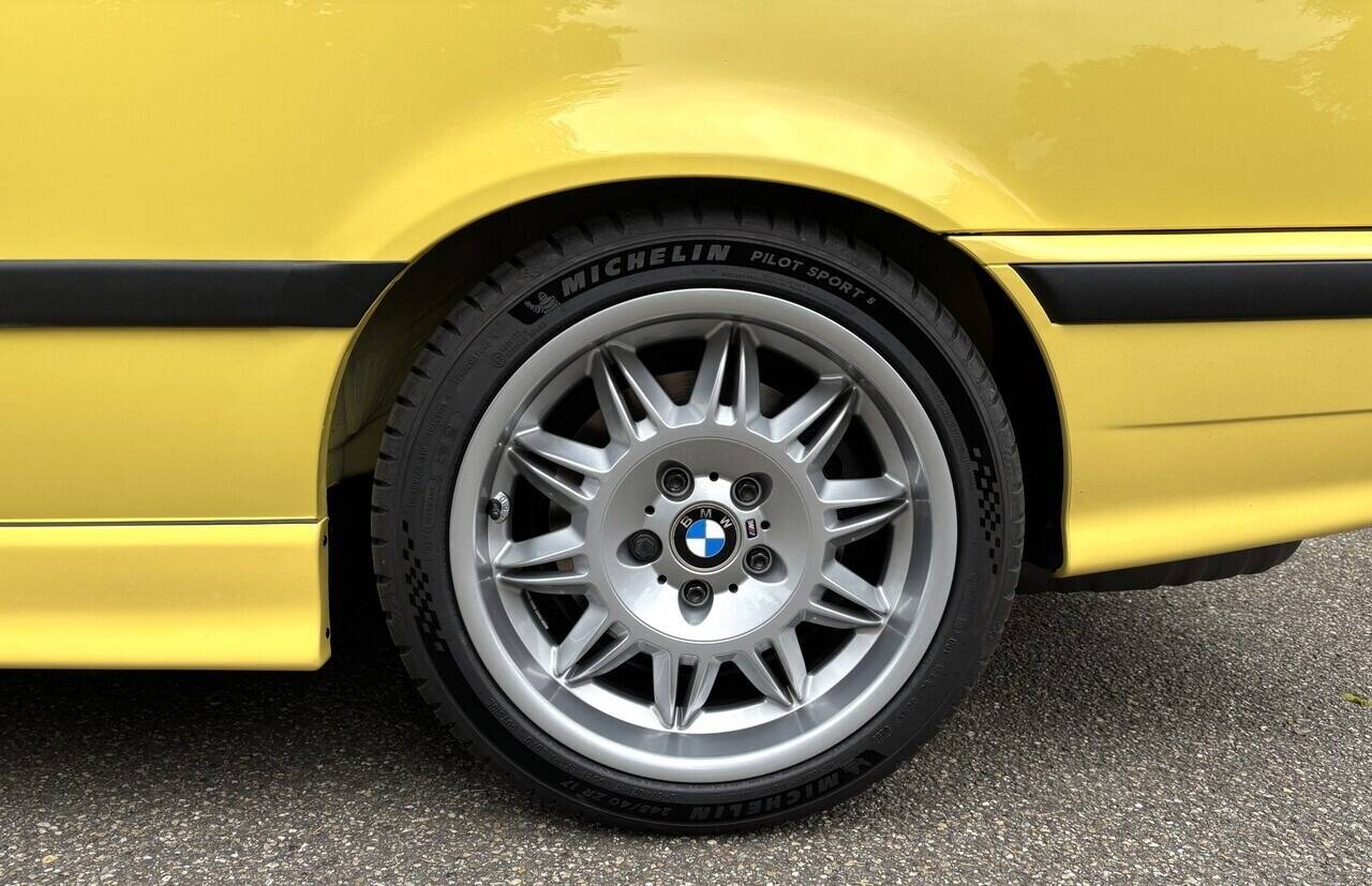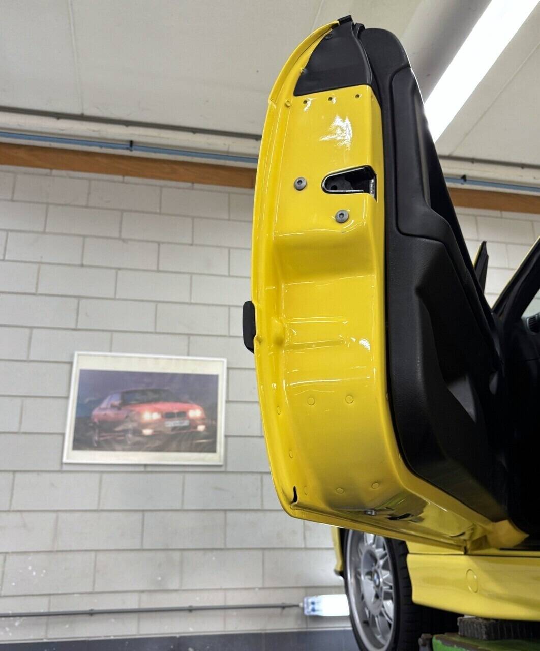 De buitenzijde is zeer strak, schadevrij en alle naadjes zijn correct. De auto is uitvoerig gepolijst en gepoetst en de lak is super glad. De body staat voor 90% in de originele lak. Dakargelb is de M3 introductiekleur, dus deze kleur heeft toen in alle autobladen gestaan. Sowieso zijn er maar een paar "echte" E36 M3 kleuren en dat zijn Dakargelb en Estorilblau. Dat zijn nu de geliefde en gezochte kleuren. De originele M3 velgen zien er uit als nieuw en zijn voorzien van de correcte Michelin Pilote Sport banden. Op de buitenspiegels zitten nog de originele stickertjes uit de fabriek!