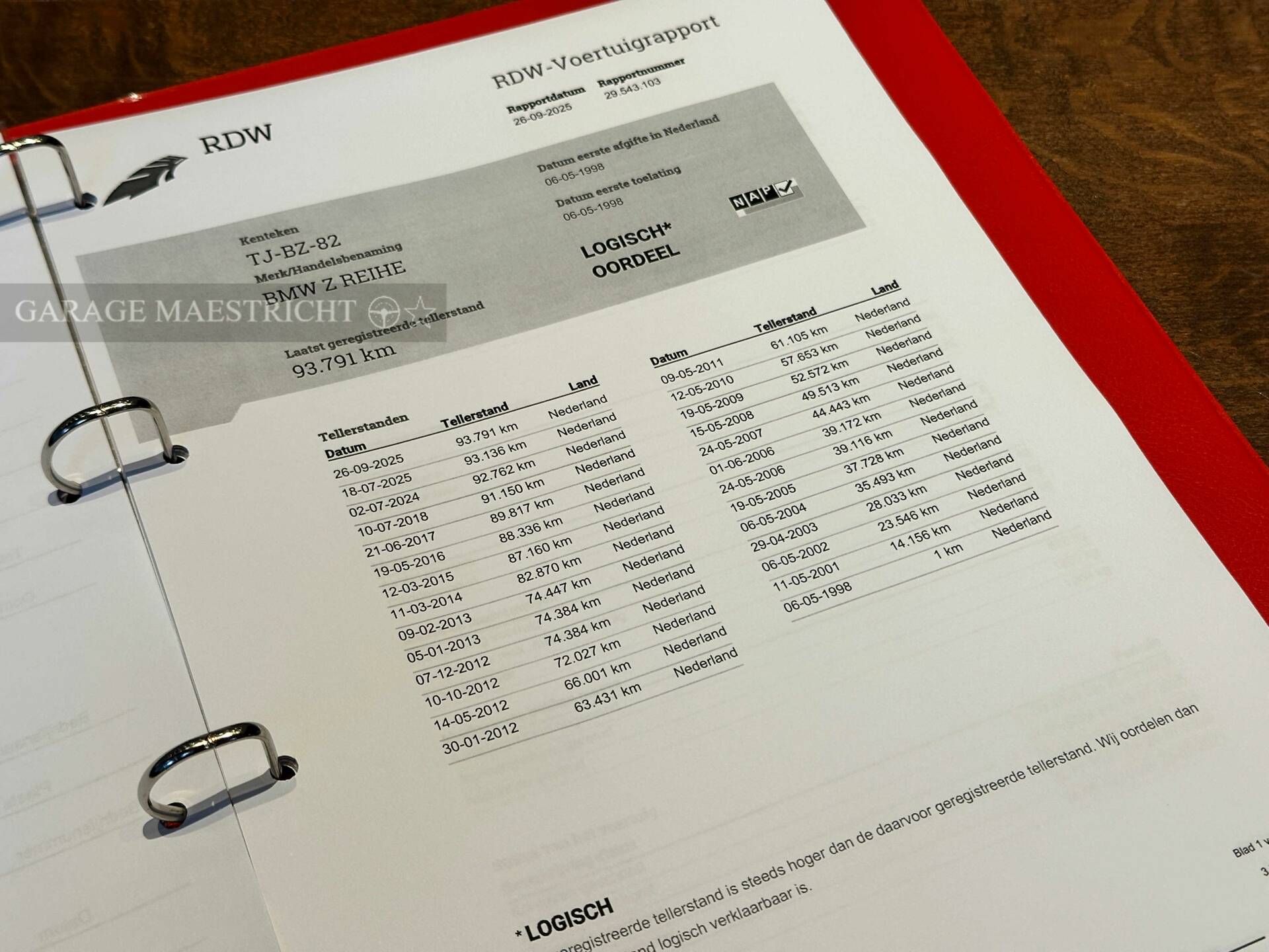This Z3 2.8 Wide-Body is fitted with the fabled M52 six-cylinder engine mated to the sought-after Manual 5-speed gearbox. It was first registered on the 6th of May 1998 with registration TJ-BZ-82, the registration it still bears today! Today, this original Dutch delivered car has a warranted mileage of just over 94.000 km's. Finished in timeless Arktissilber Metallic (309/7) over a striking Red/Black Oregon full leather interior with original and highly sought-after Sports Seats, this Z3 was generously specified by its first enthusiast owner. Factory options include, but are not limited to: