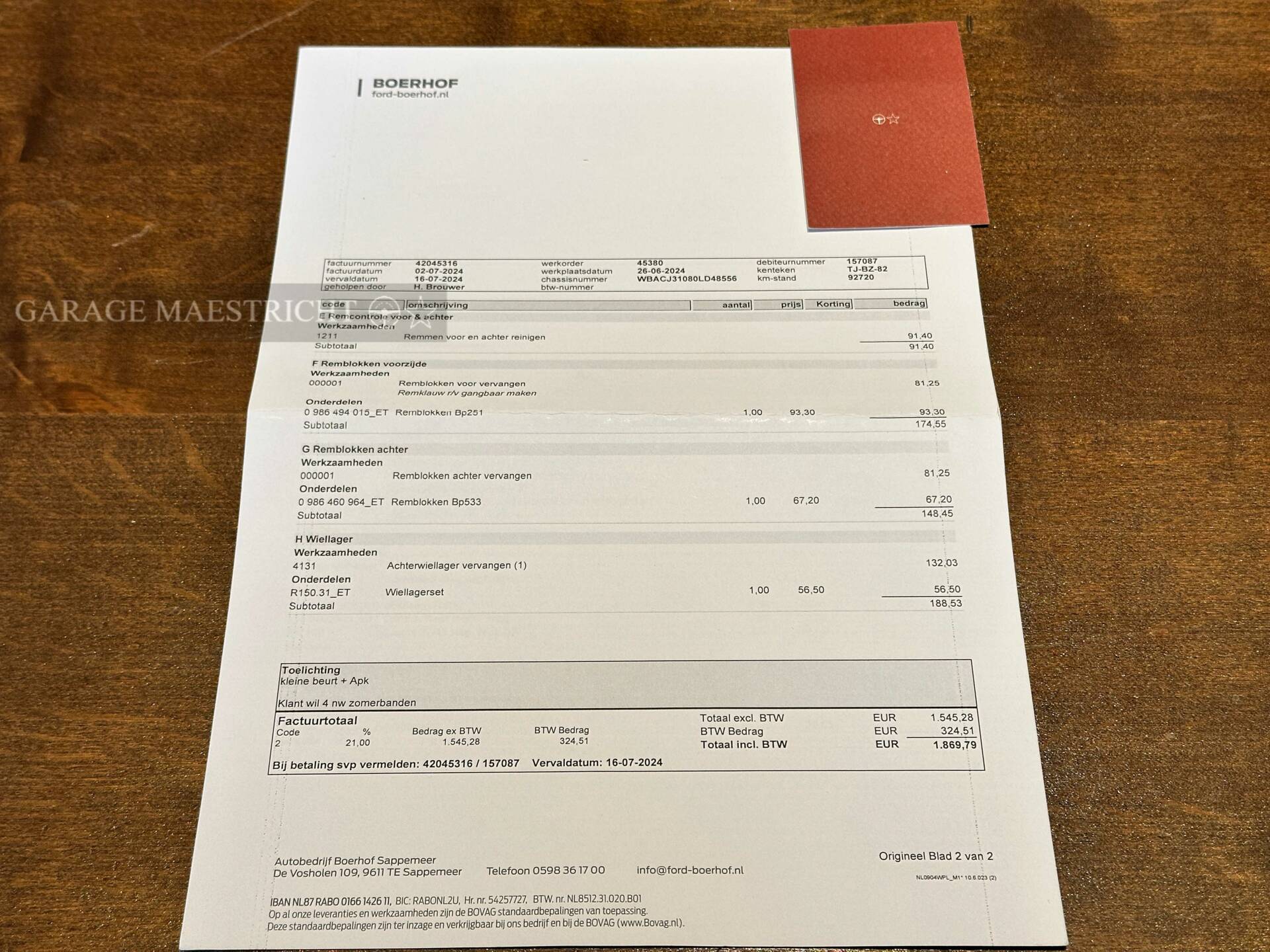 In addition, it now wears rare & coveted 17" E36 M3 wheels (1st gen). This Z3 presents in immaculate condition throughout, still wearing its original paint (see paint depth images) and showing only minimal signs of age. The leather is still beautifully supple and rich of colour, the leather on the dashboard hasn't shrinked nor teared due to UV lighting (typical Z3 gremlin) - even the Red velours mats are still vibrant and fresh. It has always been carefully garaged and consistently maintained, with a continuous BMW service history and supporting invoices. The most recent service was completed in June 2024 at a cost of €1,869.79 incl. VAT (which consisted of: new brake pads all round, new rear wheel bearing, MOT, 4x new Michelin Pilot Sport 4 tires, oil + filter, sump ring, and brake fluid flush.The car comes complete with all original accessories & documentation: two sets of keys, complete toolkit, tonneau cover, matching hardtop, BMW booklets, service records and period registration papers. Quite simply, what didn’t come with this Z3 when new, isn’t missing today.