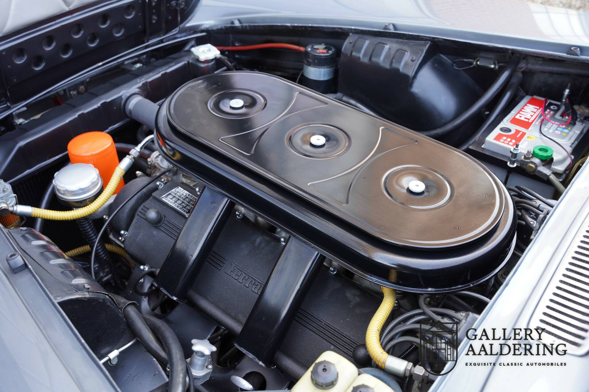 The stylish gray 330 GT you see here dates from 1965. 'Grigio Fumo' not only looks great on the Ferrari, it is also the color in which the car left the factory. The body is in a beautifully restored condition with beautiful panel fittings and beautiful even seams between the sheet metal. The paintwork is in excellent condition and the same applies to chrome parts, as well as rubbers, windows and lighting parts. The beloved Borrani wheels are also very beautiful.