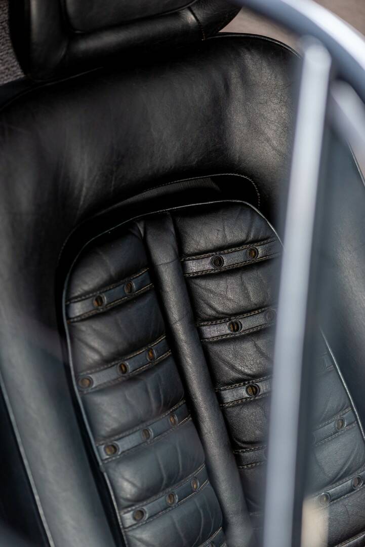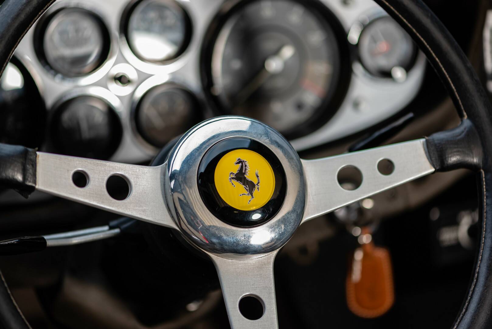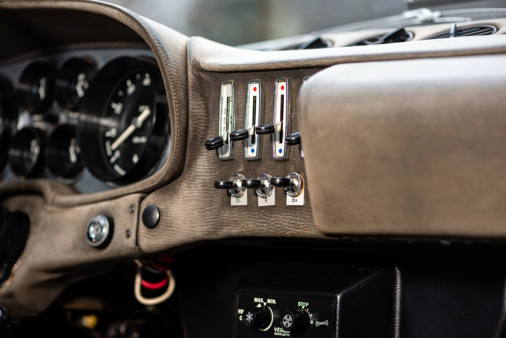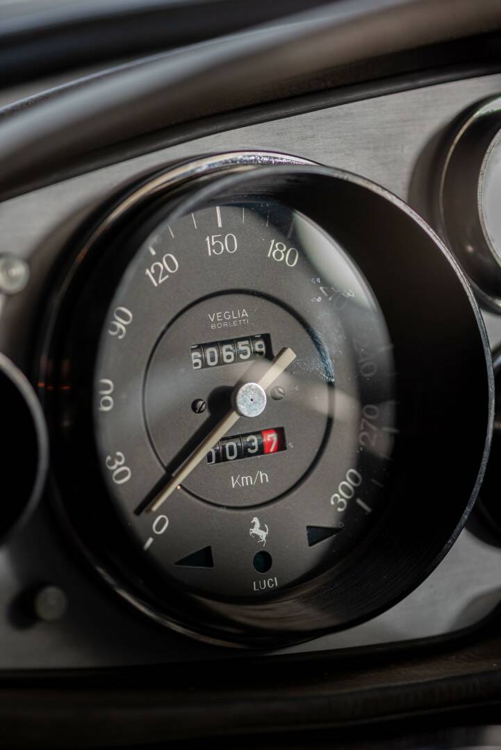 Cette Daytona conserve 100 % de sa sellerie d’origine, incluant sièges, moquettes, ciel de toit et tableau de bord, tous en excellent état, ce qui est rare pour une Ferrari de 52 ans.