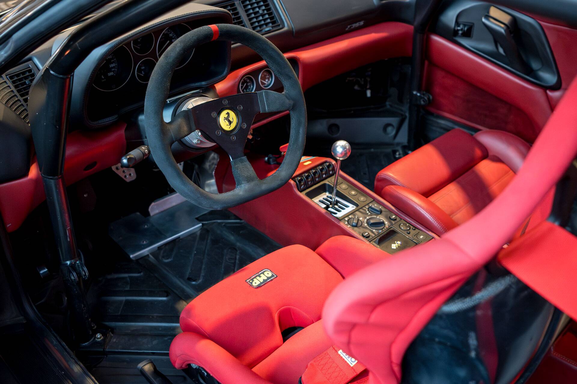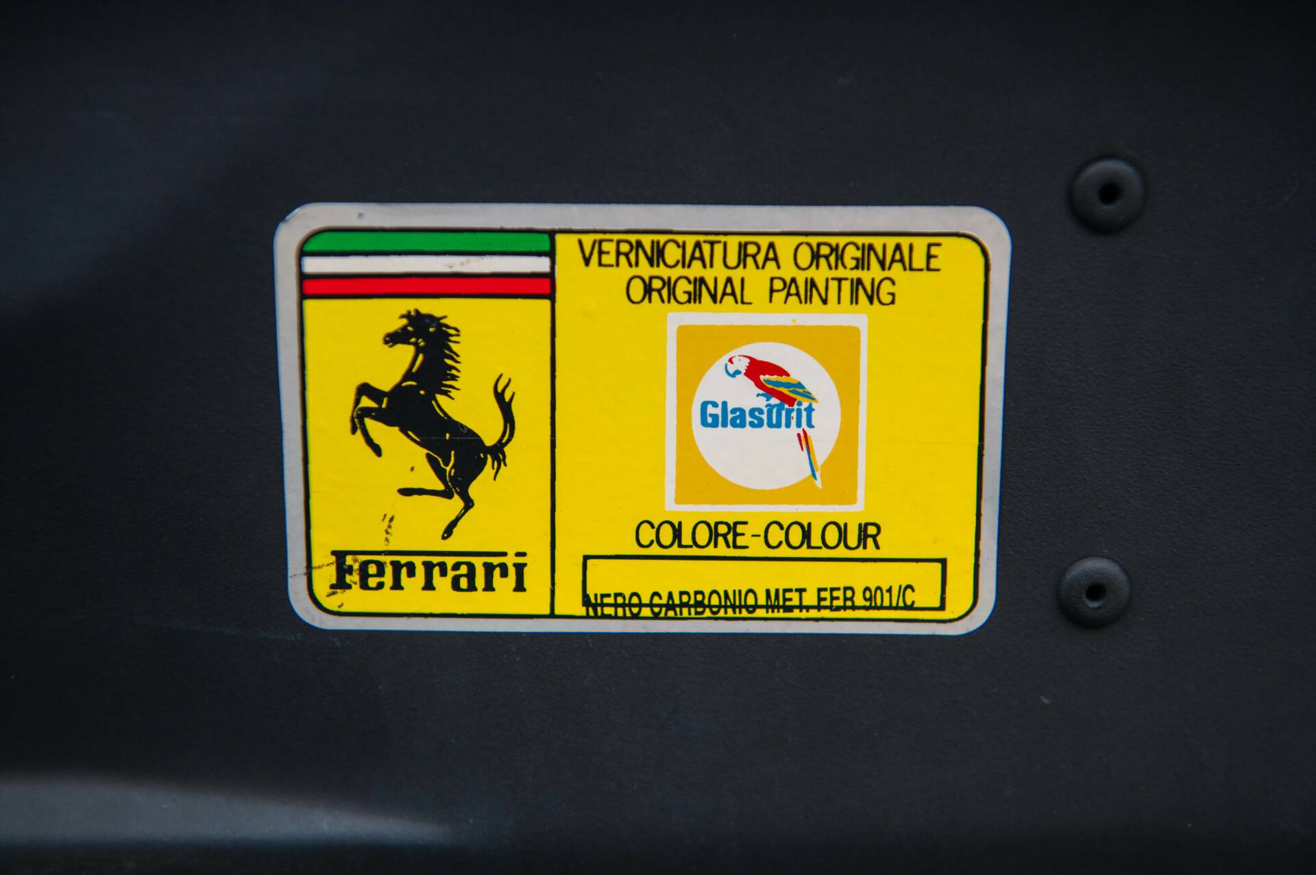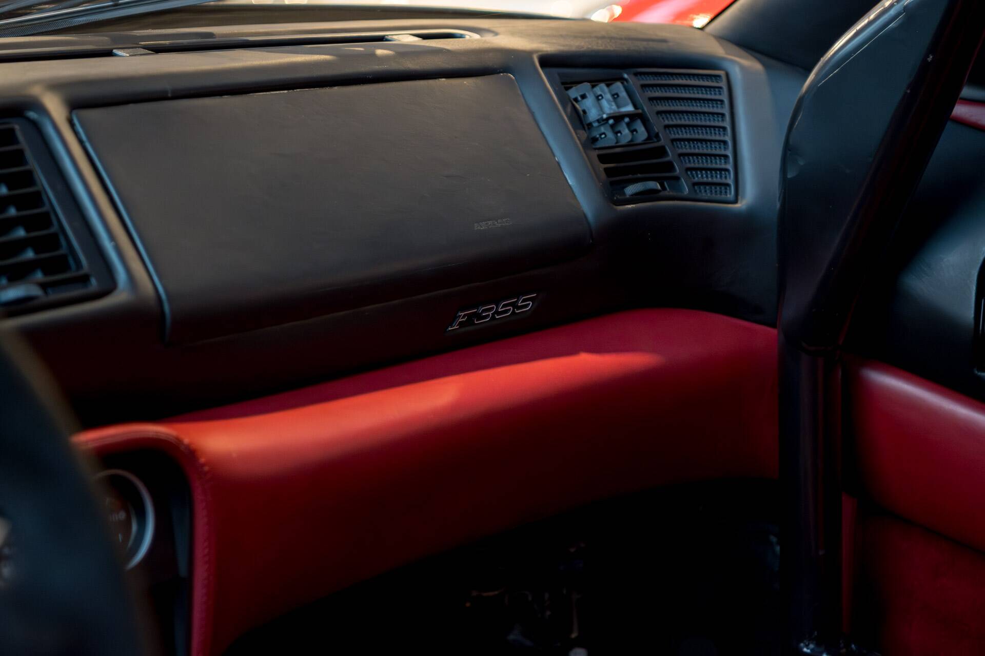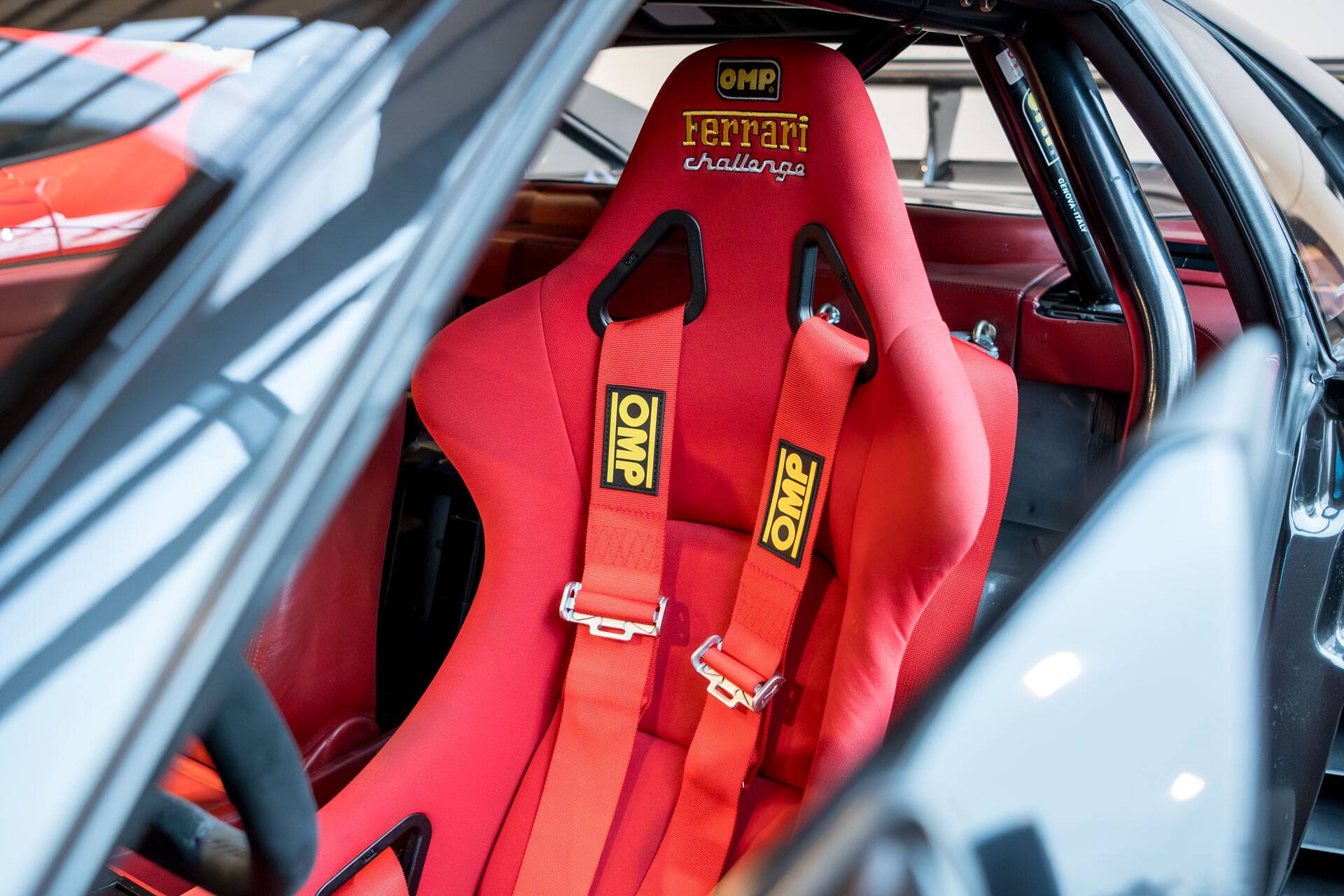 Ce qui distingue véritablement cette voiture, c’est son niveau d’originalité exceptionnel, avec une quantité remarquable de détails conformes à l’origine, rarement observés aujourd’hui sur des F355 Challenge. Elle conserve ses jantes en magnésium Speedline Corse correctes, avec les bons codes et autocollants d’origine encore visibles à l’intérieur, ainsi que tous les éléments spécifiques Challenge tels que prévus à l’origine : l’extincteur, le coupe-circuit moteur, l’anneau de remorquage correct, les attaches rapides arrière et la grille arrière Challenge noire appropriée. Toutes les vitres sont toujours en verre Ferrari SIGLA d’origine avec logos, y compris la lunette arrière portant le numéro de châssis gravé. L’arceau de sécurité OMP d’origine est toujours en place avec ses autocollants d’époque, accompagné de harnais de sécurité OMP homologués FIA. La voiture conserve également son siège de course en carbone correct, type VID CARBON CS.665.95, dans sa sellerie rouge d’origine avec ses étiquettes intactes, associé au siège passager en cuir correct. Cette configuration mixte d’origine est aujourd’hui très rare, de nombreux exemplaires ayant été modifiés par la suite avec deux sièges confort ou deux sièges Challenge. L’état de la carrosserie est tout aussi impressionnant, exempt de corrosion et confirmé par la présence des marquages d’assemblage d’origine.
