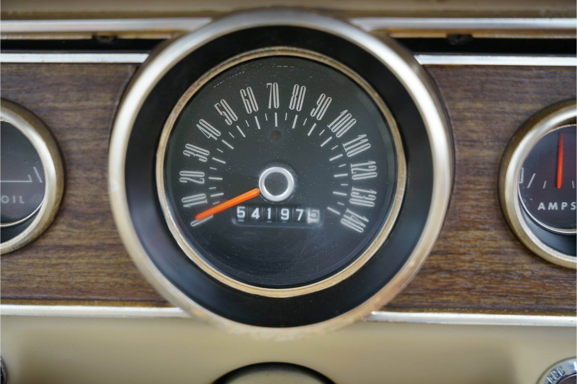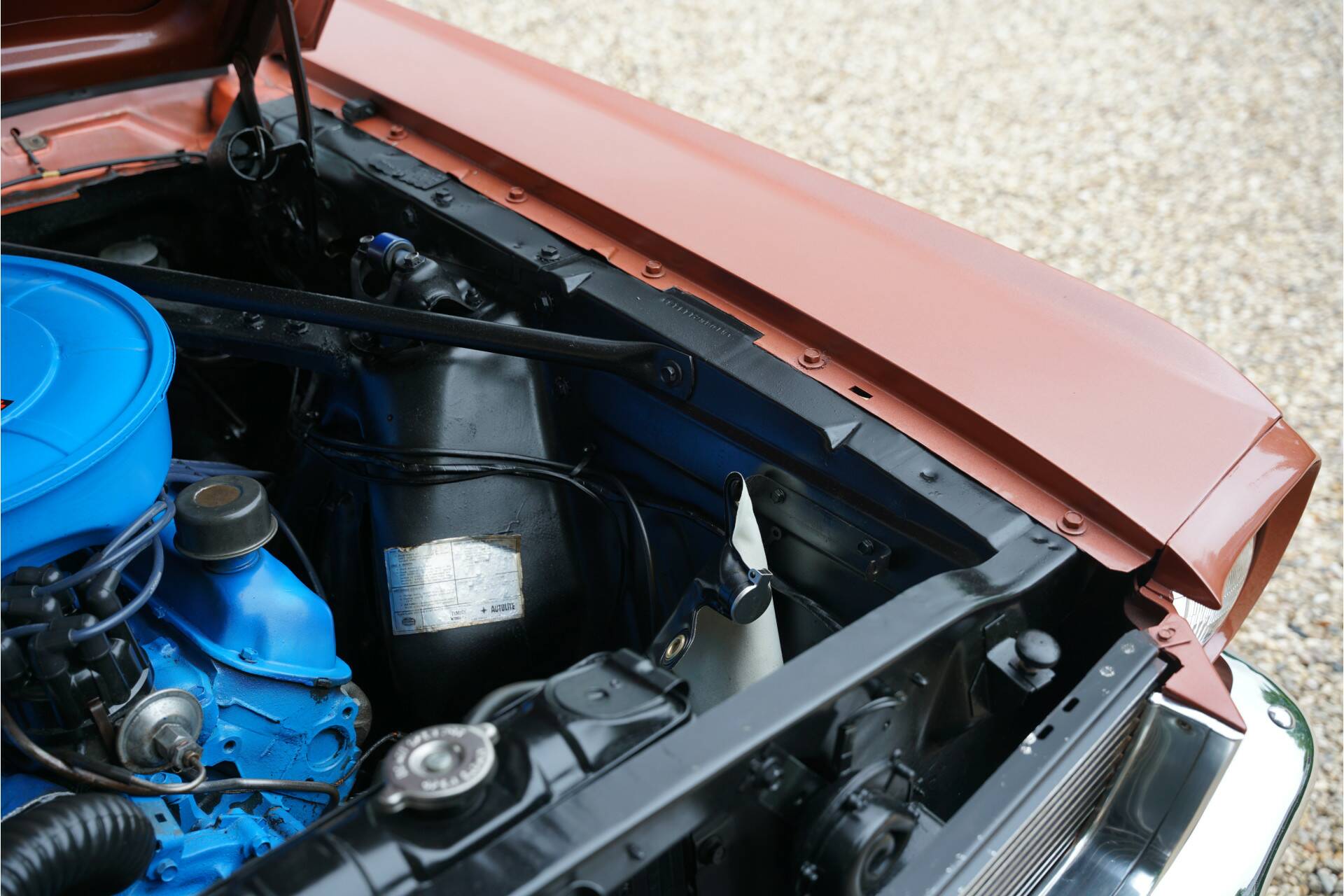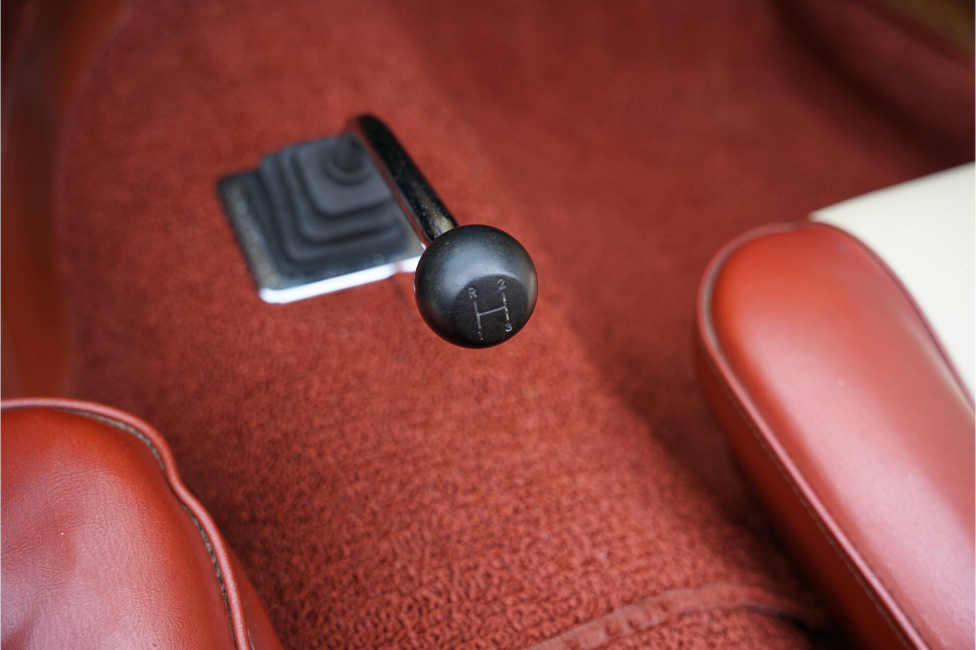 The interior is covered with beautiful brown carpets and brown and beige vinyl on the seats. The dashboard is also very original, and all instruments and controls function as they should. The newly ordered radio is, of course, still present. What is also striking is that this is a Mustang with the much-loved three-speed manual transmission.