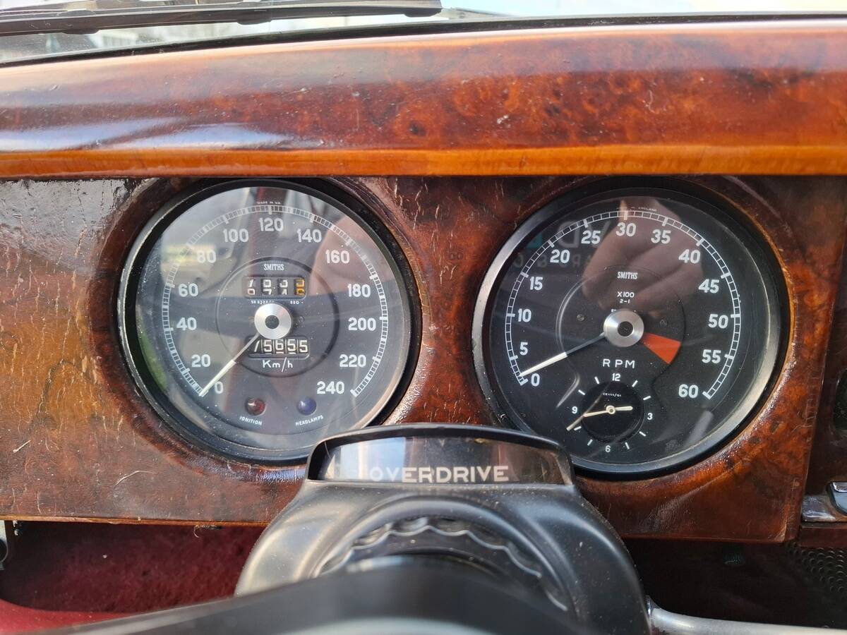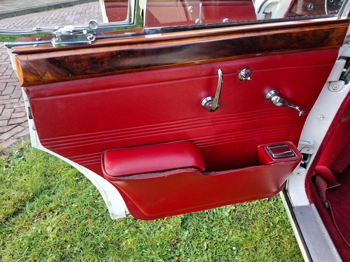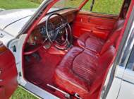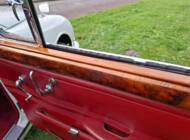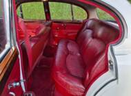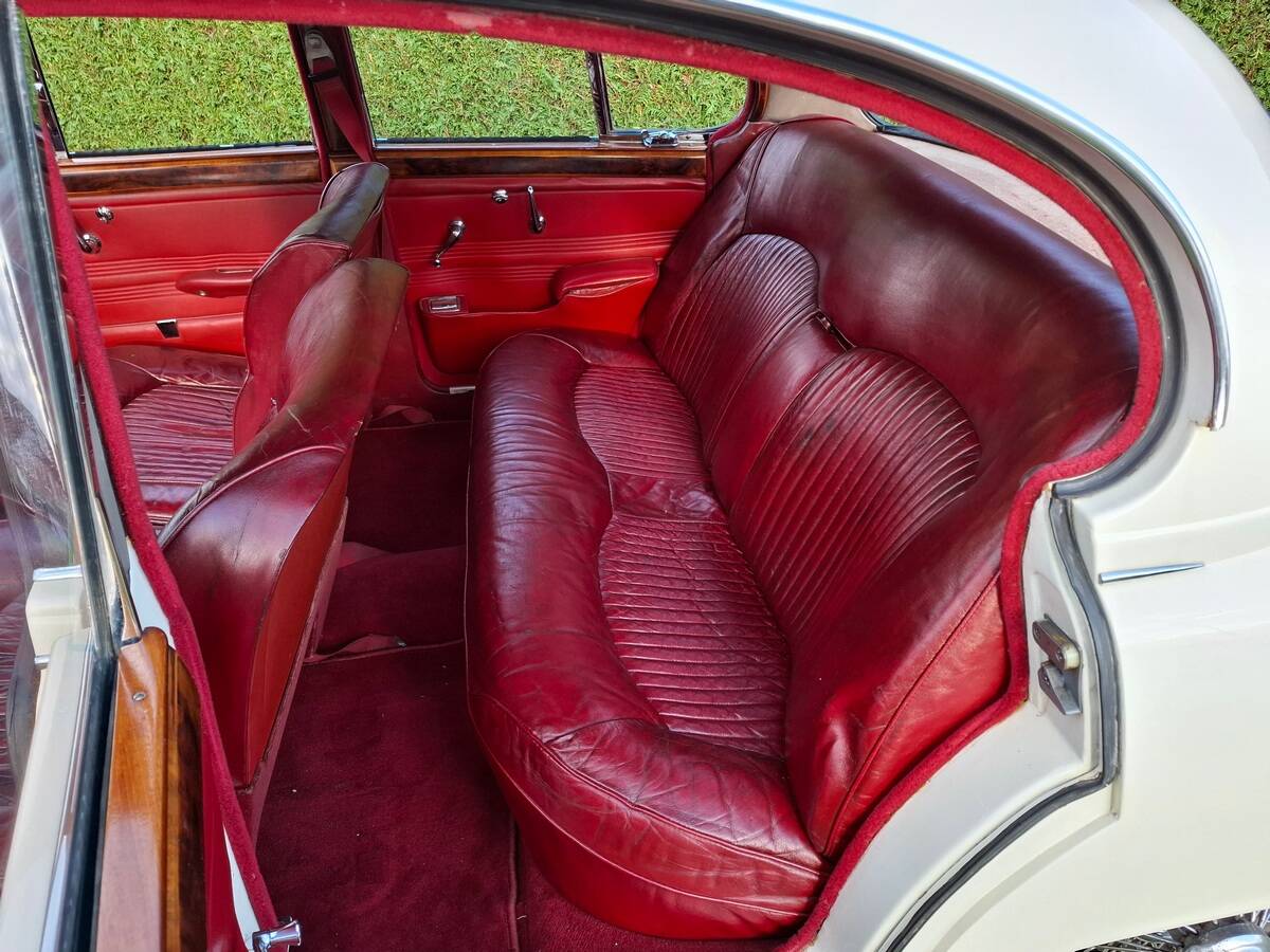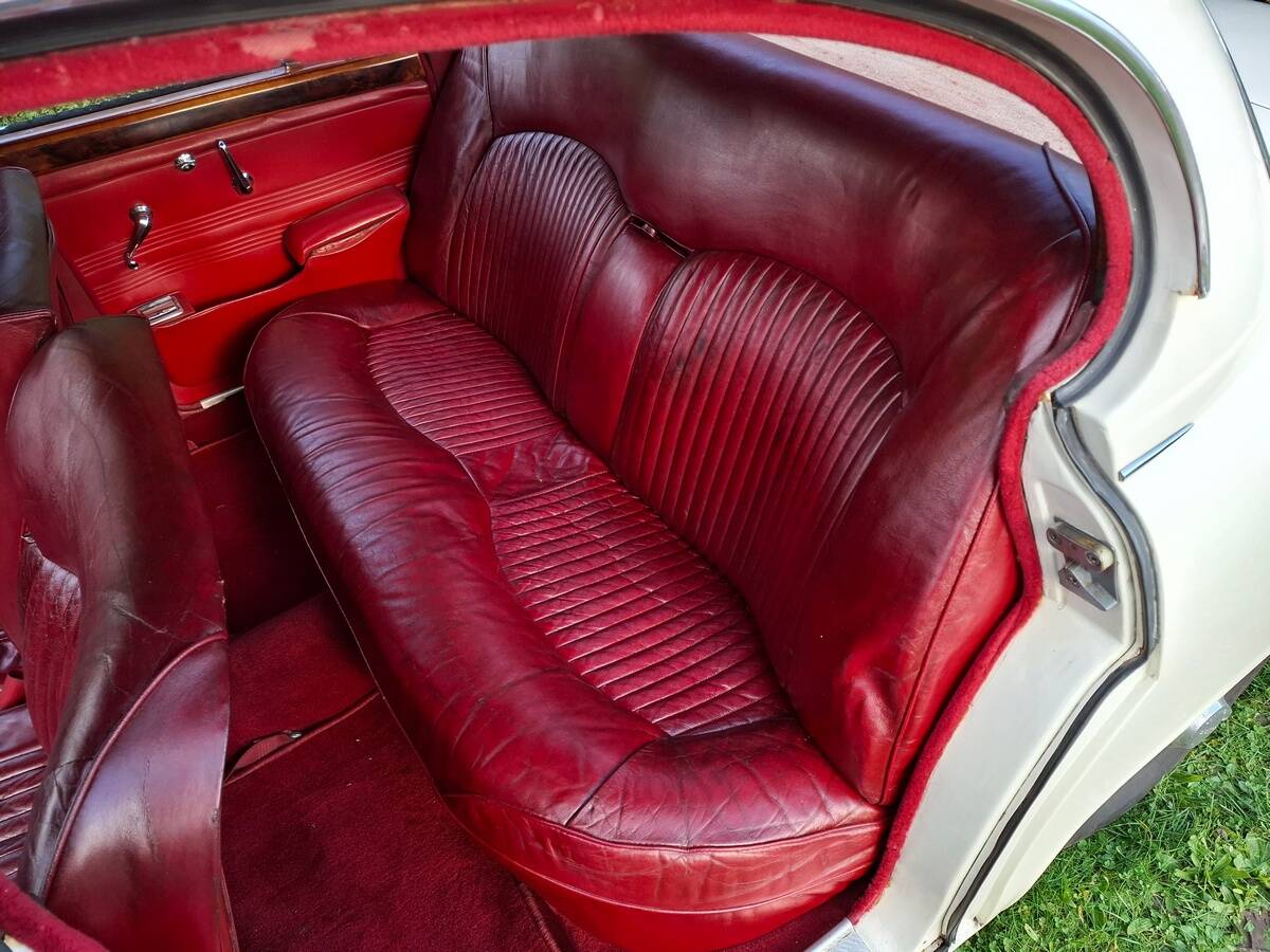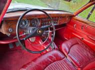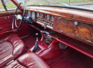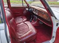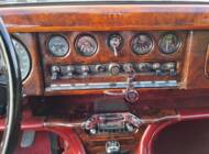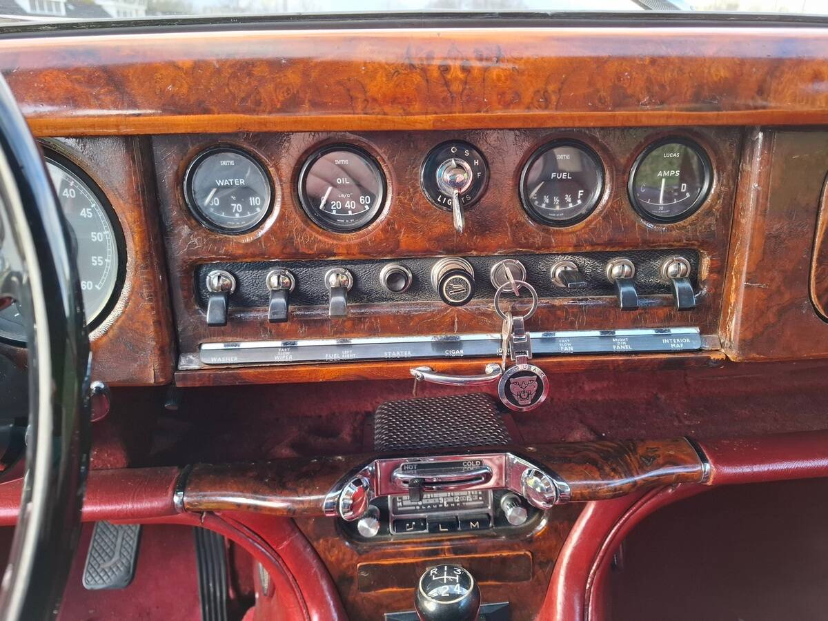 La carrosserie de cette Jaguar S est peinte en Old English White. L'intérieur, bien sûr, est orné de magnifiques boiseries en ronce de noyer, notamment sur le tableau de bord. Les sièges sont revêtus de cuir rouge sang de bœuf.