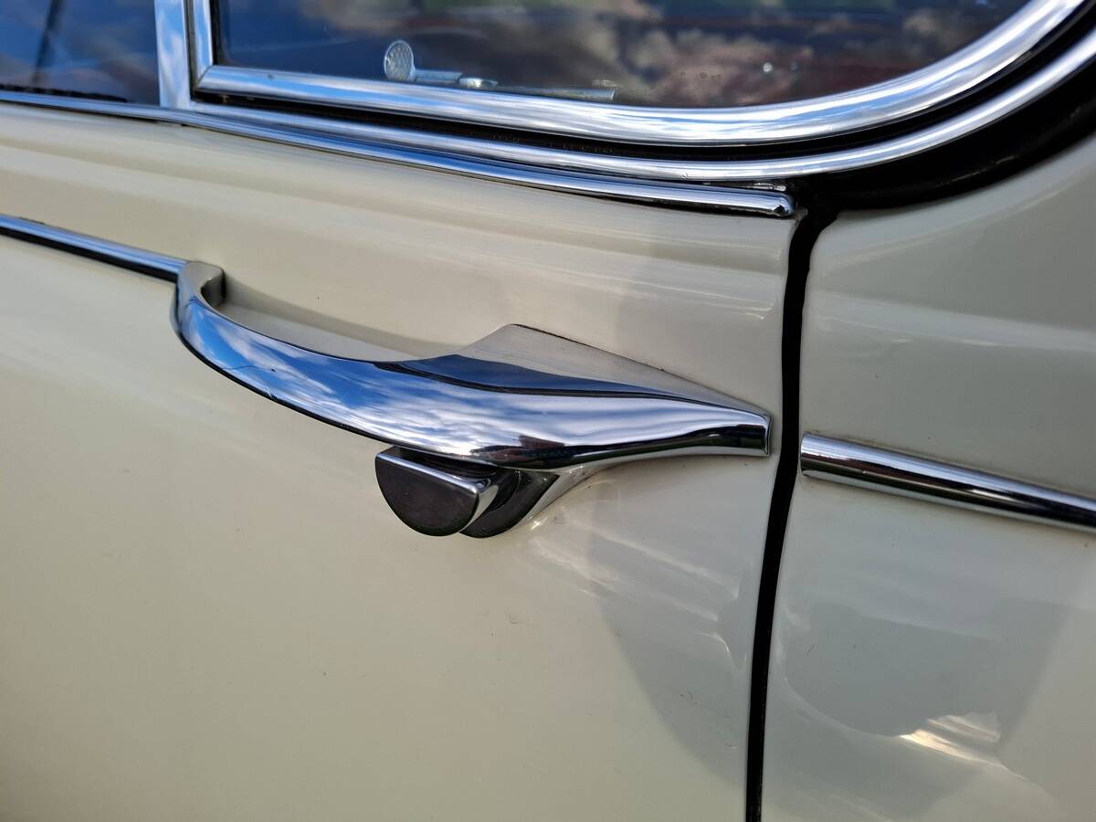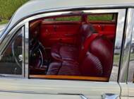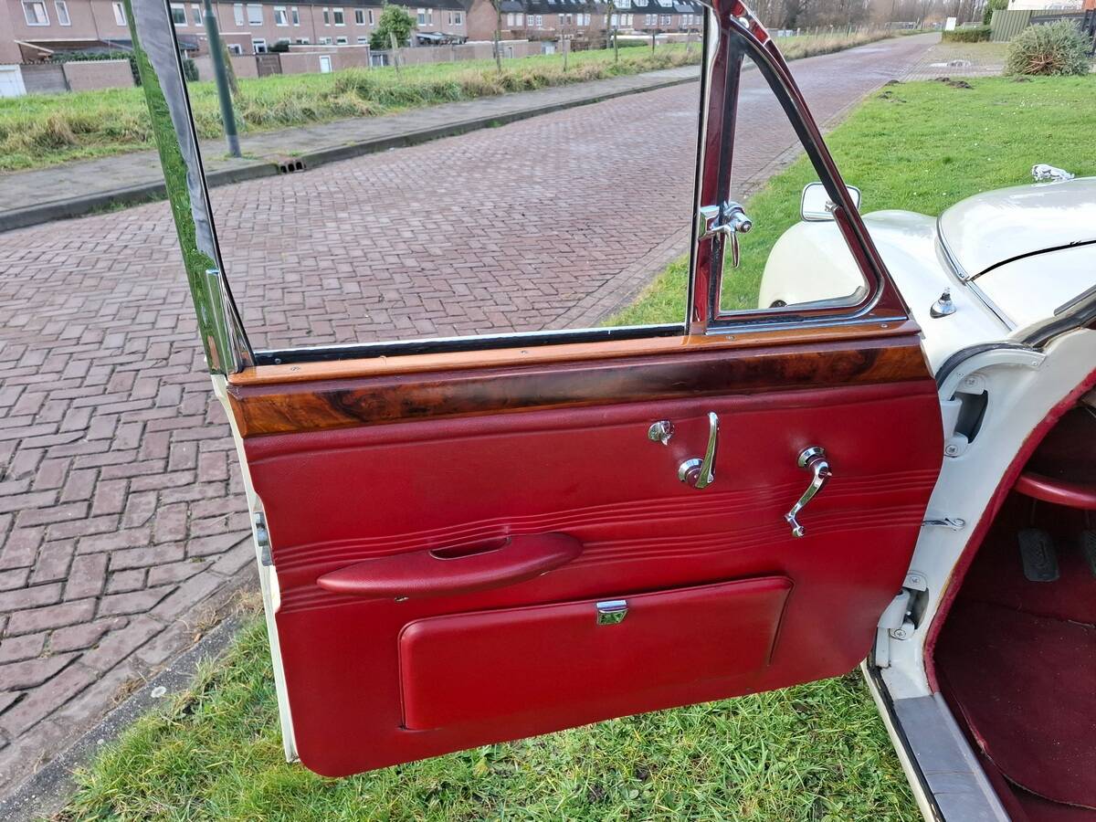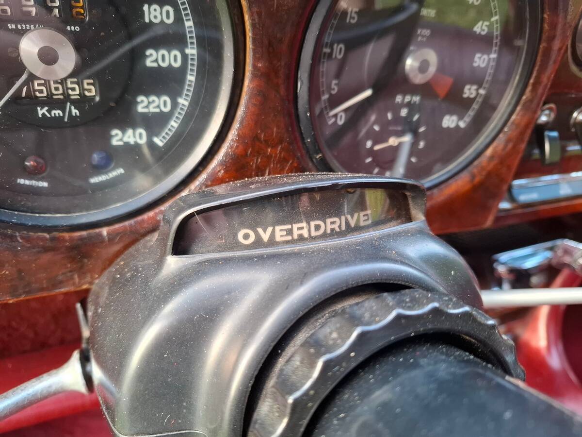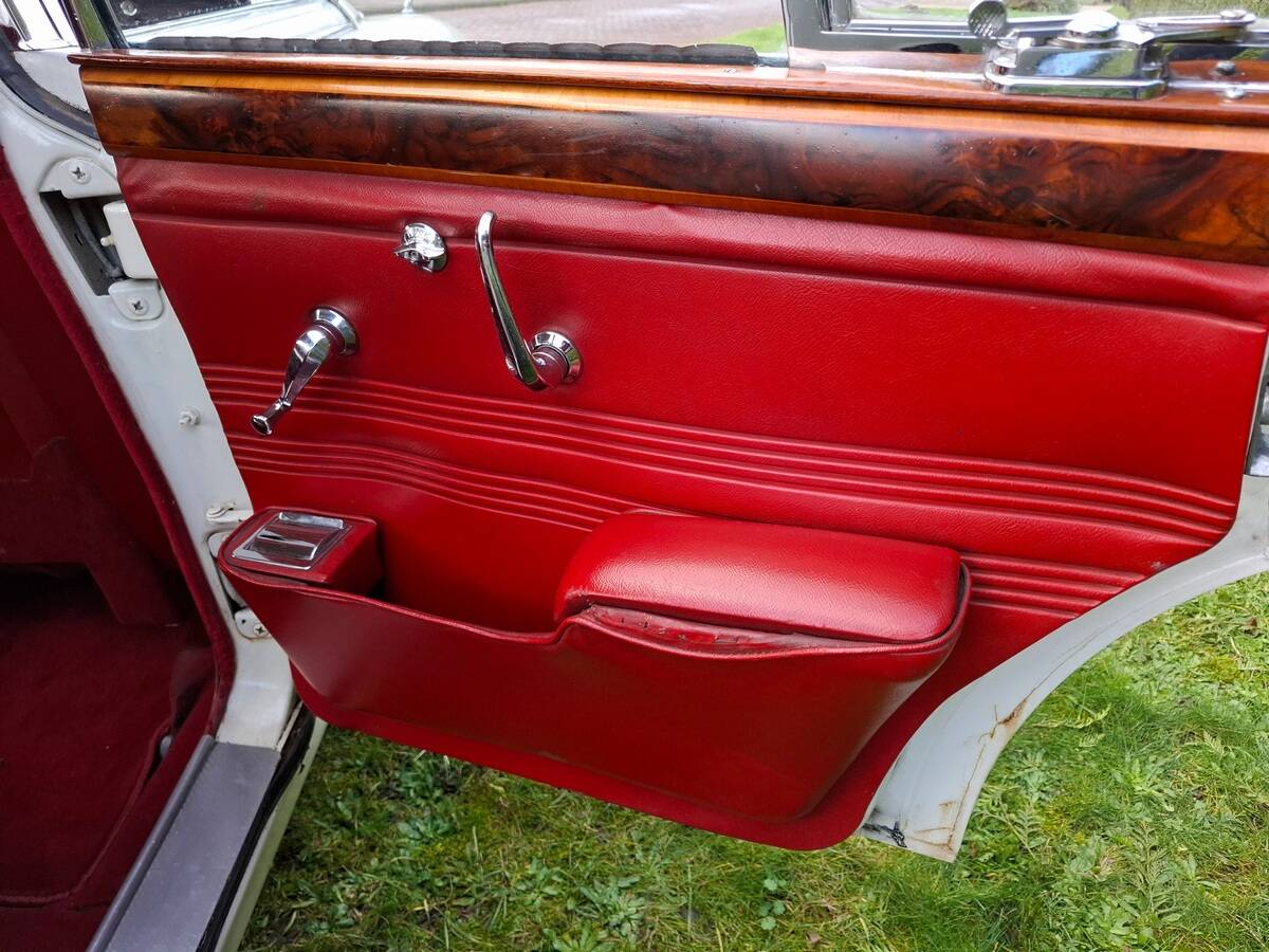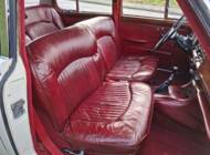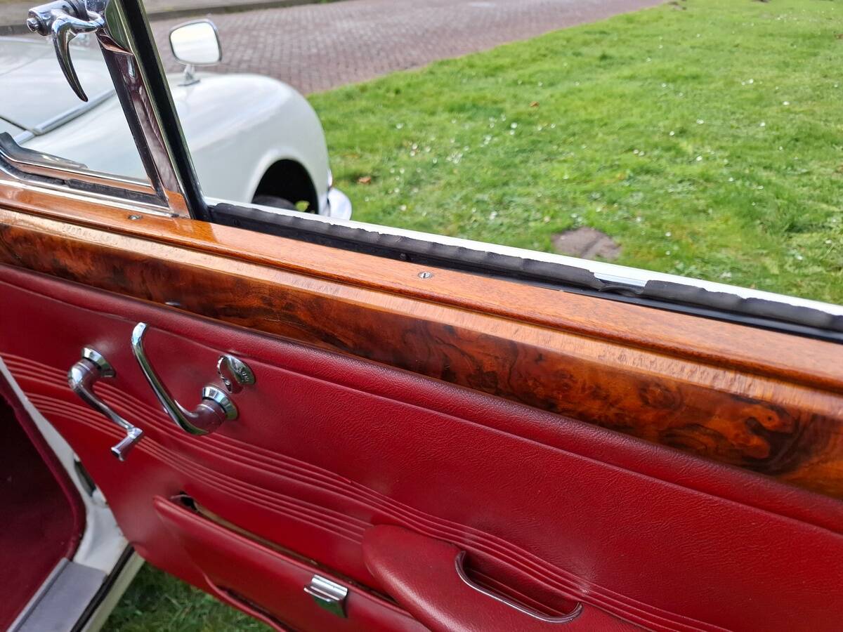 La carrosserie de cette Jaguar S est peinte en Old English White. L'intérieur, bien sûr, est orné de magnifiques boiseries en ronce de noyer, notamment sur le tableau de bord. Les sièges sont revêtus de cuir rouge sang de bœuf.